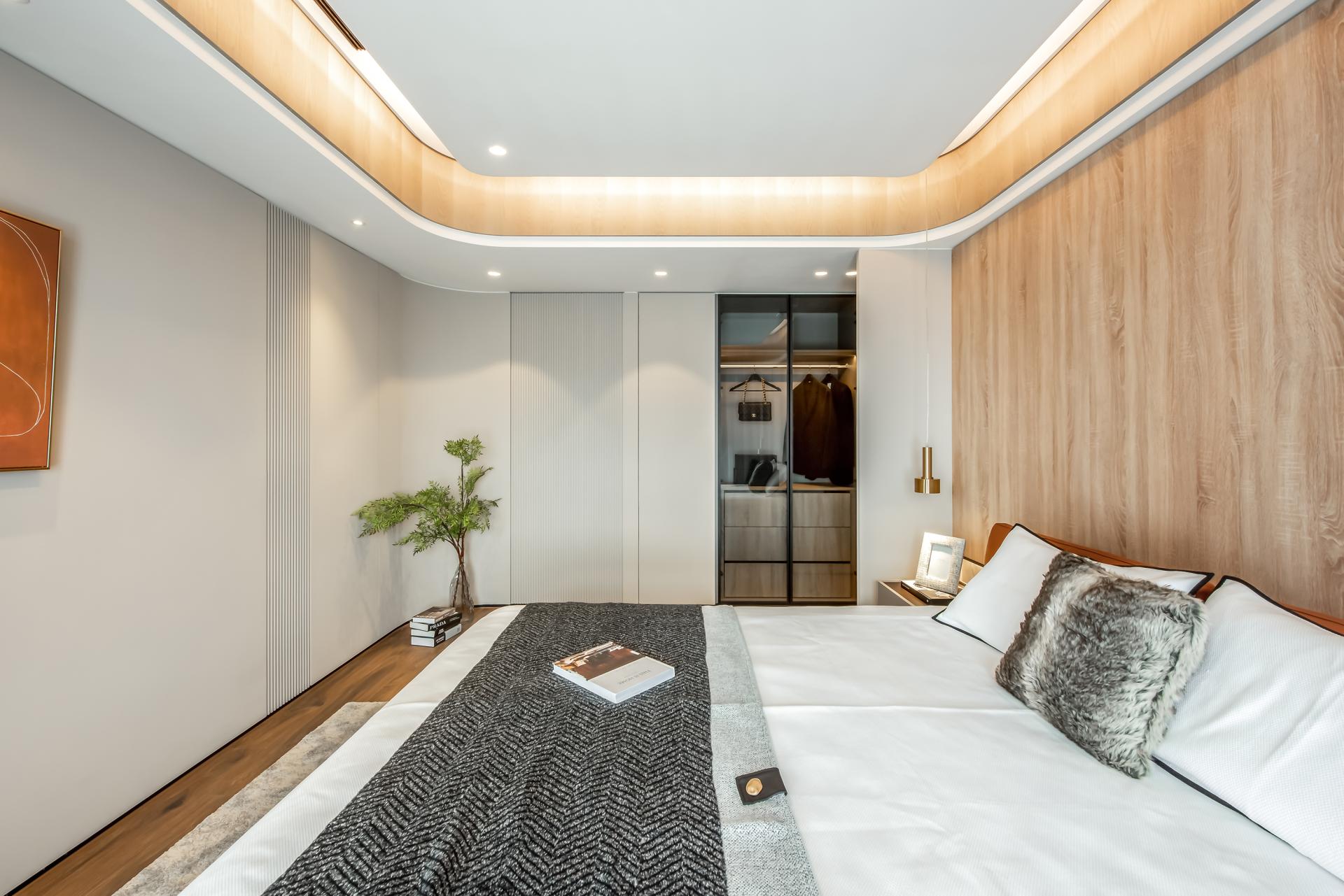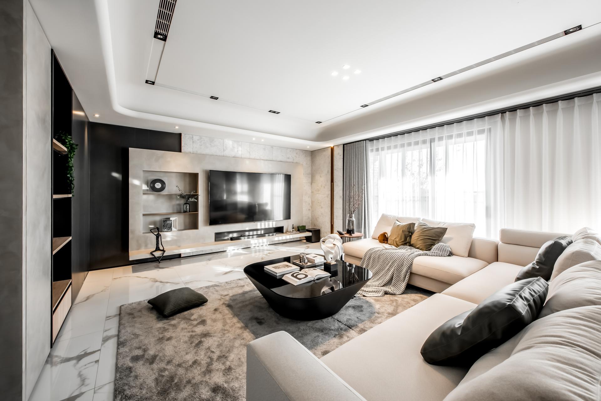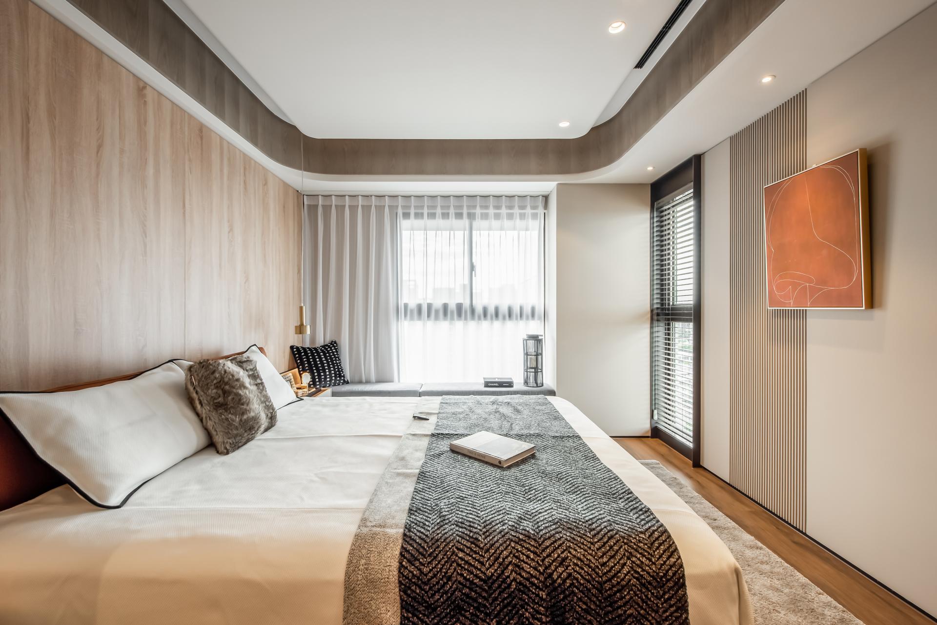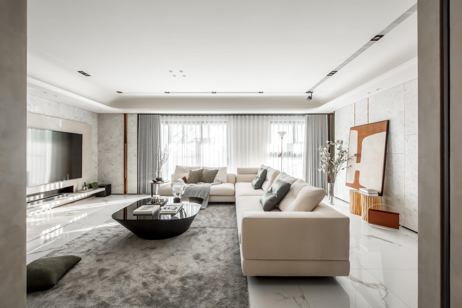 Monochromatic black, white, and gray palettes permeate the project and narrate the homeowner’s preference for a calm, understated aesthetic. The living room floors are uniformly clad in gray and white stone-patterned tiles, while the double-layered TV wall features beige decorative paint on the upper slab and terrazzo below. The dark cabinetry with wood-toned open shelves echoes the black coffee table featuring an inverted trapezoidal shape and the beige sofa in between, creating a warm and inviting living space. Moreover, subtle titanium-plated metal elements eliminate any sense of monotony. As the heart of the home, the dining area enhances affection converge. The work team had embellished the ceiling with natural wood veneers that harmonized with the stone tabletop and performed a contrast of warmth and coolness, cultivating a cozy and brilliant ambiance.