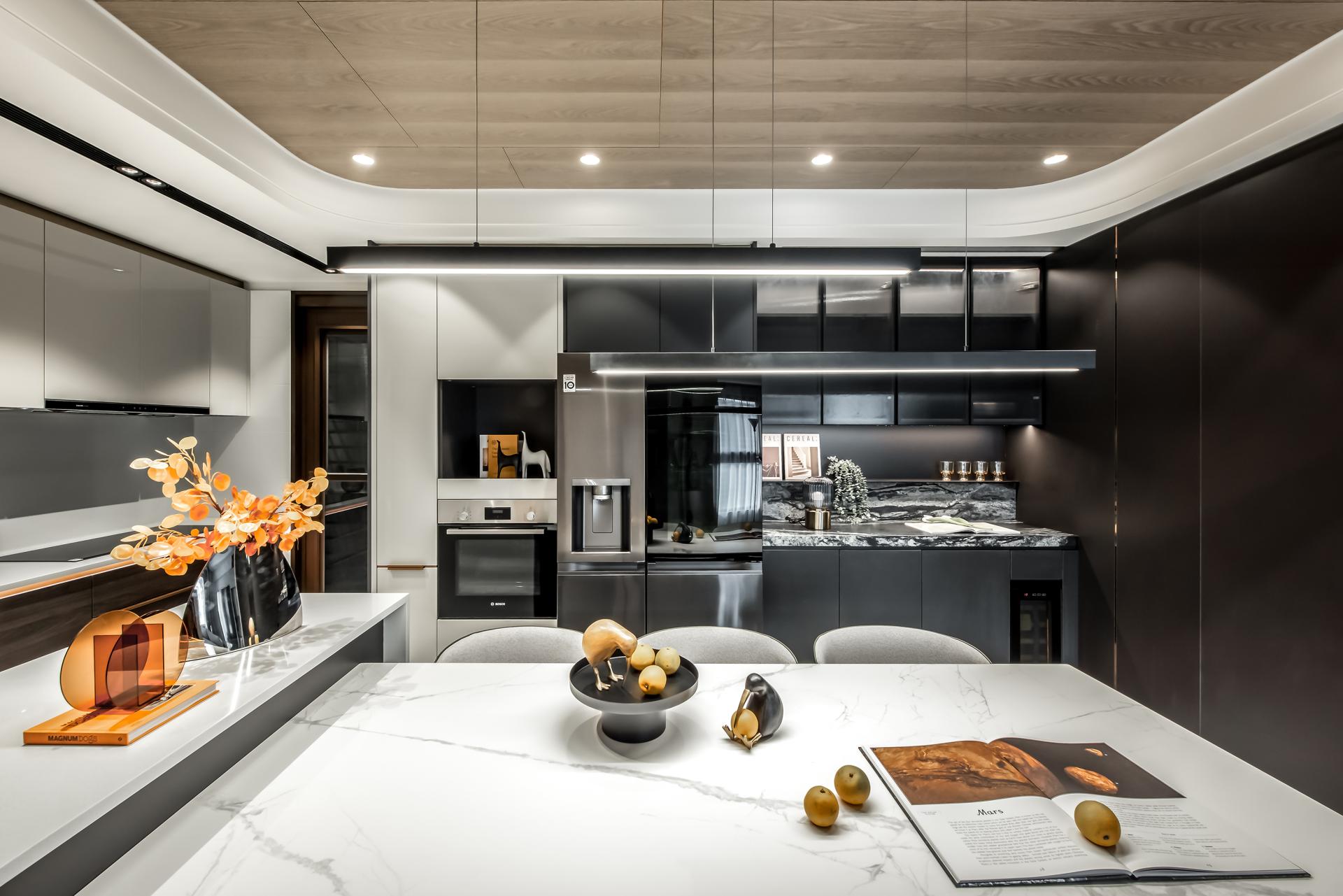 Black and white intertwine while curved lines flow fluidly. It seems like an unfolding contemporary ink painting where simplicity refines complexity. Light and shadow weave together, and the solidity and hollowness coalesce. Subtle titanium accents evoke the delicate gilding of ancient bookbinding that is understated yet undeniably elegant. The organic texture of unembellished and poised terrazzo embodies the profound essence of Eastern aesthetics, reinterpreted in a modern context. As space evolves in harmony with life, it mirrors the traditional wisdom of adapting form to function as a contemporary interpretation of timeless philosophy. In this ever-interacting dialogue, home becomes a narrative of enduring resonance.