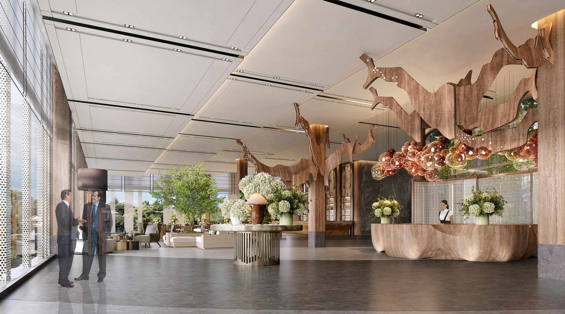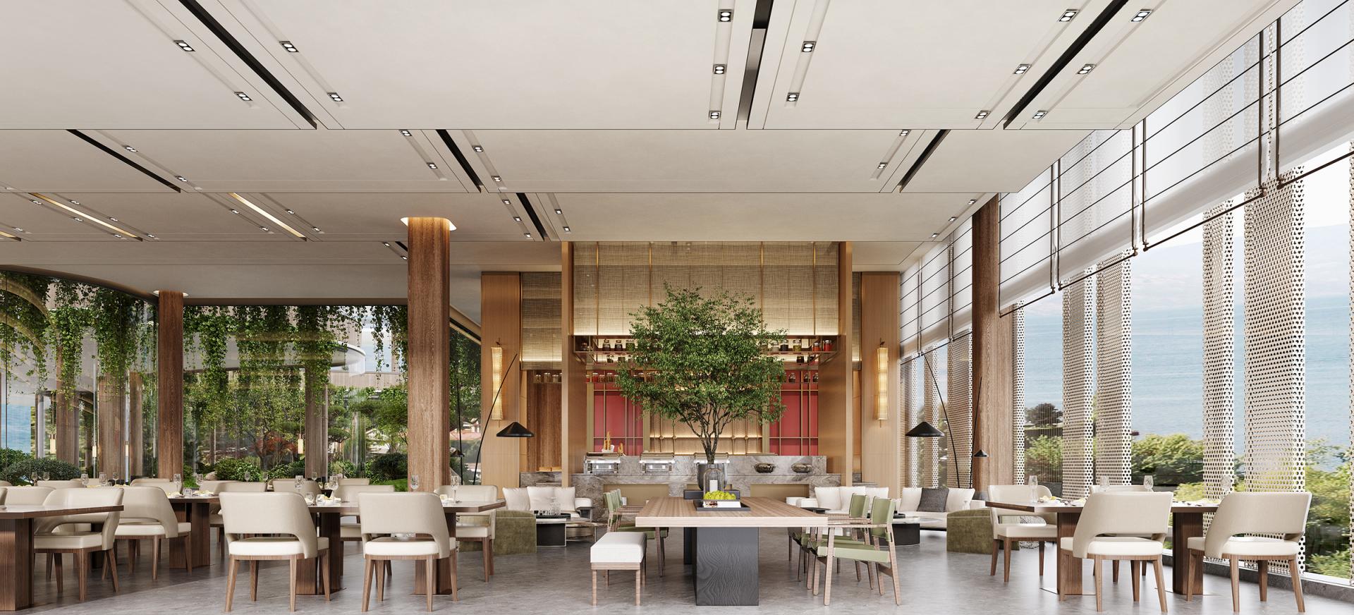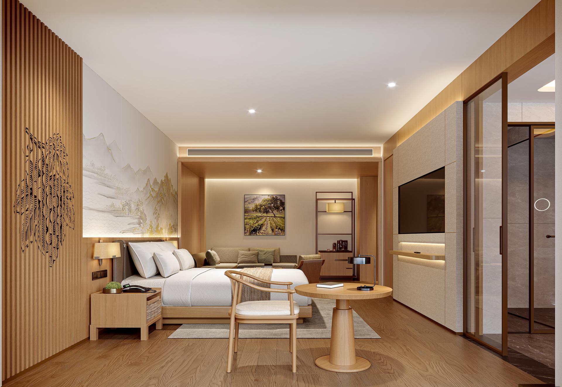 The Huayu Hotel in Quzhou, Zhejiang is rooted in Hunan Town, Qujiang District. It is located in the hinterland of the Wuxi River Wetland Park, surrounded by the Xianxia Mountains. The Wuxi River flows through, enjoying the beautiful natural landscape and abundant ecological resources. The design closely follows the concept of "natural coexistence, modern living", deeply integrating the natural advantages of the surrounding area with modern comfortable experience, meeting the contemporary travelers' pursuit of comfort, convenience, and beauty, making the hotel both rich in regional characteristics and modern fashion sense. In terms of spatial design, the lobby features a combination of marble flooring, warm beige walls, wooden sofas, and stainless steel lines, showcasing a grand and exquisite atmosphere. The guest rooms are designed to be warm and comfortable, with separate wet and dry bathrooms. The combination of stone and stainless steel hardware ensures practicality and fashion. The restaurant creates a natural and rustic dining atmosphere with cultural stone walls, wooden ceilings, and distinctive chandeliers. The public areas rely on latex paint, stainless steel lines, and wooden decorations to create a simple and bright passage space, matched with decorative paintings and green plants, cleverly introducing outdoor natural elements, adding artistic atmosphere and vitality.