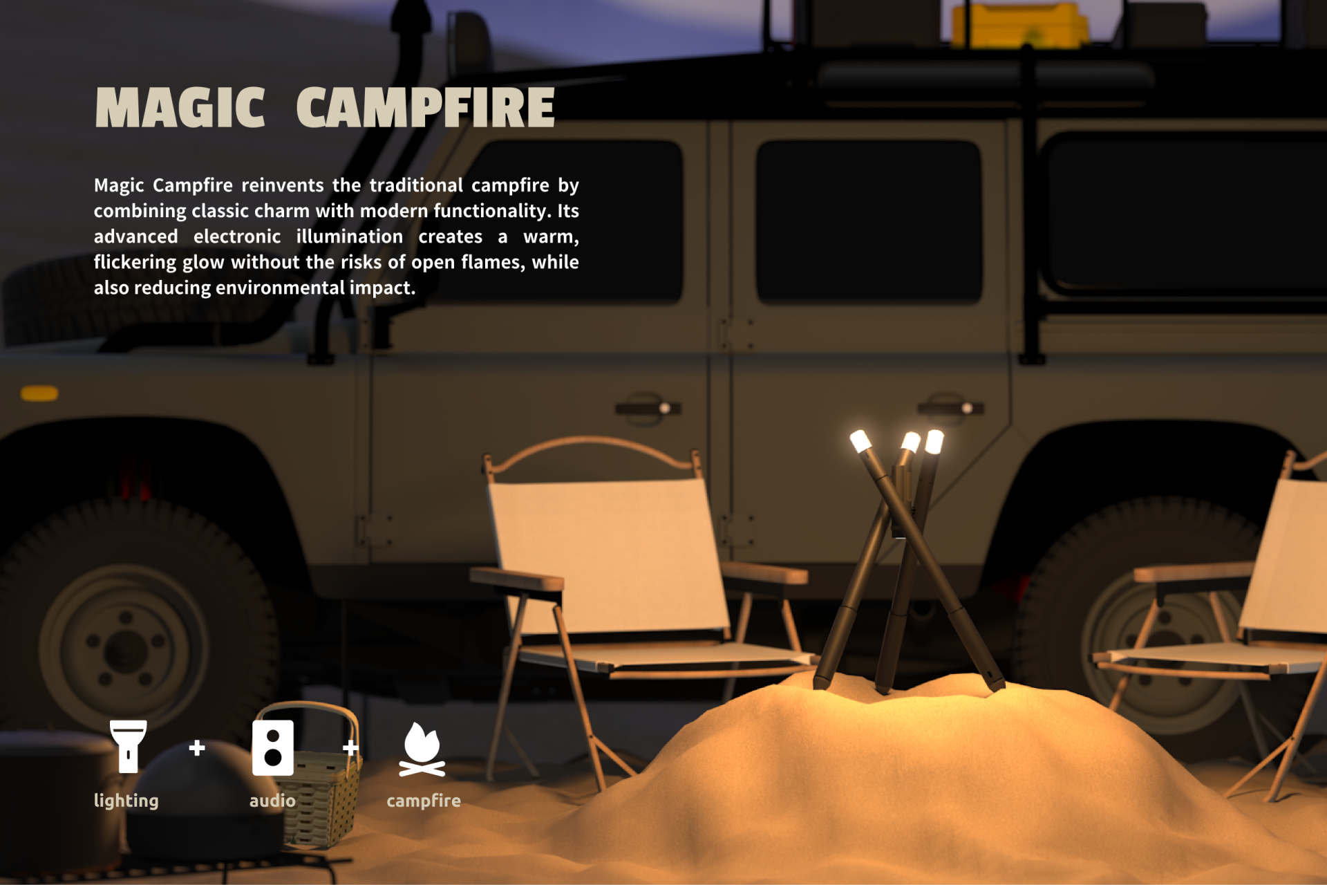 Magic Campfire reinvents the traditional campfire by combining classic charm with modern functionality. Its advanced electronic illumination creates a warm, flickering glow without the risks of open flames, while also reducing environmental impact.