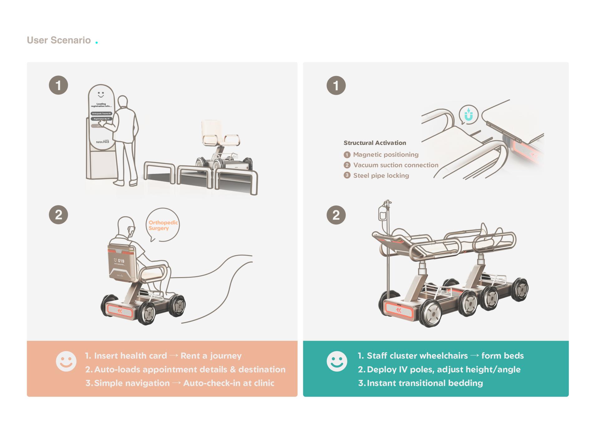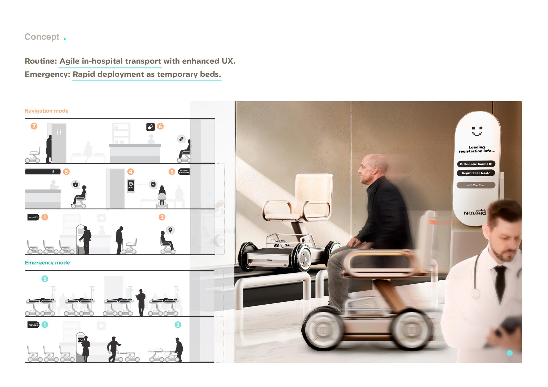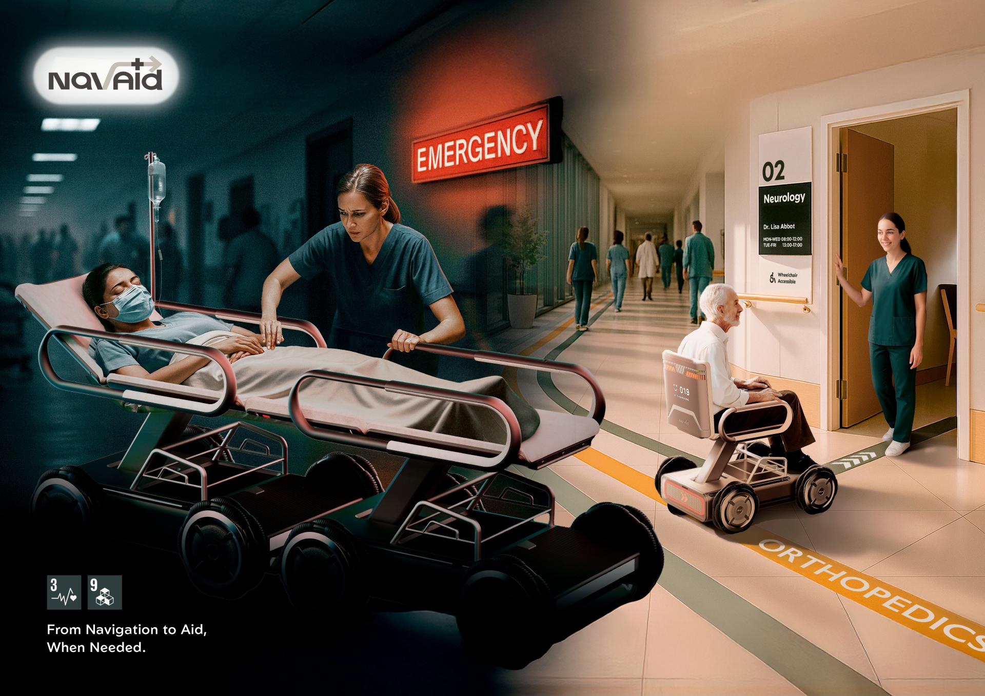 NavAid is not just a wheelchair—it's a mobile healthcare solution for hospitals. In everyday use, it facilitates agile patient rounds, enhancing mobility and overall patient experience. In emergencies, it can be swiftly reconfigured into a hospital bed, easing patient burden and improving the efficiency of medical responses.