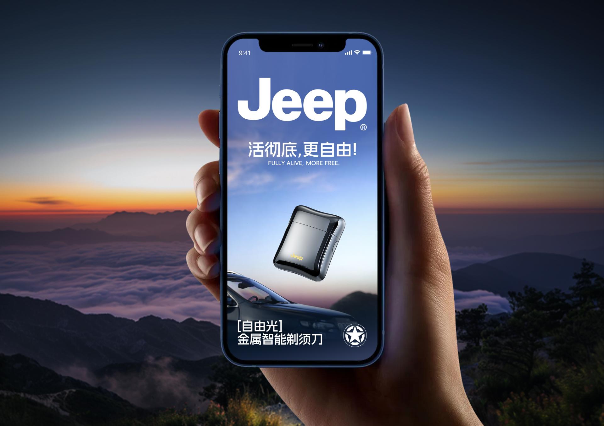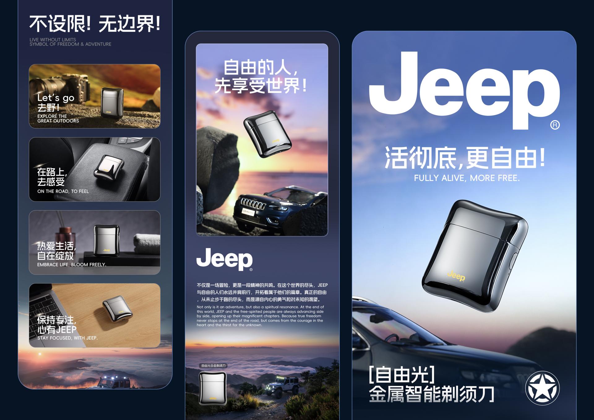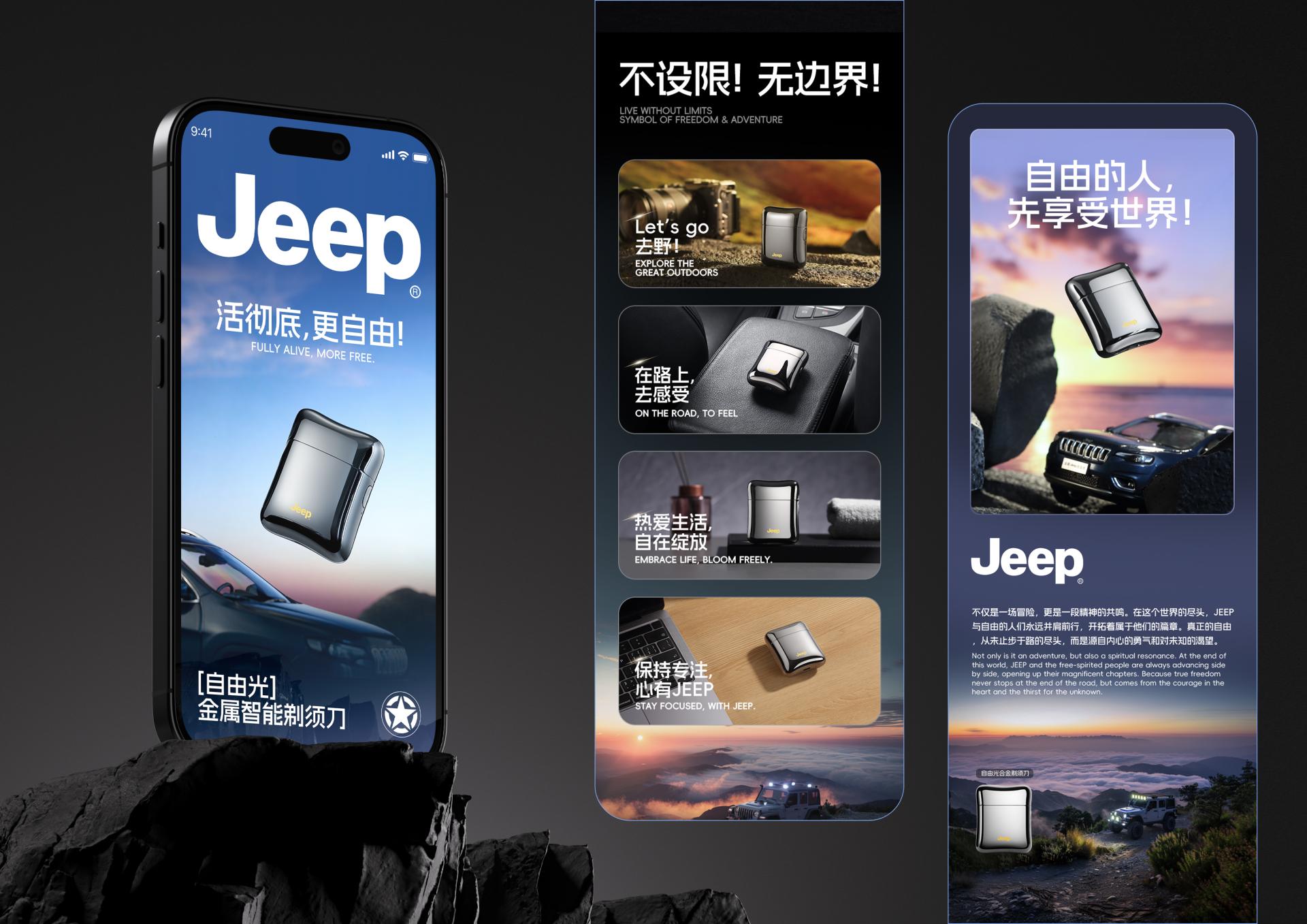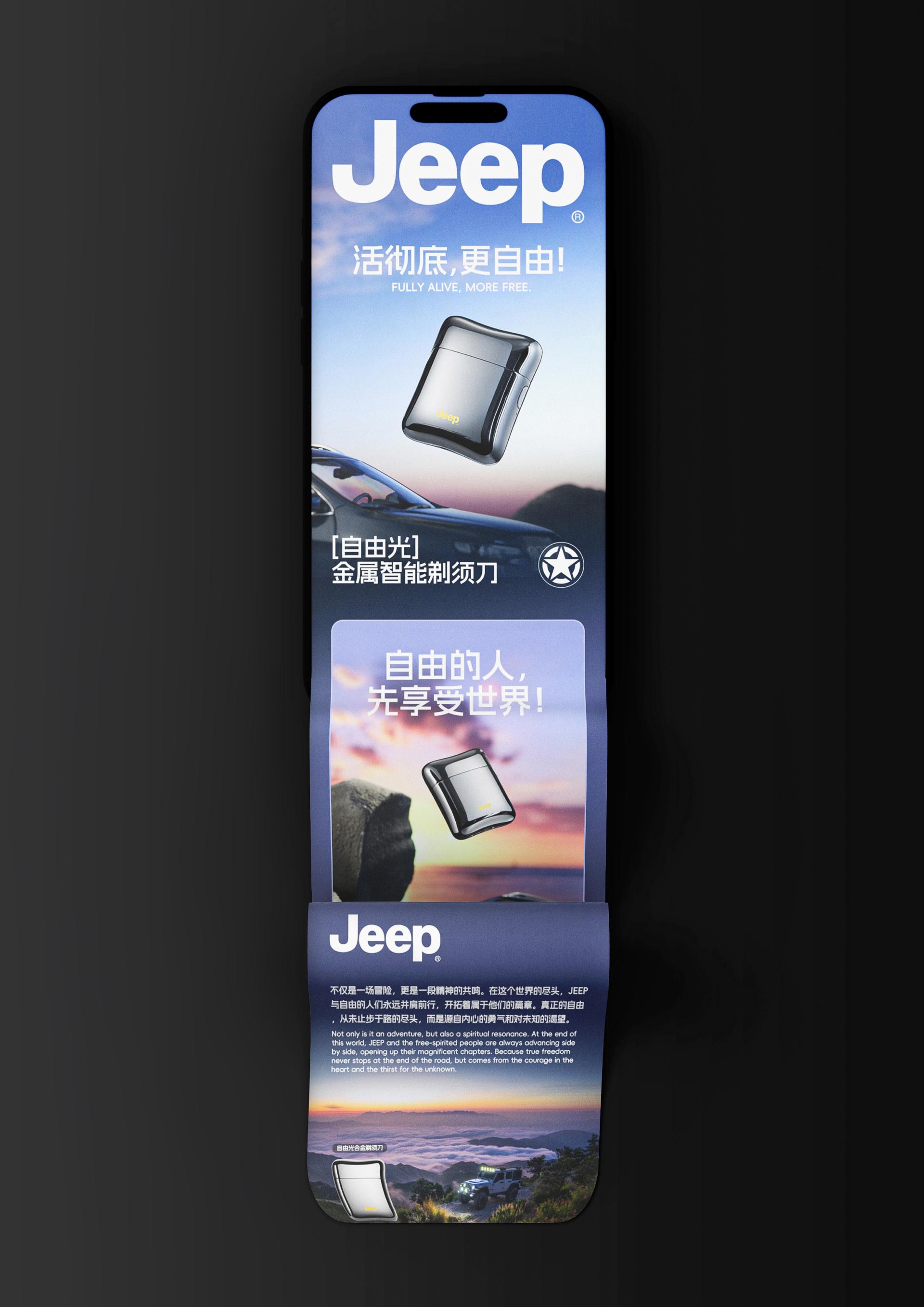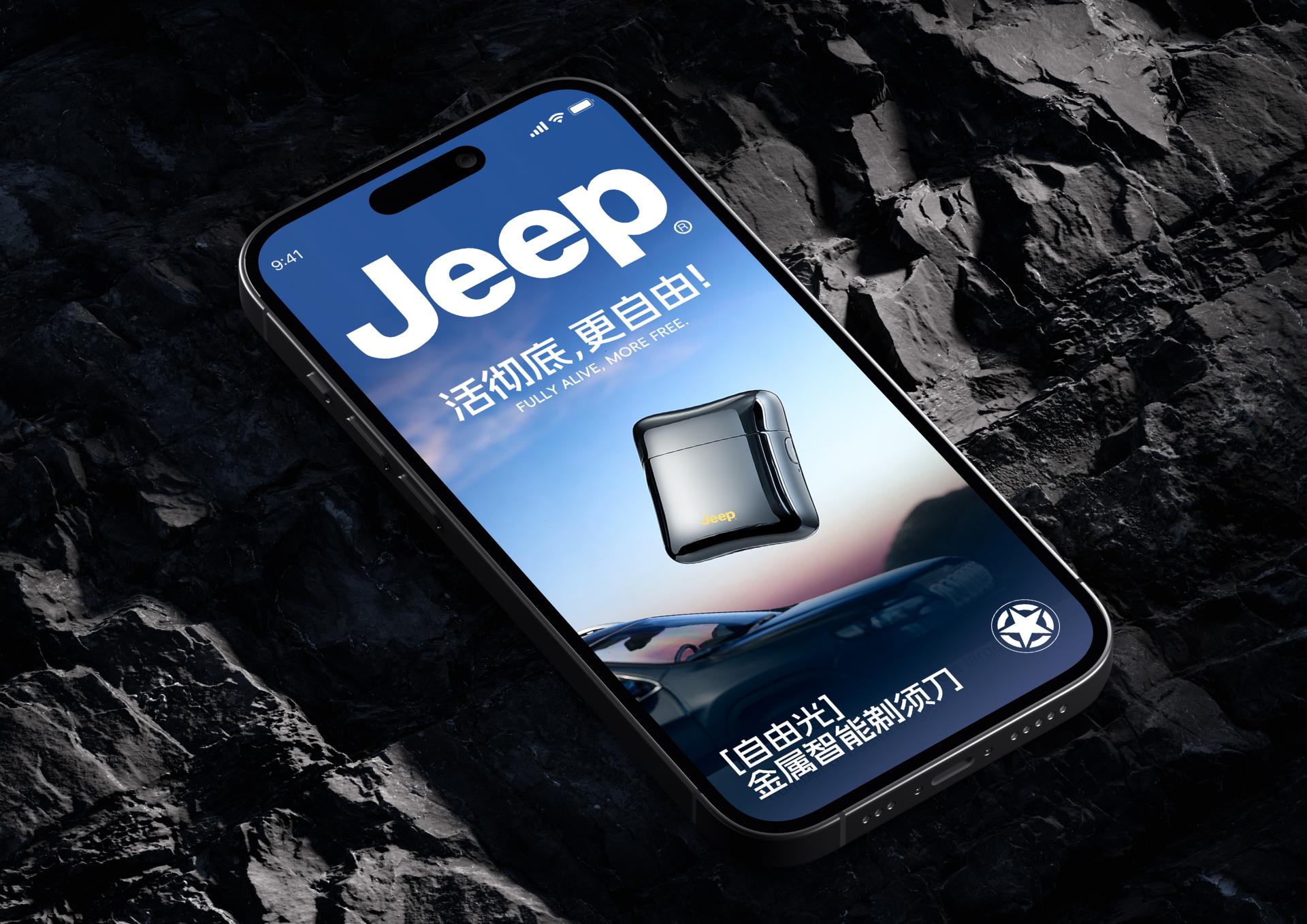 The typography is meticulously chosen to reflect both strength and modernity, perfectly matching Jeep’s rugged yet refined image. This choice not only emphasizes the industrial quality of the razor but also ensures a clean, intuitive visual experience that resonates with users.