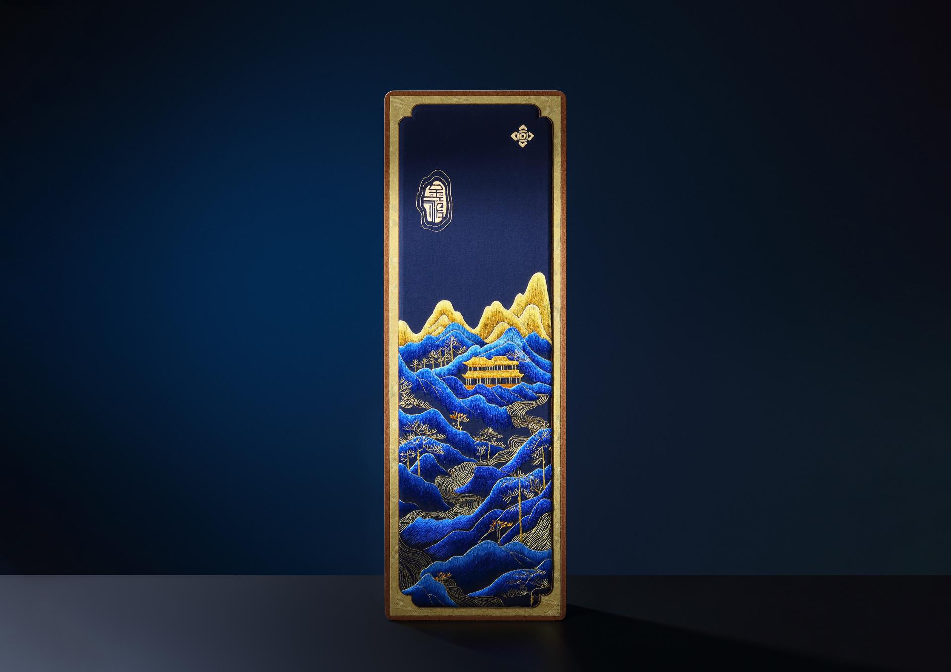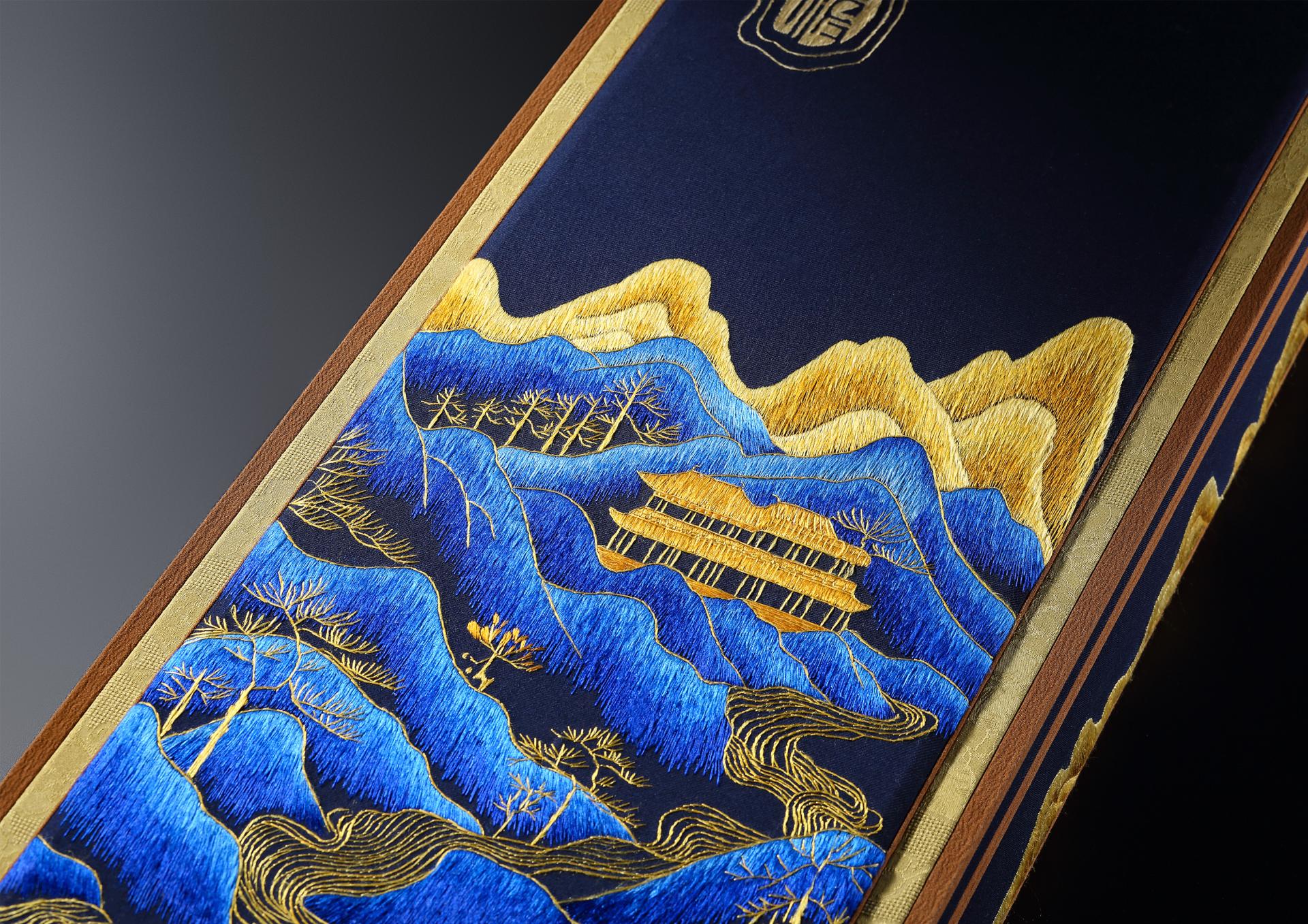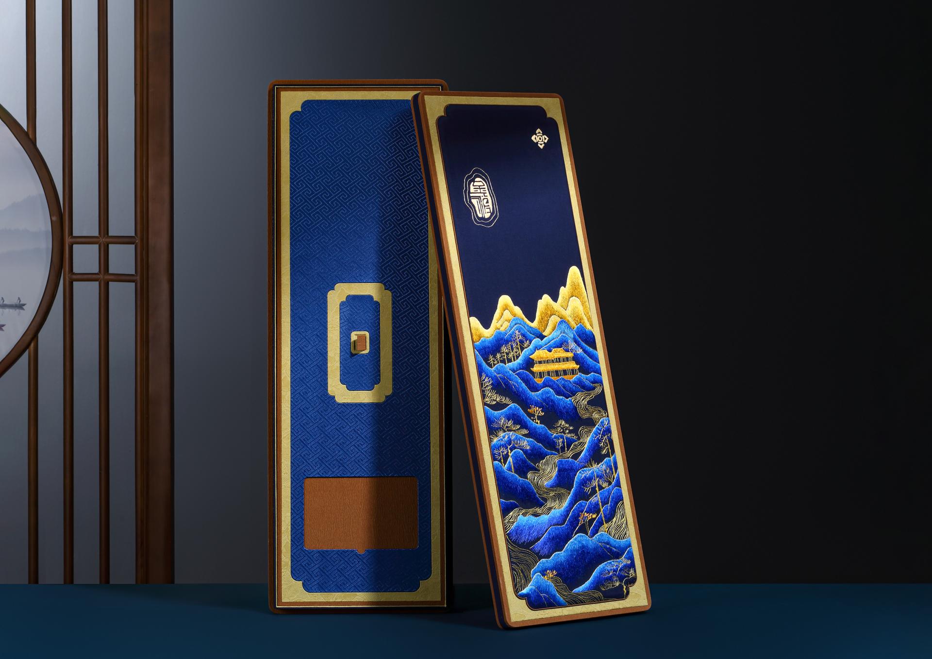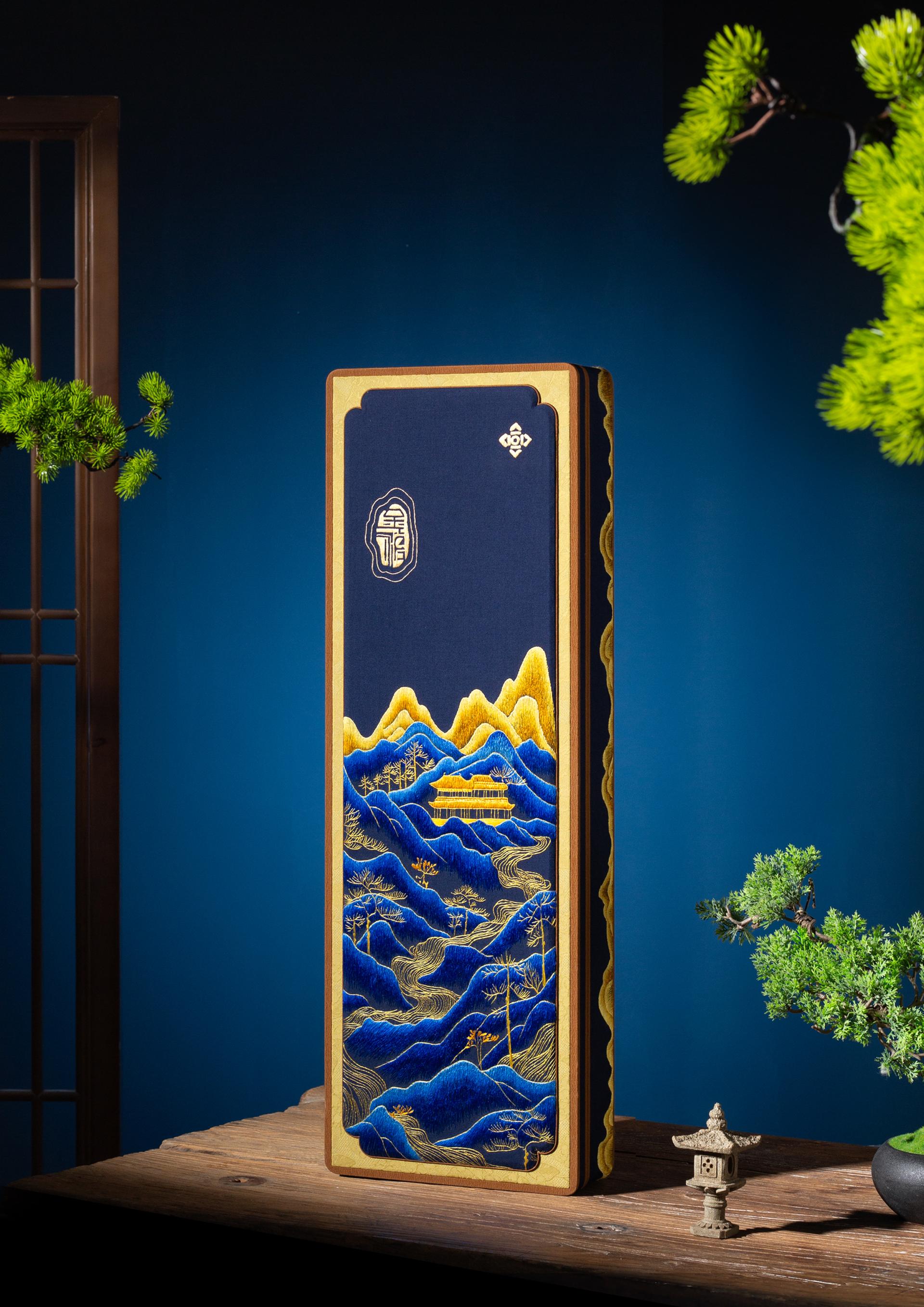 The design uses the Changbai Mountains as its backdrop, with undulating mountain silhouettes that emphasize the raw beauty of nature while symbolizing the resilience and strength of ginseng. Blue-toned mountain ranges feature cascading waterfalls, whose lines resemble ginseng roots, naturally connecting the two elements and infusing the packaging with vitality. Towering Changbai pines stand as natural sentinels, their robust forms symbolizing both the ginseng's potency and traditional associations with health and longevity. The inclusion of Fusong County's historic pavilion adds cultural resonance, gracefully bridging human heritage with untamed nature. The design's craftsmanship showcases masterful Su embroidery techniques, where each distinctive stitch contributes to signature intricacy and chromatic richness while elevating the overall visual harmony. The Even Stitch grounds the pavilion with architectural stability. The Layered Stitch brings the mountain motifs to life with vivid, well-defined gradients, and the Rolled Stitch elegantly captures the fluid twists and turns of cascading water.