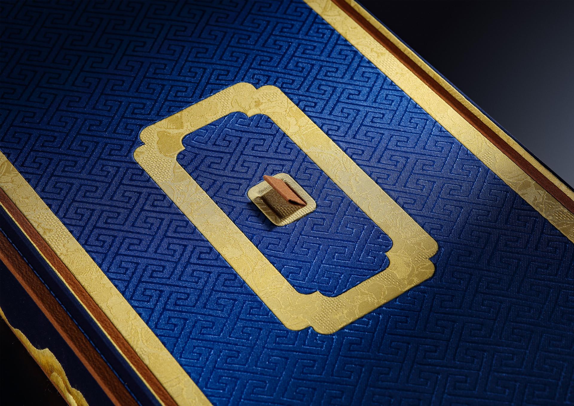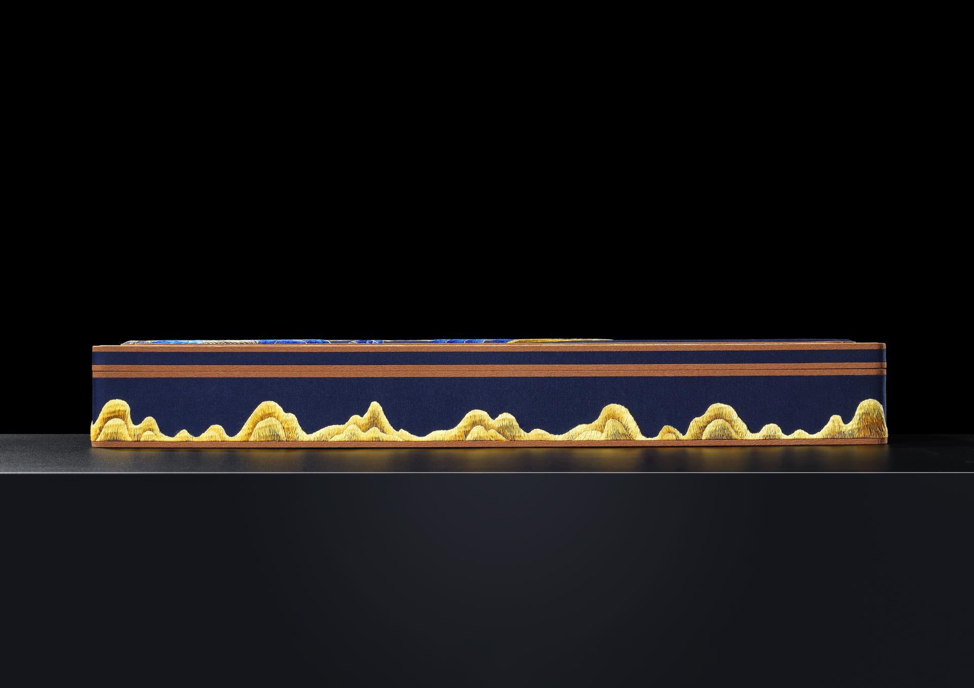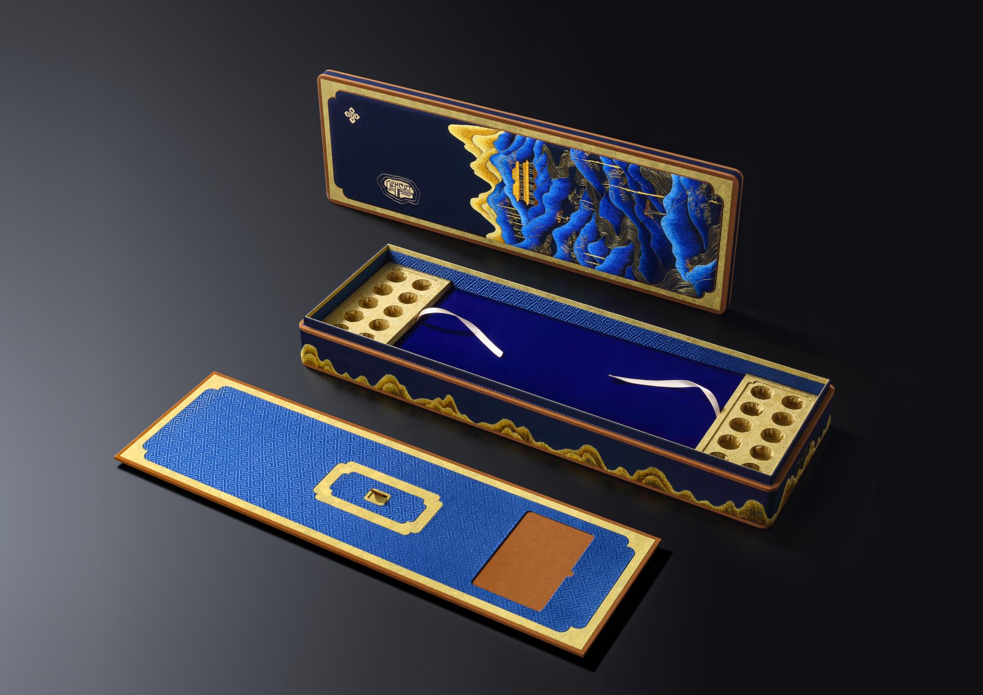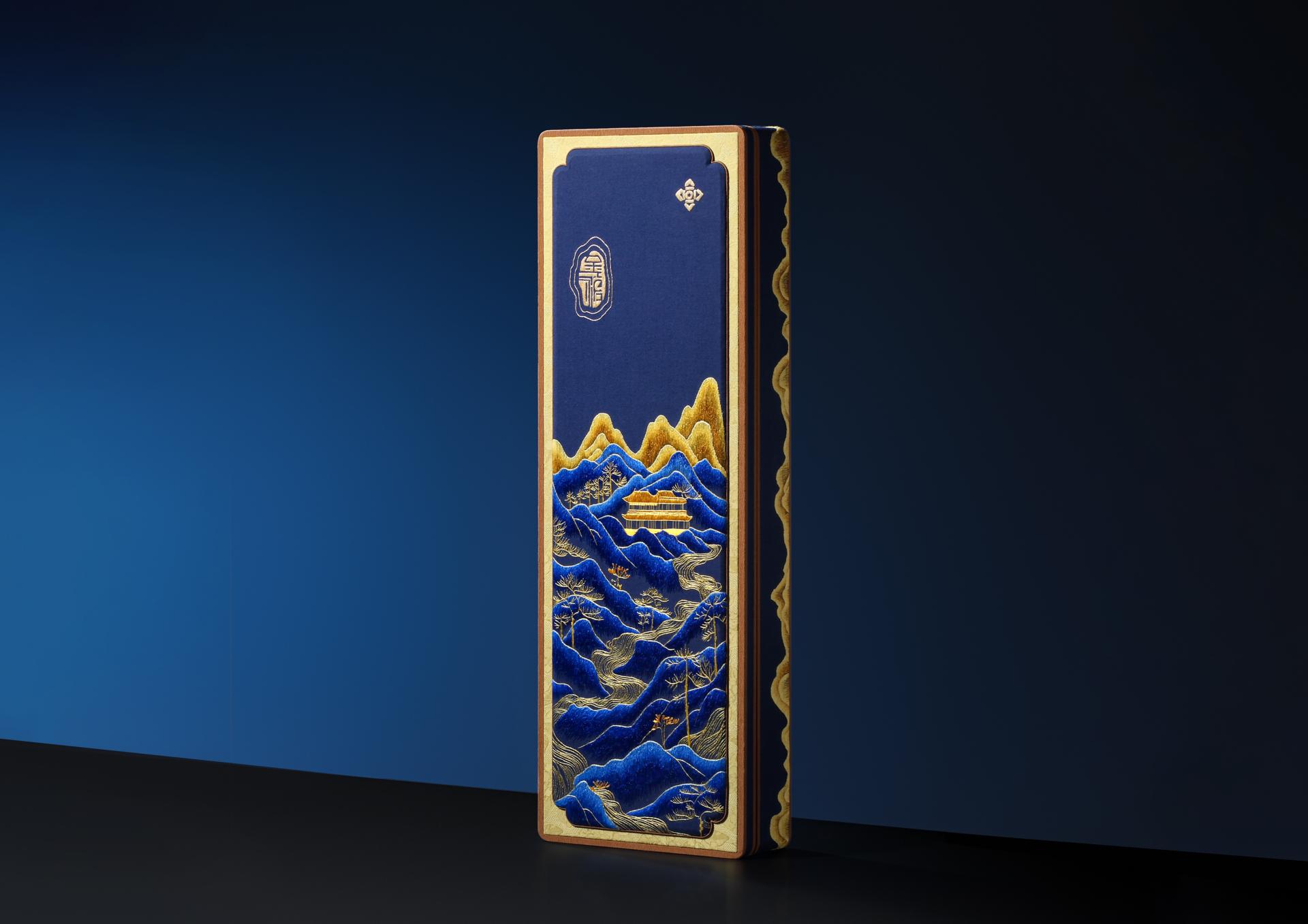 The design uses the Changbai Mountains as its backdrop, with undulating mountain silhouettes that emphasize the raw beauty of nature while symbolizing the resilience and strength of ginseng. Blue-toned mountain ranges feature cascading waterfalls, whose lines resemble ginseng roots, naturally connecting the two elements and infusing the packaging with vitality. Towering Changbai pines stand as natural sentinels, their robust forms symbolizing both the ginseng's potency and traditional associations with health and longevity. The inclusion of Fusong County's historic pavilion adds cultural resonance, gracefully bridging human heritage with untamed nature. The design's craftsmanship showcases masterful Su embroidery techniques, where each distinctive stitch contributes to signature intricacy and chromatic richness while elevating the overall visual harmony. The Even Stitch grounds the pavilion with architectural stability. The Layered Stitch brings the mountain motifs to life with vivid, well-defined gradients, and the Rolled Stitch elegantly captures the fluid twists and turns of cascading water.