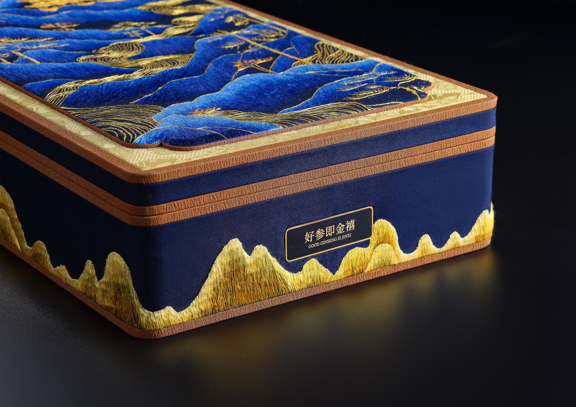 The packaging design for this premium ginseng product draws inspiration from the majestic Changbai Mountains—a pristine natural habitat renowned for cultivating the world's finest ginseng. Capturing the essence of this legendary landscape, the design artfully incorporates key regional elements including rugged mountain ranges, cascading waterfalls, enduring Changbai pines, and a traditional pavilion from Fusong County. These motifs are further complemented by exquisite Su embroidery craftsmanship to evoke elegant beauty, not only highlighting the preciousness and uniqueness of ginseng but also conveying Jinxi brand's commitment to high quality and cultural heritage.