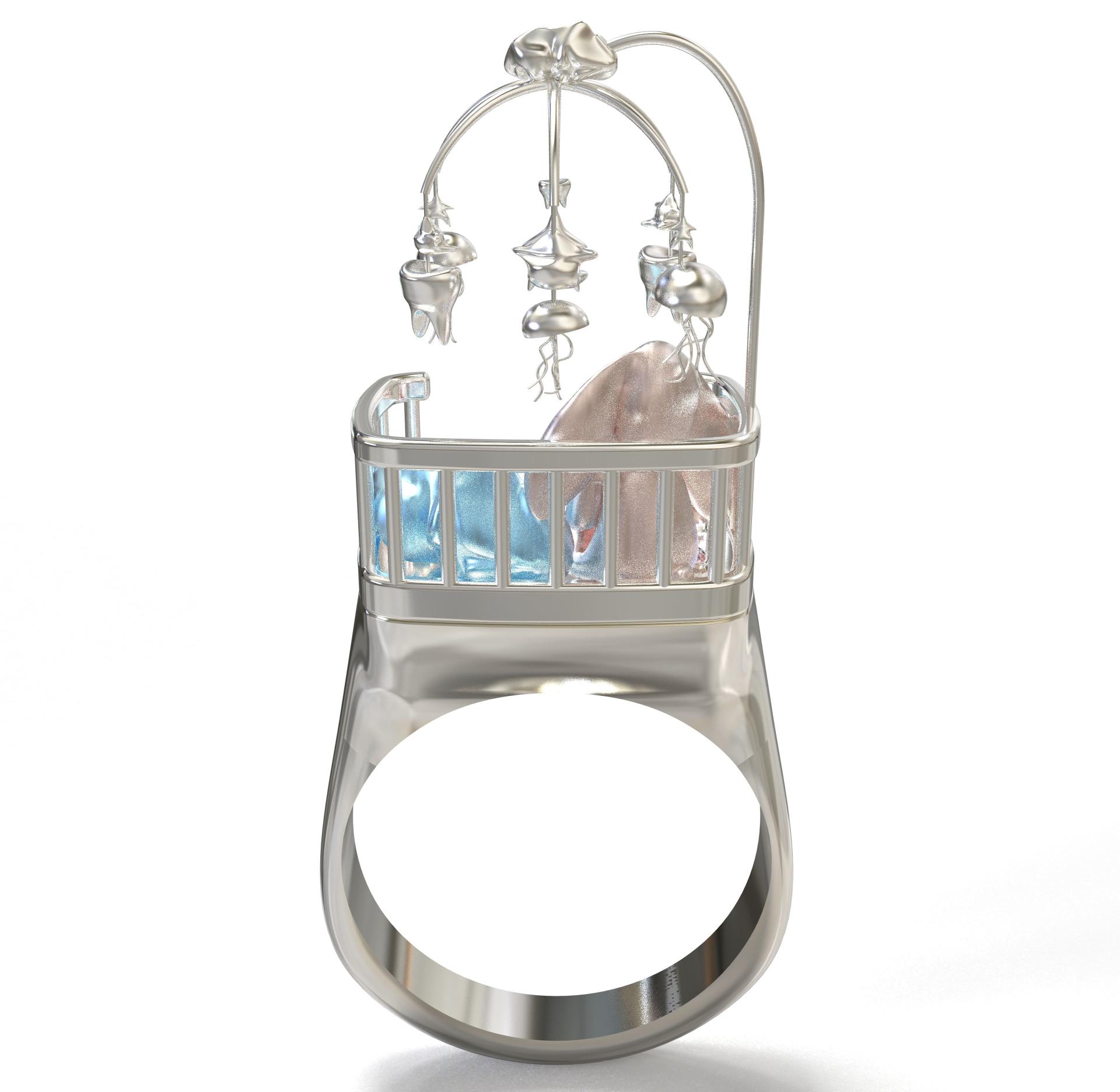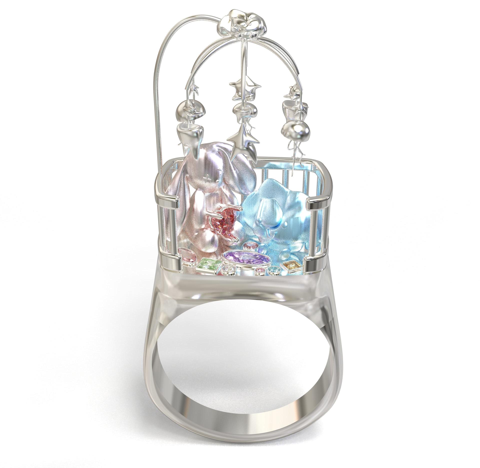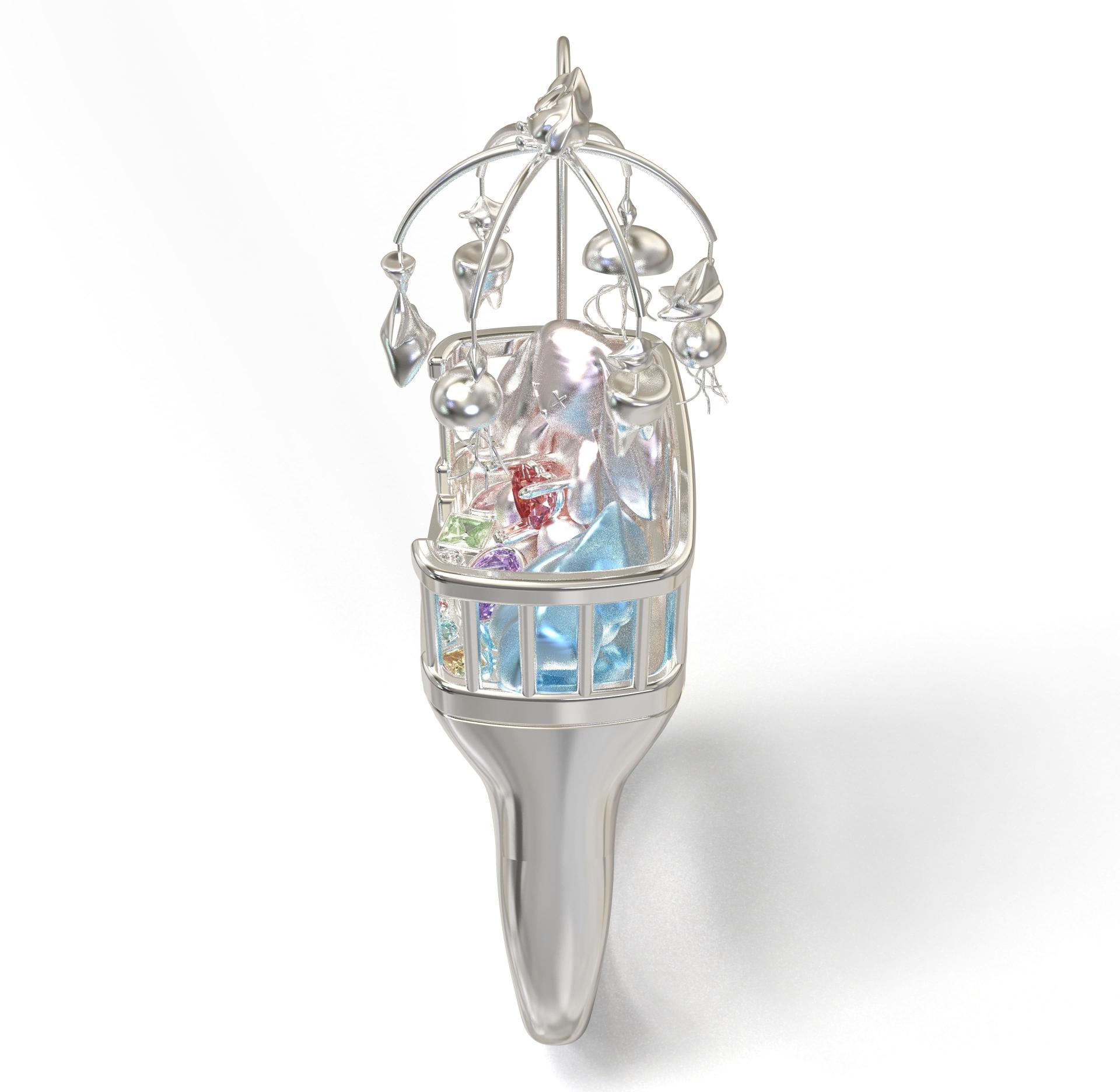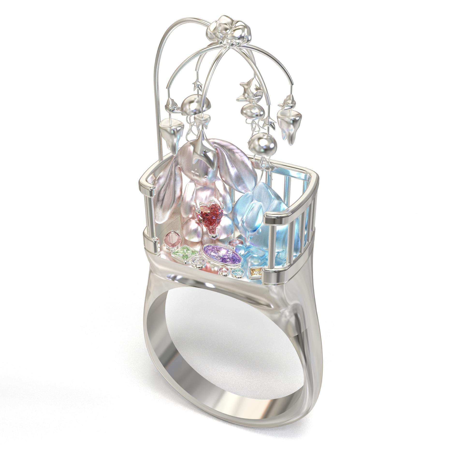 “Lullaby” is a wearable miniature dreamscape inspired by my childhood memories and the gentle warmth of bedtime rituals. The ring takes the form of a crib, adorned with playful figures and suspended star-shaped charms, evoking a sense of comfort, innocence, and protection. Colorful gemstones scattered within the cradle symbolize precious fragments of dreams—soft, surreal, and safe.