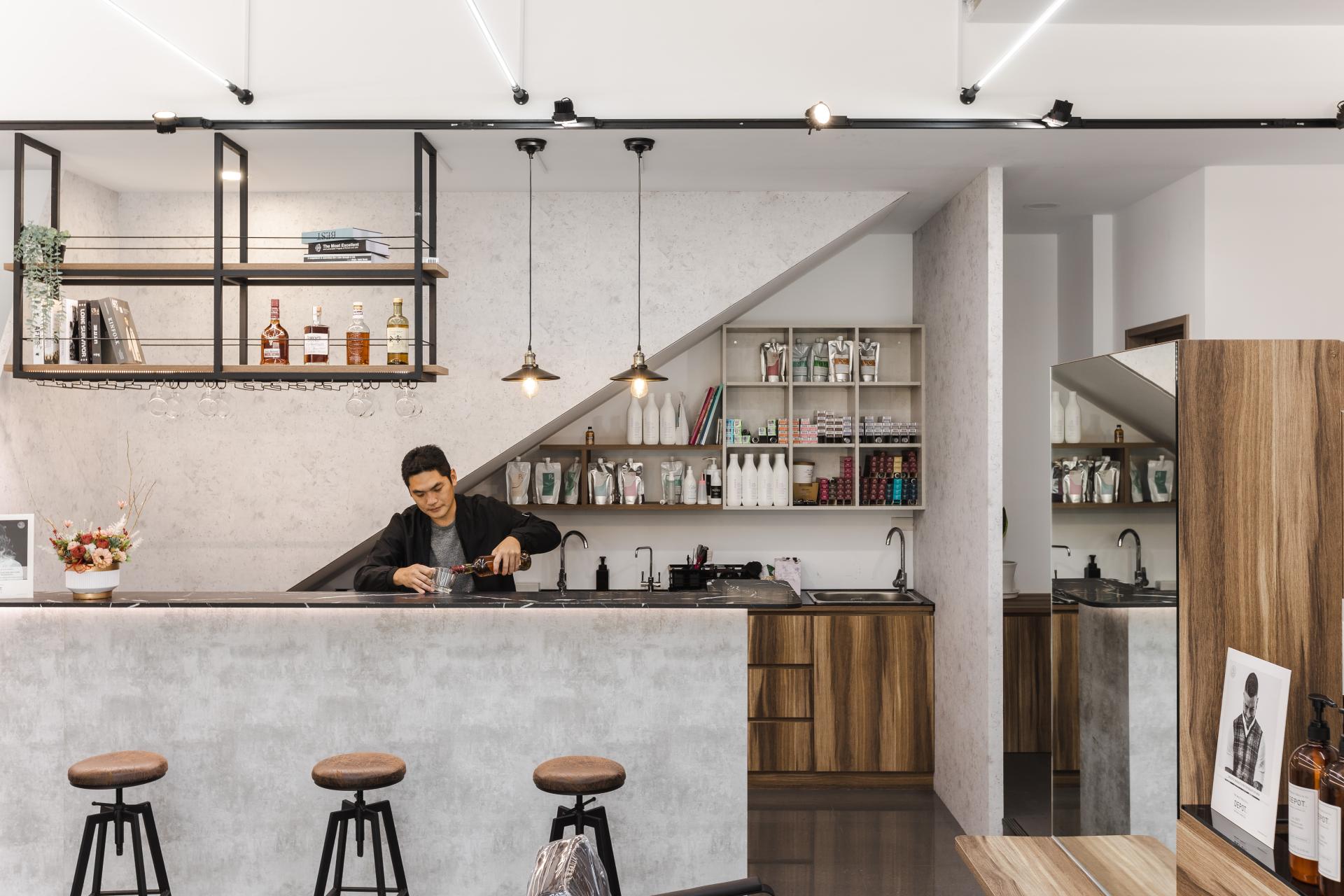 「髮酌 Hair & Sip」的設計靈感來自現代紳士沙龍的概念,將理髮、品酒與社交結合,營造一種既放鬆又充滿儀式感的空間體驗。在這裡,剪髮不只是日常保養,而是一場風格塑造的儀式;小酌不只是享受,而是一種生活態度。