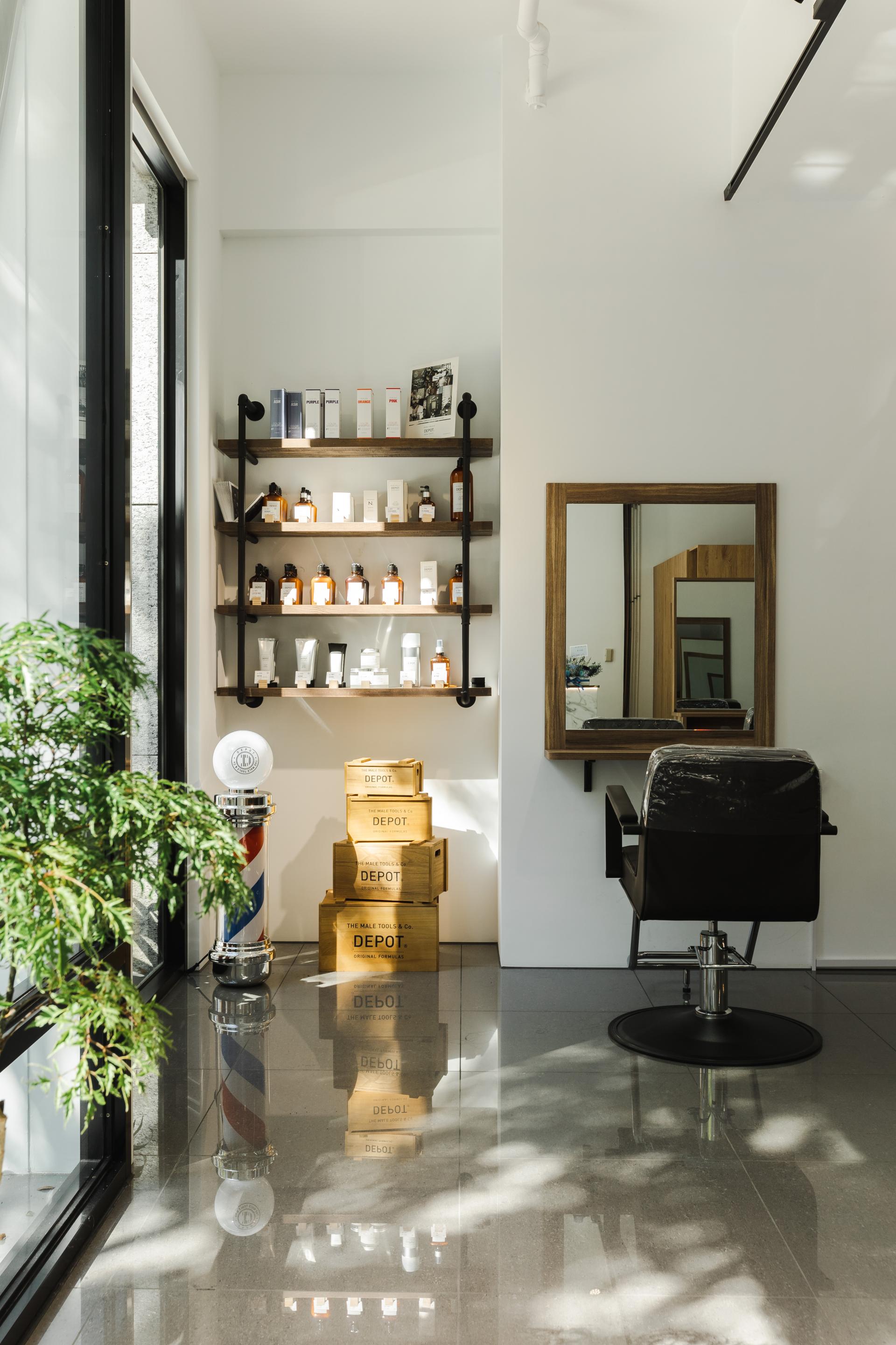理髮區:開放式木質工作台,搭配沉穩的黑色座椅,提供舒適放鬆的剪髮體驗。
