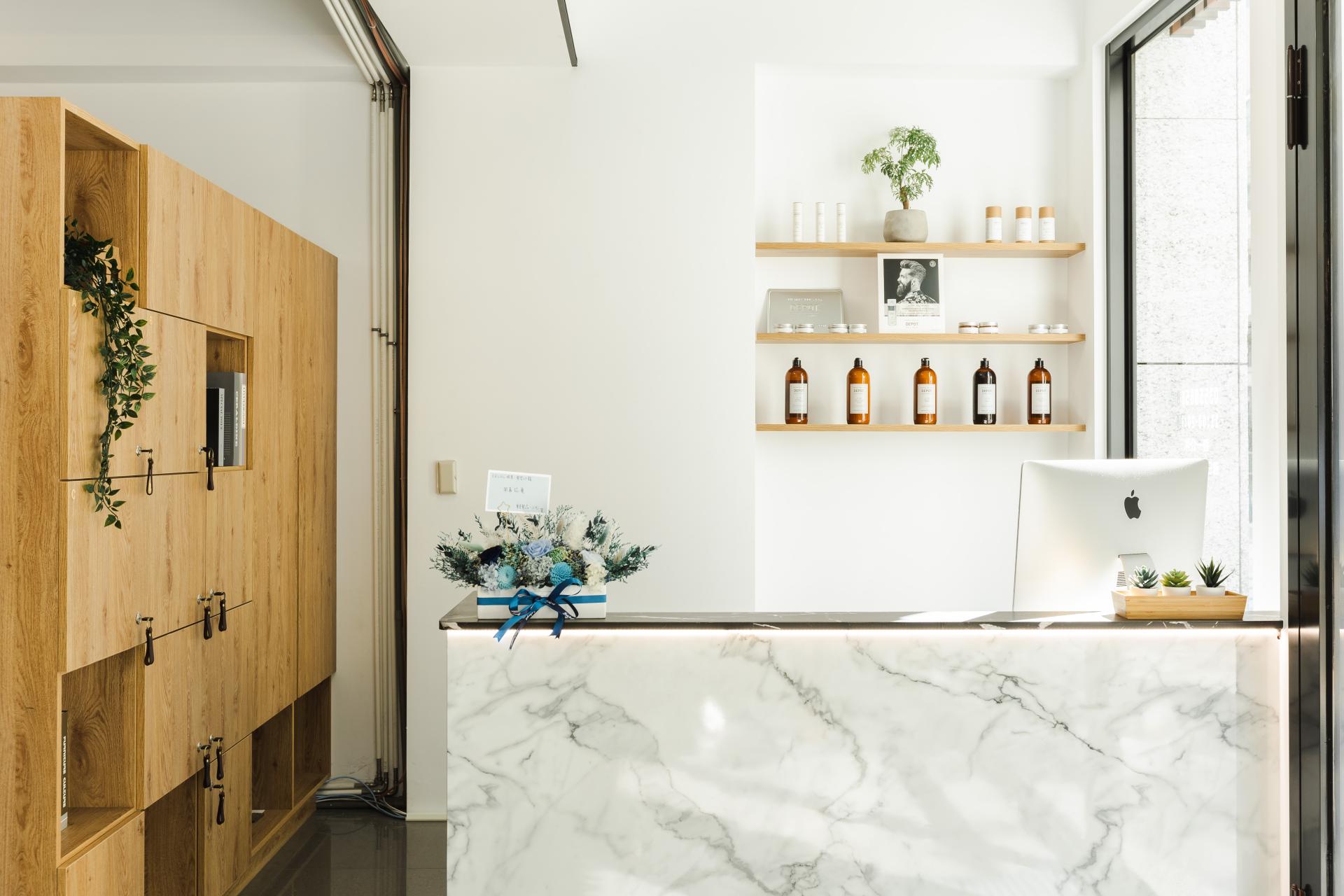 展示區:壁架展示高端髮品與精品酒類,兼具實用與美感,讓顧客在體驗中發掘更多風格靈感。