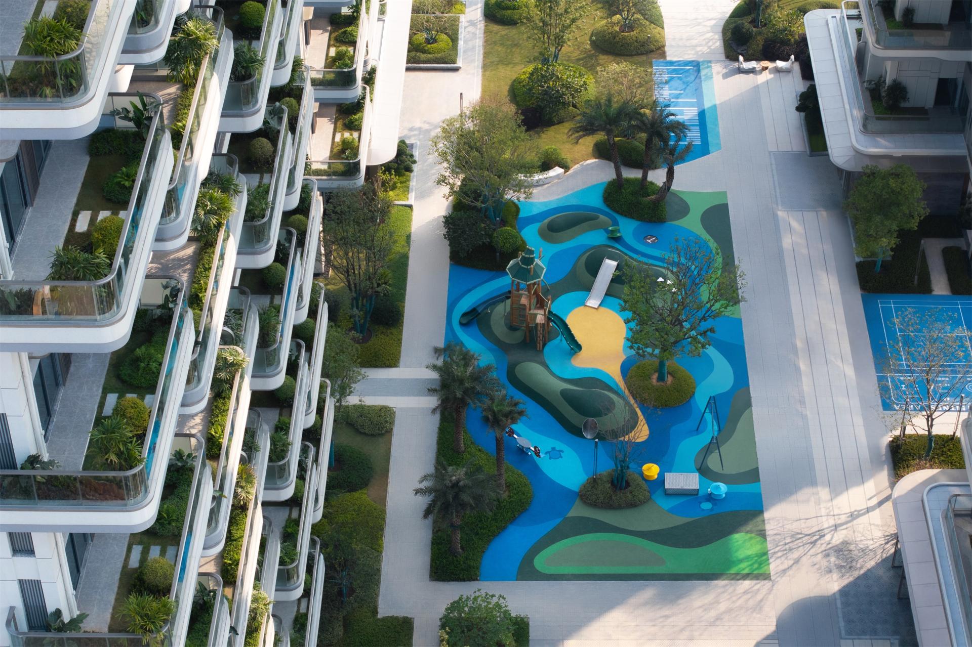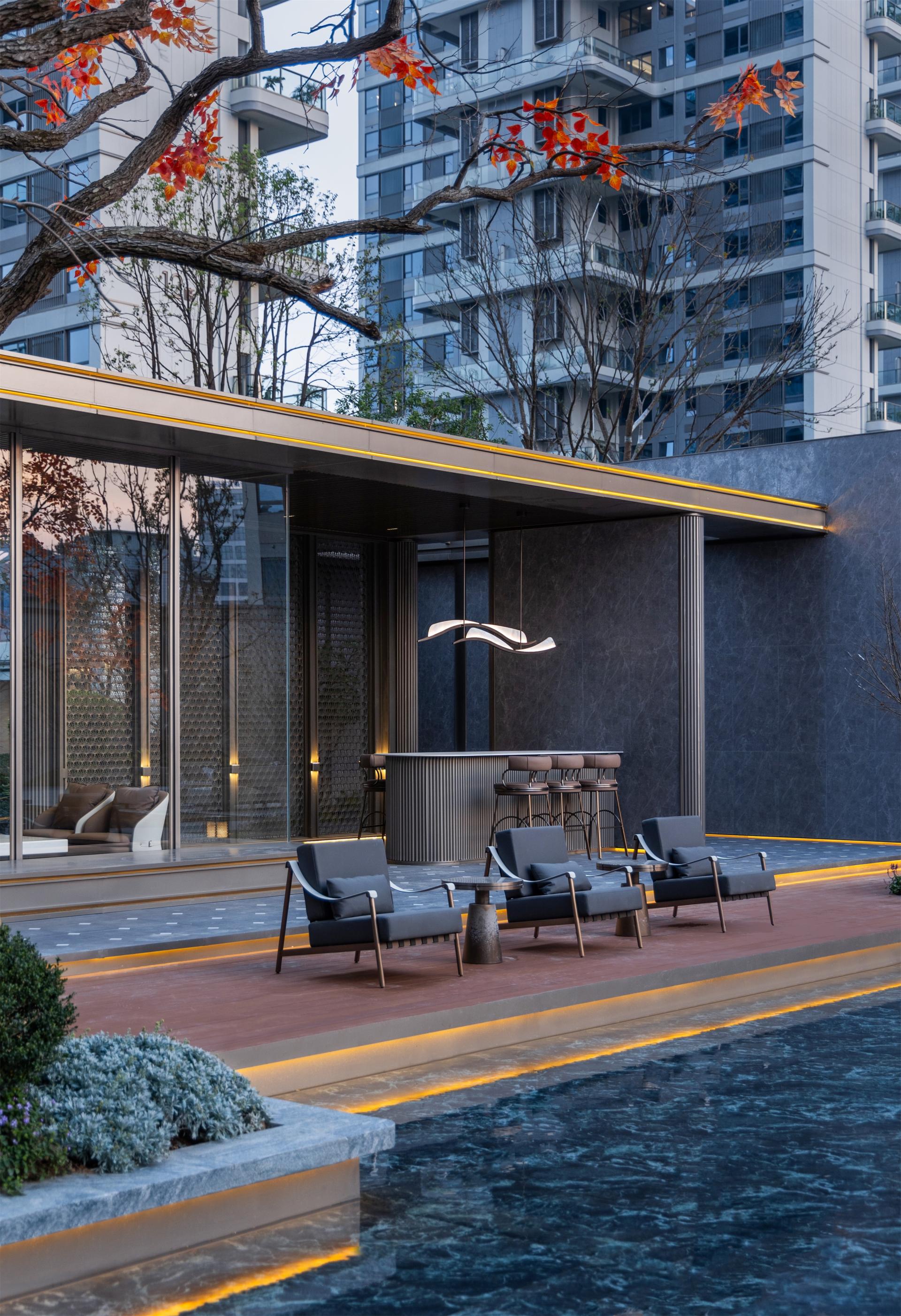 The entrance area features a hotel-style traffic circle with a water element that fosters a profound sense of homecoming rituals through its dynamic water displays and lighting effects. As one enters the community, the expansive lakeside water court becomes visible, seamlessly blending the essence of life rituals and reverence into the everyday experience of lakeside living. The landscape elements are woven together with the overhead space, forming a multifunctional living environment that adheres to hotel-like design standards. This includes various functional areas such as an underwater lounge and an outdoor fitness bar, catering to the diverse needs of residents across all age groups. The design incorporates the earth art to mimic the green waves of the lake, creating a contrast that harmonizes the wild chaos of nature with the geometric order of human-made structures, achieving a balance between the natural world and humanity.