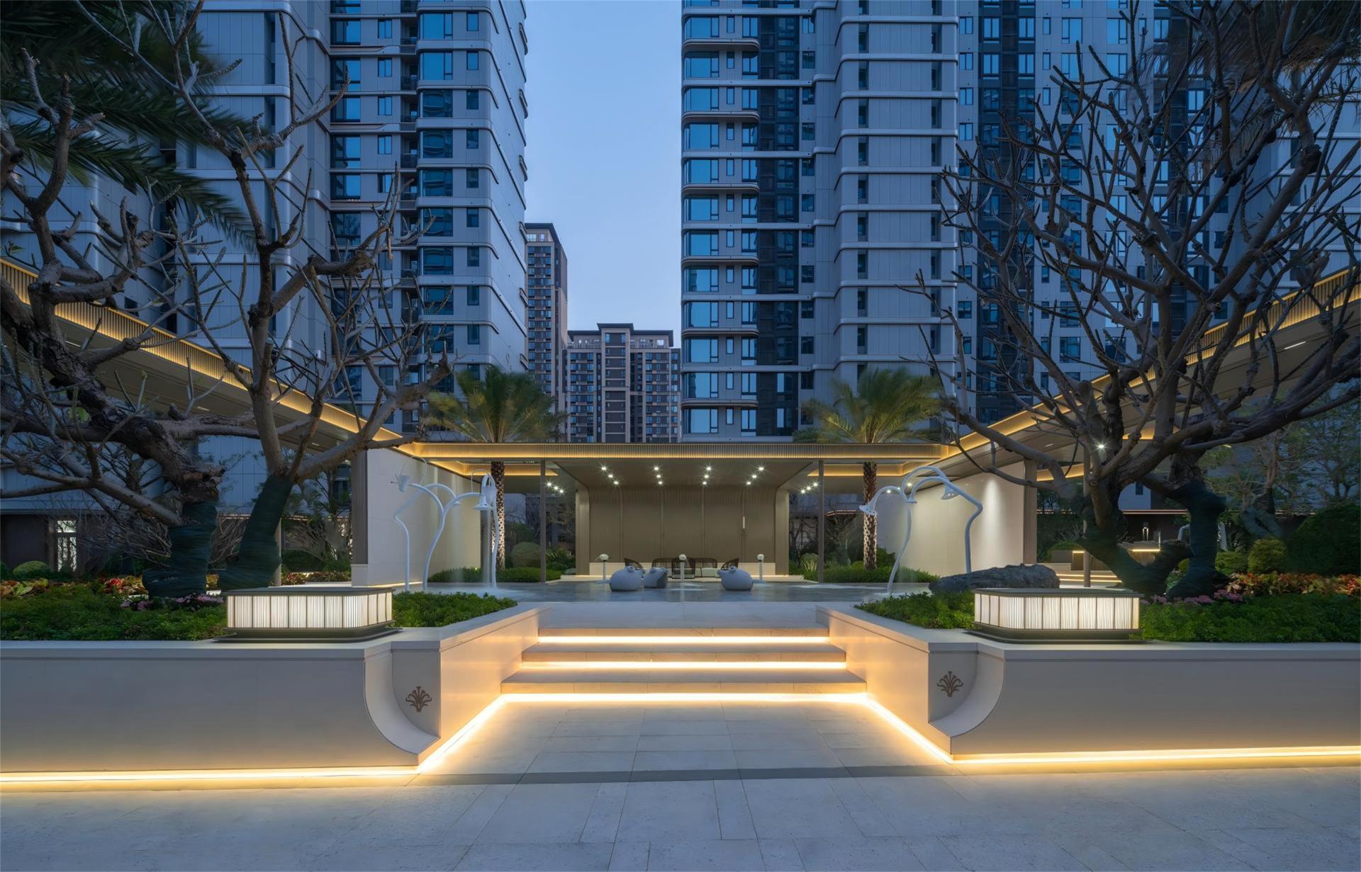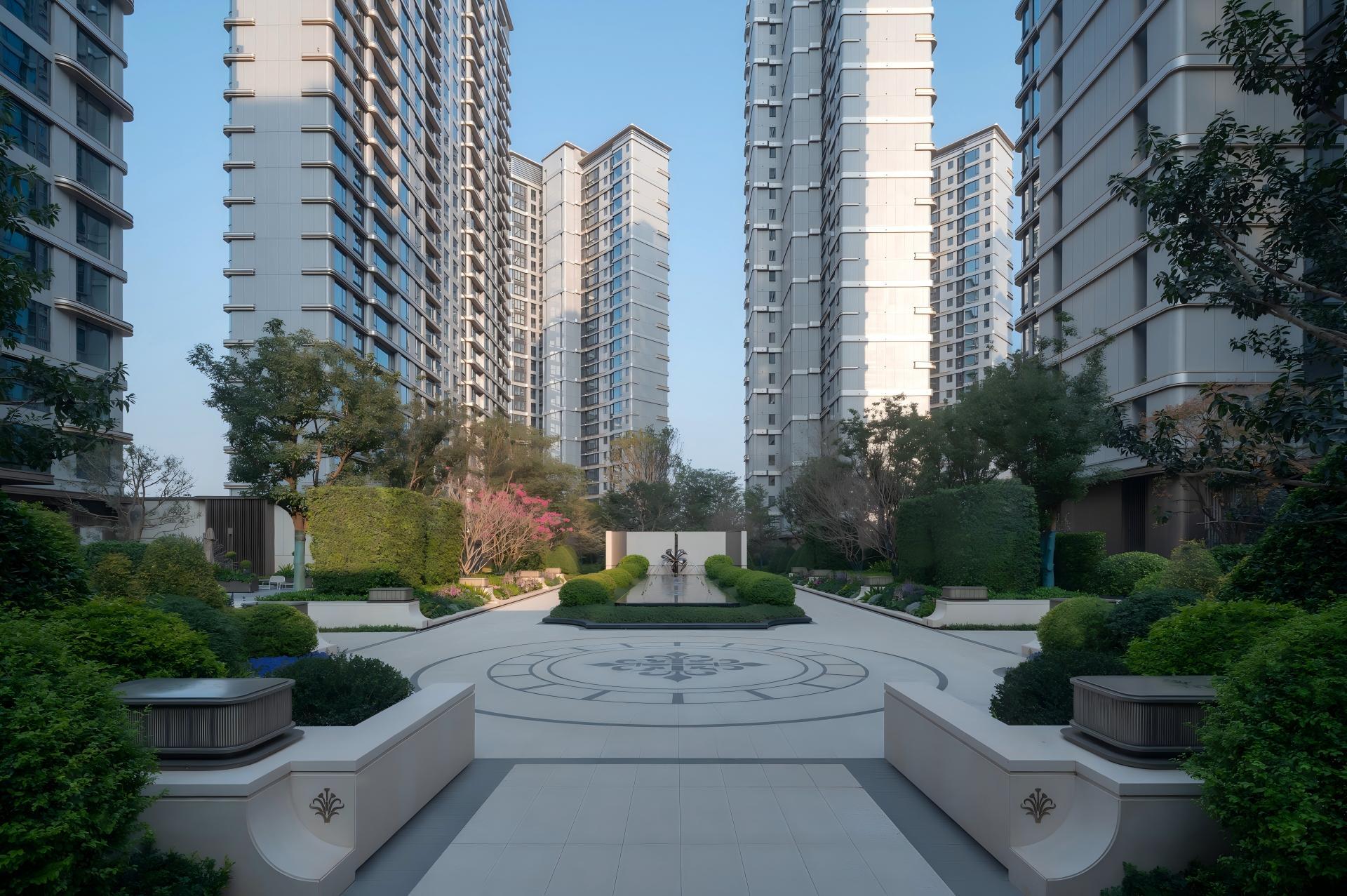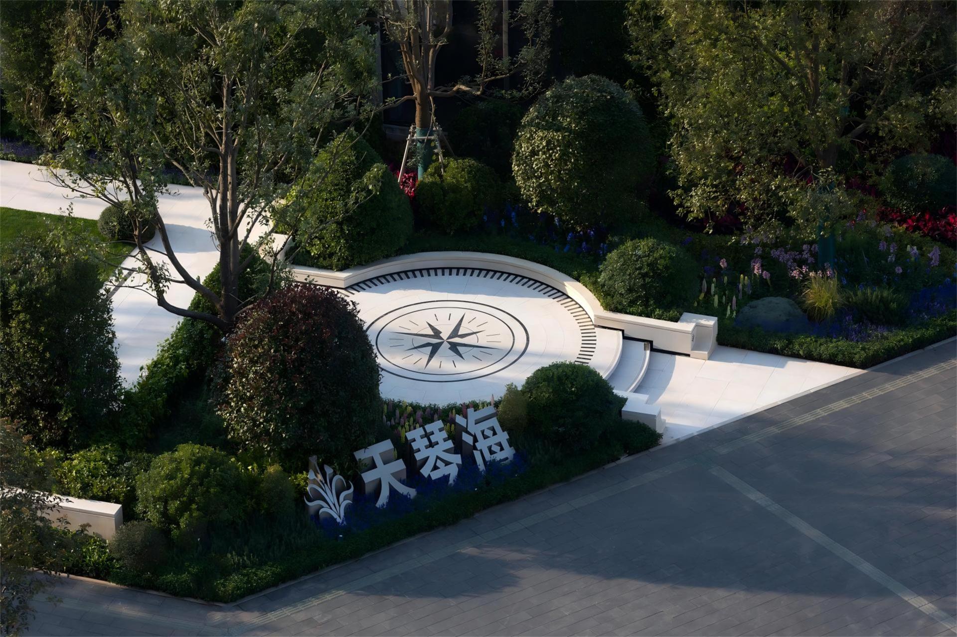 The landscape design of the entire site is centered around the concept of a "classical garden by the sea". The axial layout enhances the sense of order and formality within the space, while ocean-themed artistic elements adorn the courtyard. This symmetrical arrangement fosters a garden environment that embodies a romantic ambiance and the beauty of natural harmony. The overall planning aims to enrich residents' outdoor leisure experiences and ensure a seamless integration with the surrounding natural landscape.
