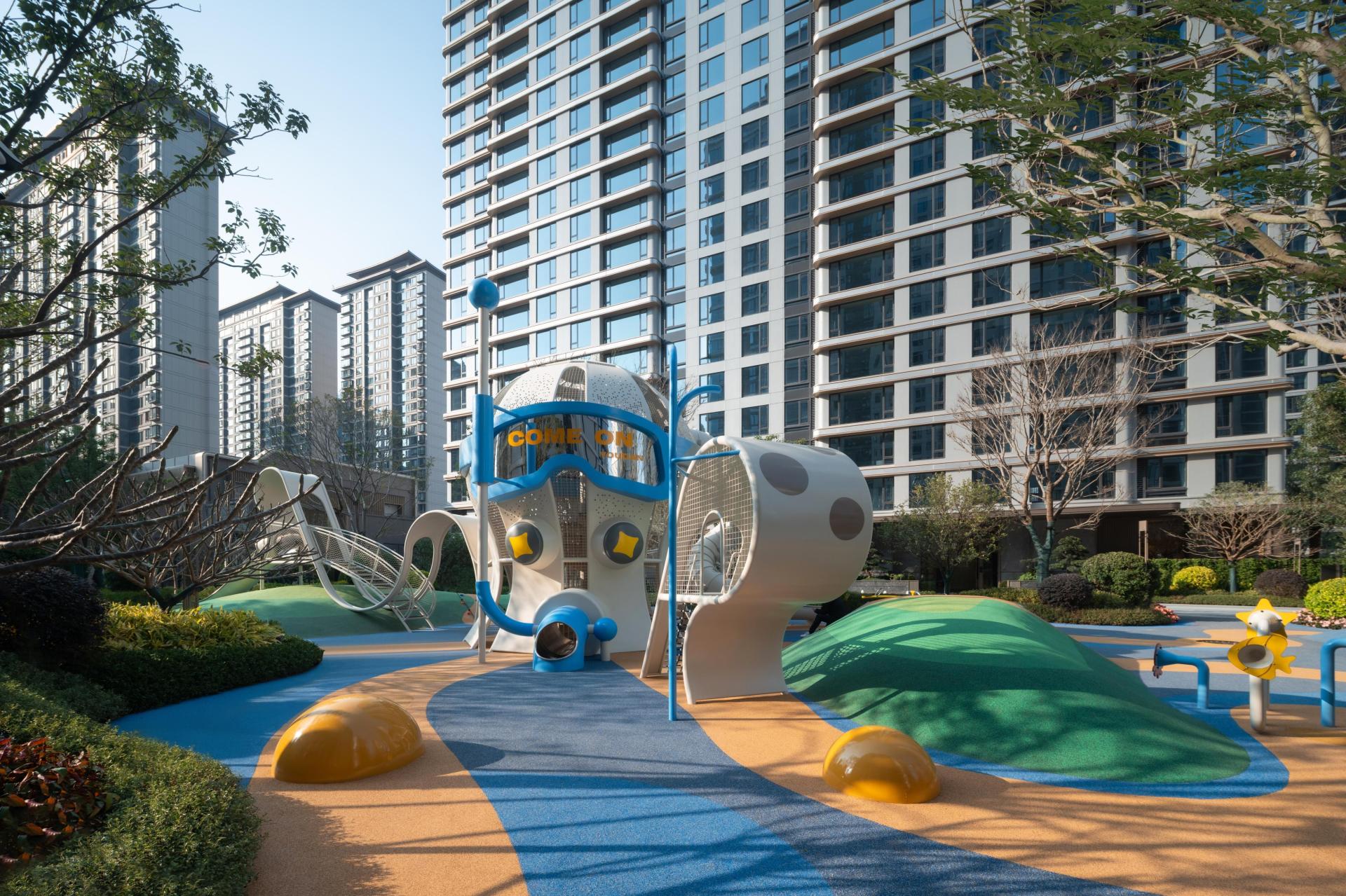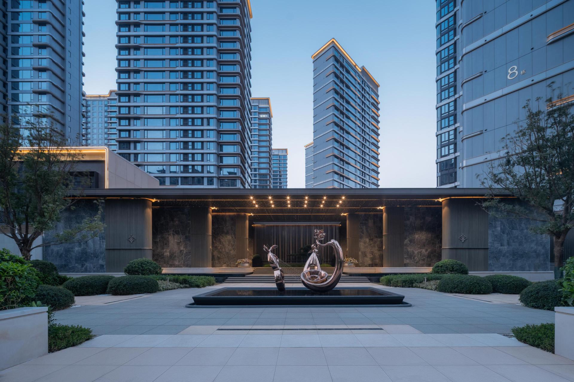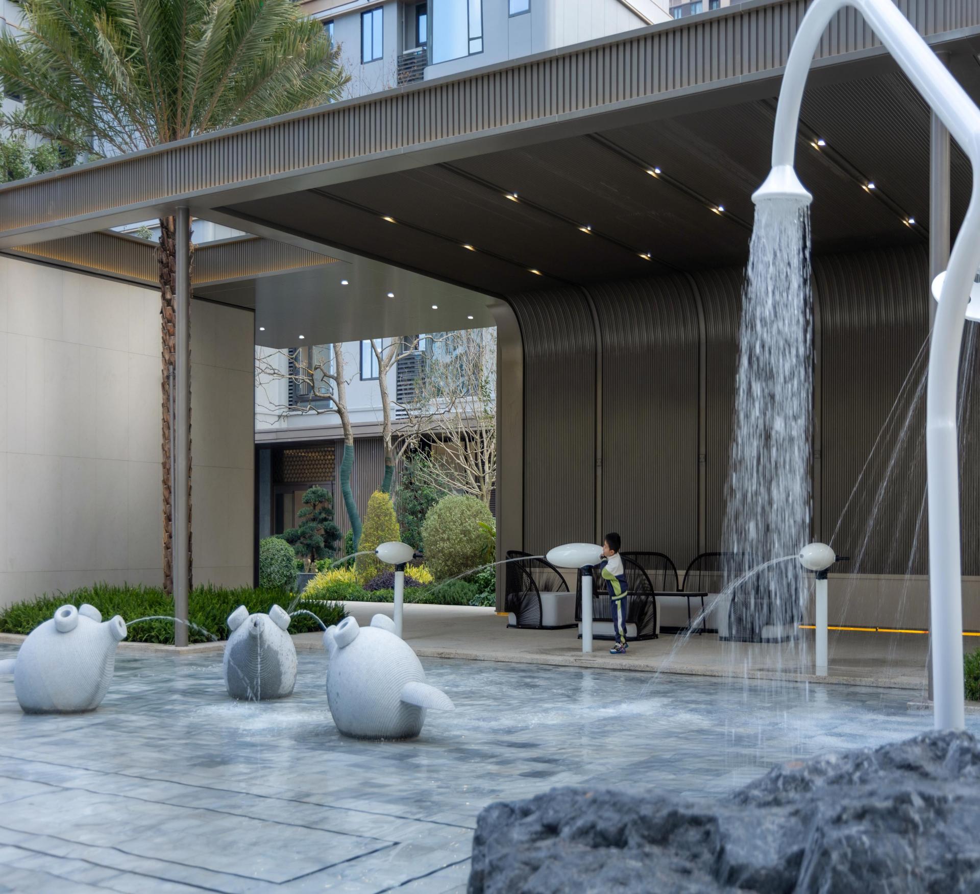 The landscape design of the entire site is centered around the concept of a "classical garden by the sea". The axial layout enhances the sense of order and formality within the space, while ocean-themed artistic elements adorn the courtyard. This symmetrical arrangement fosters a garden environment that embodies a romantic ambiance and the beauty of natural harmony. The overall planning aims to enrich residents' outdoor leisure experiences and ensure a seamless integration with the surrounding natural landscape.