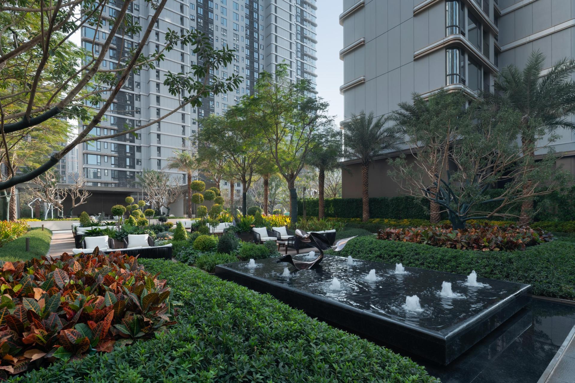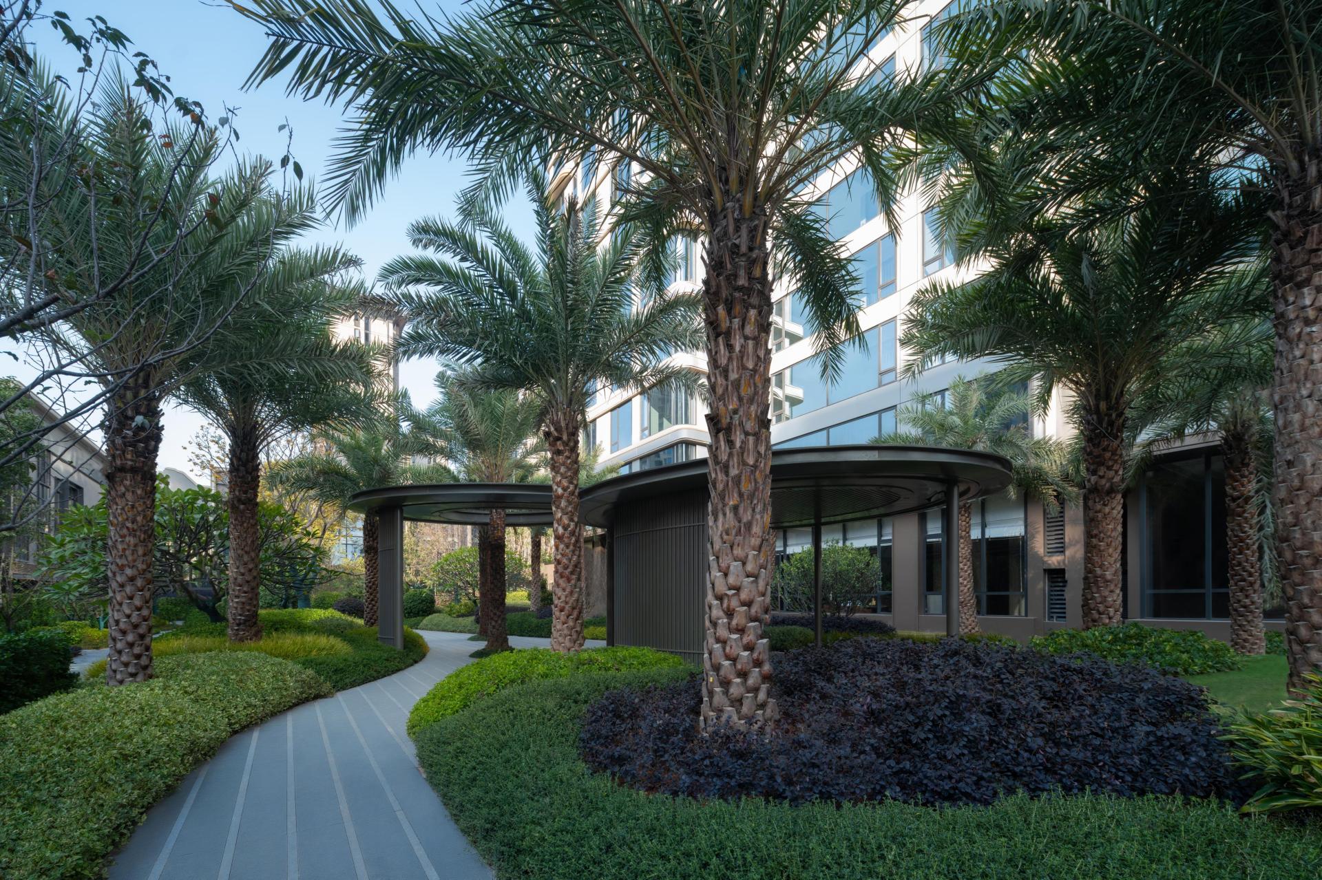 Concurrently, the garden axis is anchored by four private garden courtyards, Coconut Grove Garden, Rainforest Garden, Sea Breeze Garden, and Green Island Garden, establishing a coastal garden axis that prioritizes natural experiences. Guided by ecological principles, this axis highlights the close relationship between humans and nature. Through varied plant arrangements and micro-terrain designs, it cultivates a richly layered, tranquil, and inviting green space that promotes a natural, leisurely lifestyle within the urban environment. The interplay of the two axes forms the comprehensive landscape framework of the project.