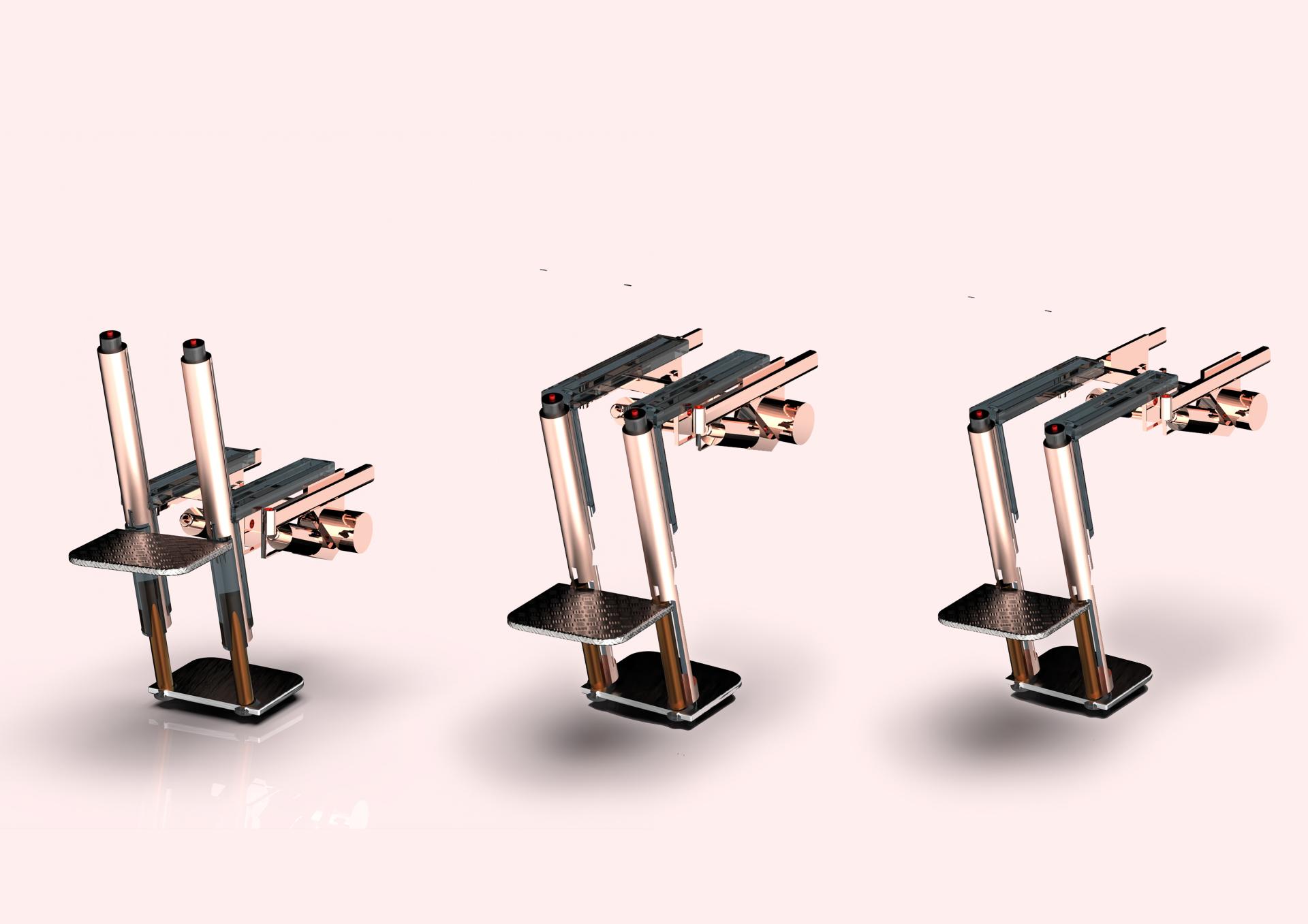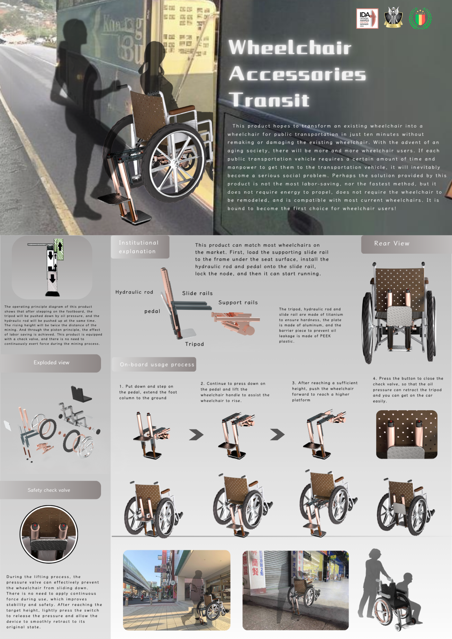 This hydraulic aid was developed to solve these problems. Inspired by observations of boarding delays, it uses a foot-operated hydraulic piston system that amplifies force fourfold, allowing caregivers to raise wheelchairs quickly and smoothly. A check valve locks the height without requiring sustained pressure; pressing the control valve allows a safe, controlled descent.