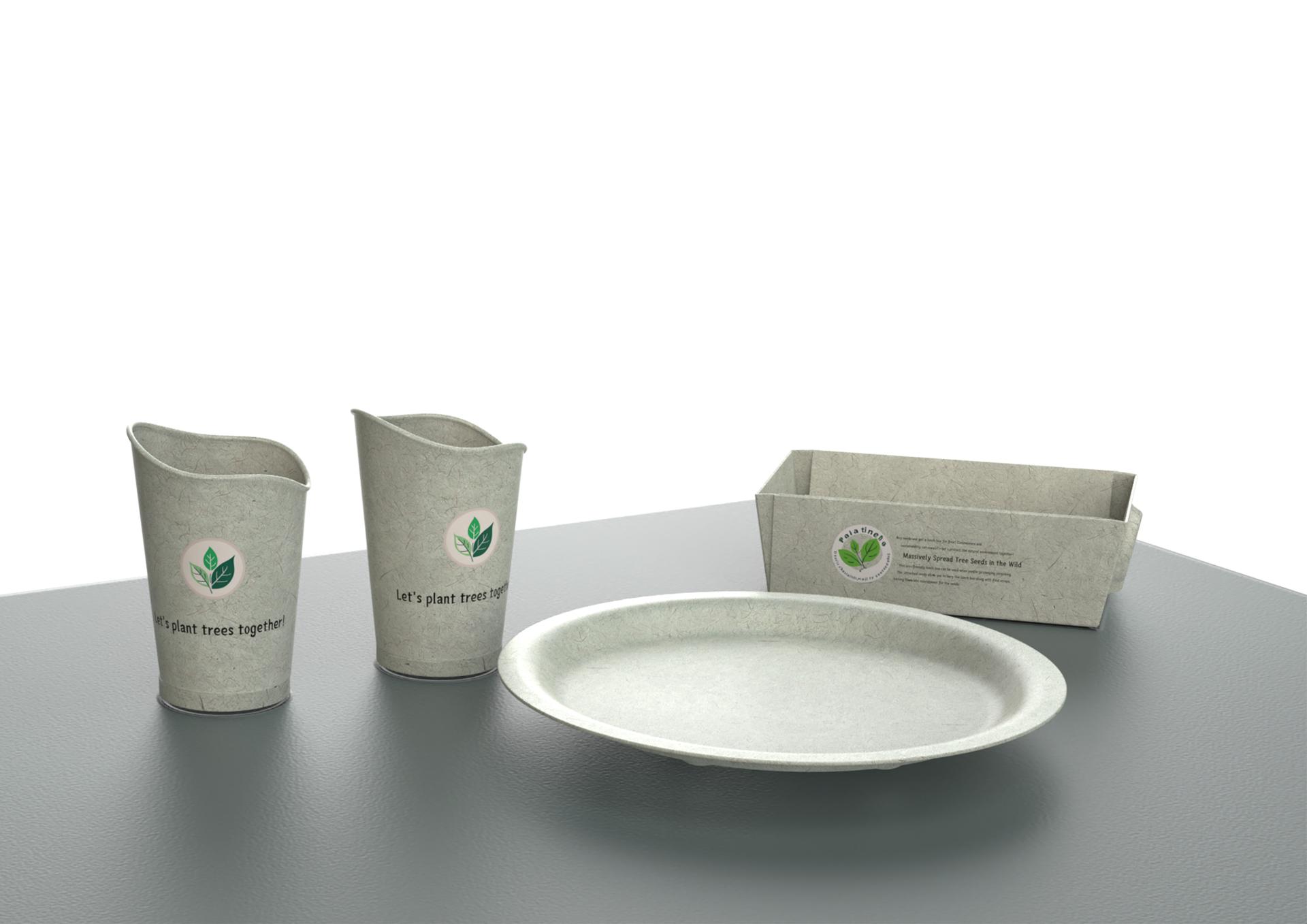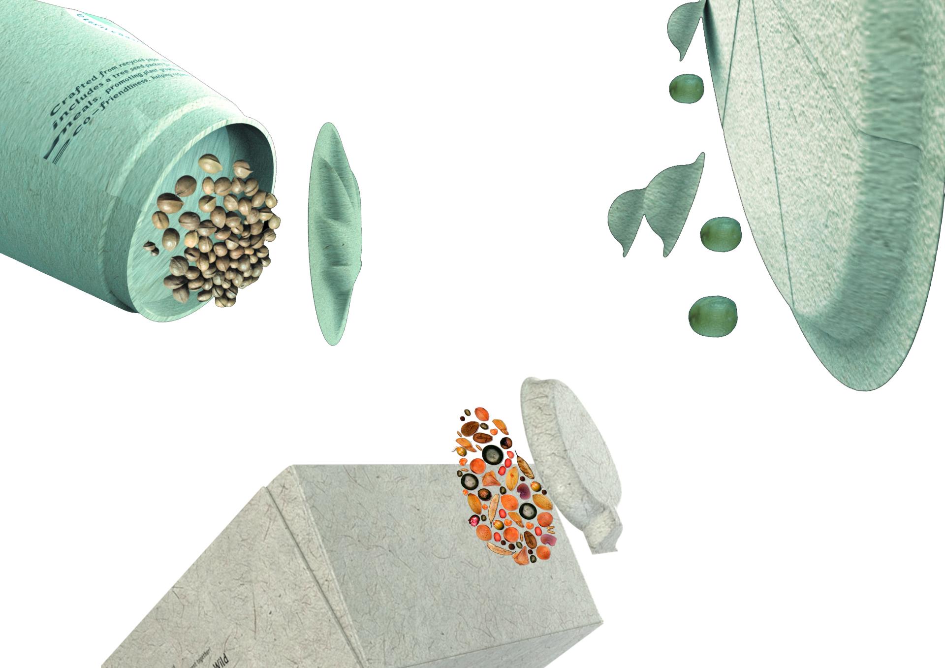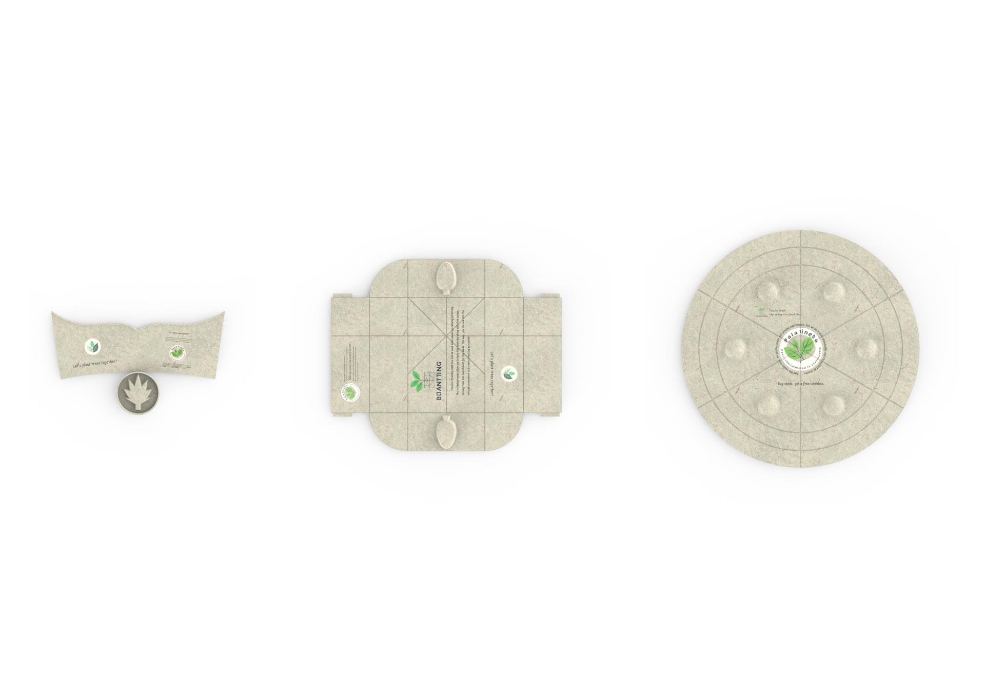 The result is a biodegradable lunchbox made from 100% recycled paper pulp and coated with natural soy protein. It contains seeds and, after use, can be folded into a cone and buried in soil. The material naturally decomposes, allowing the seeds to germinate and grow. Extensive testing ensured the right balance between structural durability, biodegradability, and seed preservation.