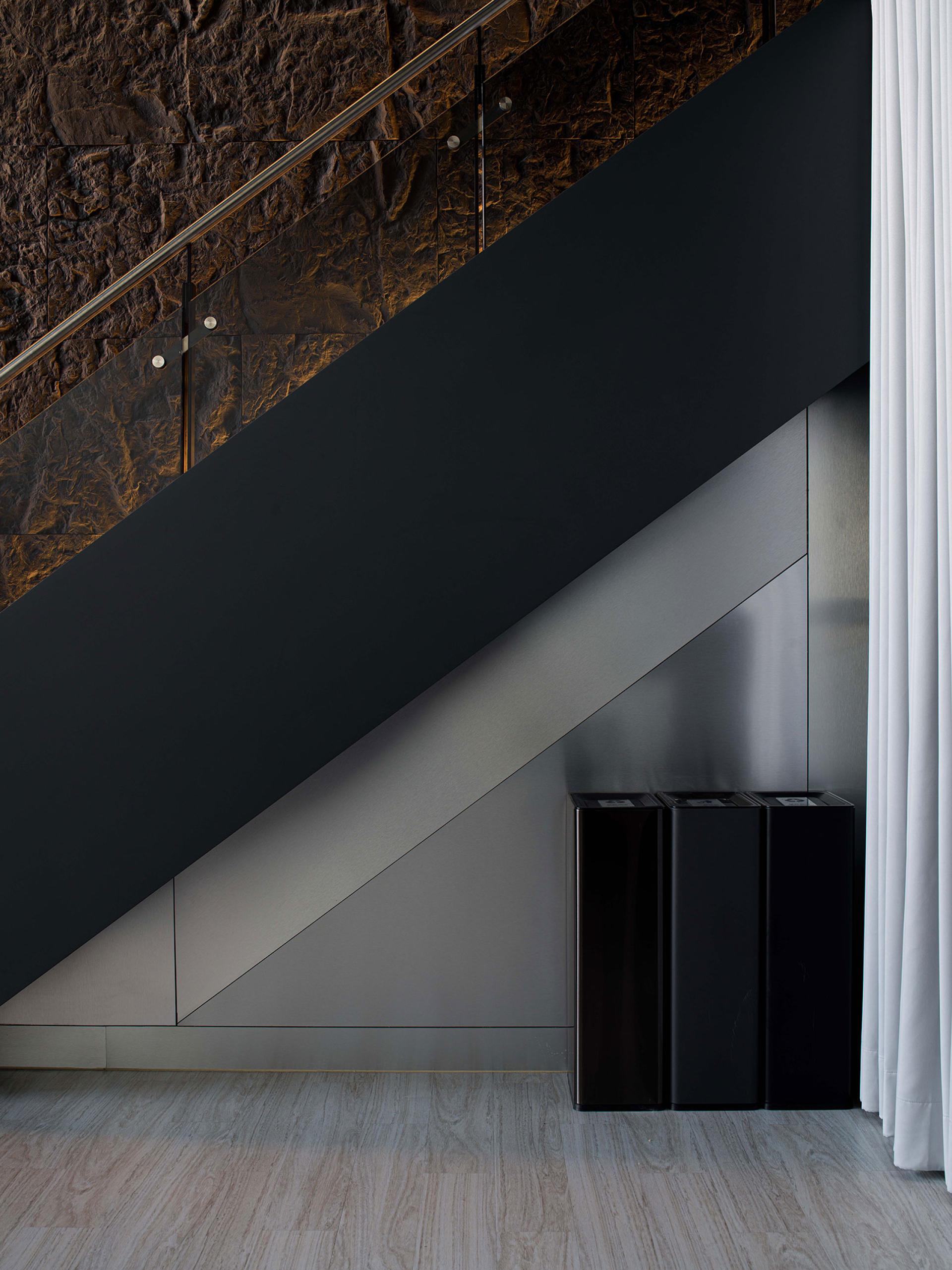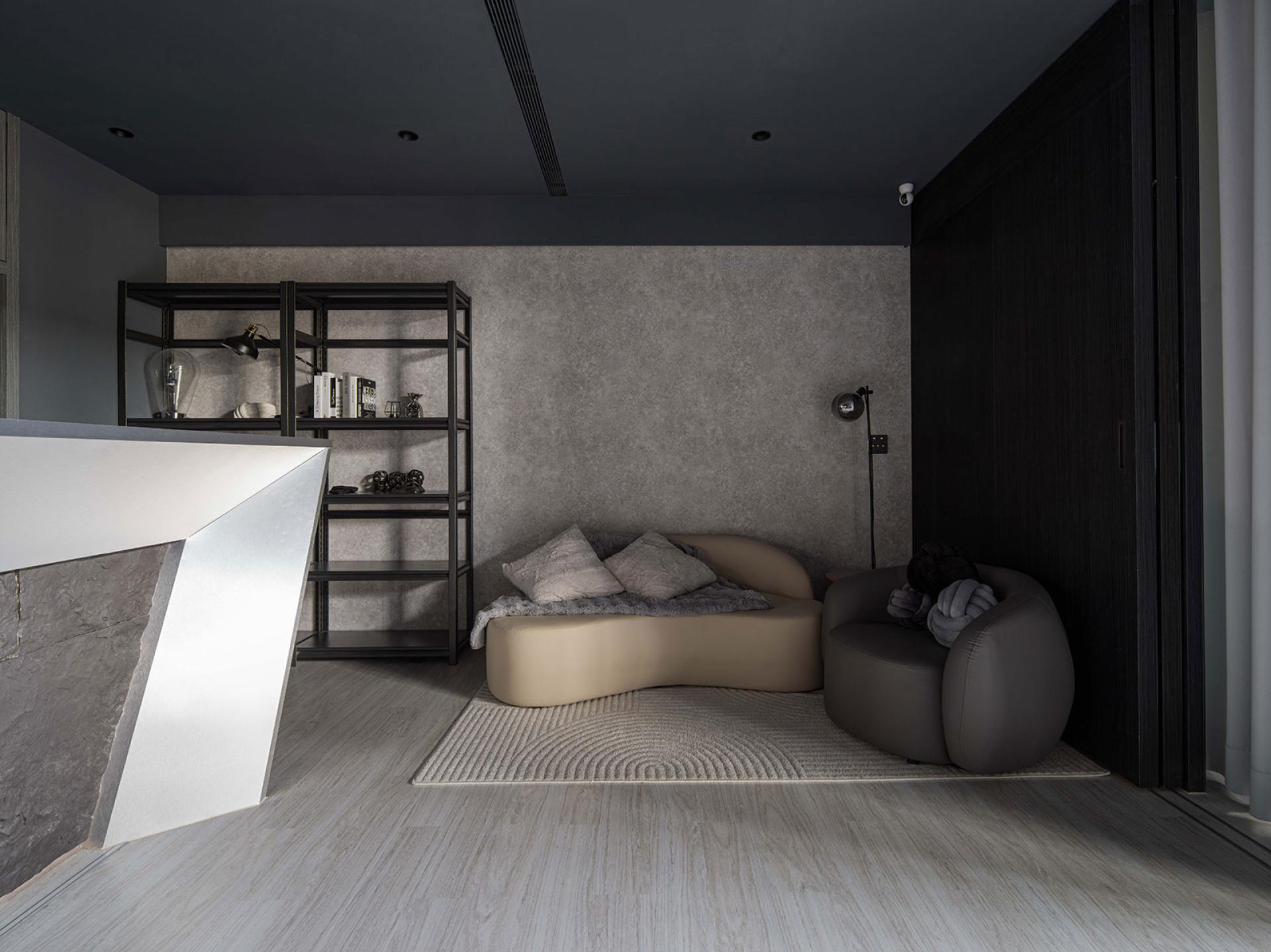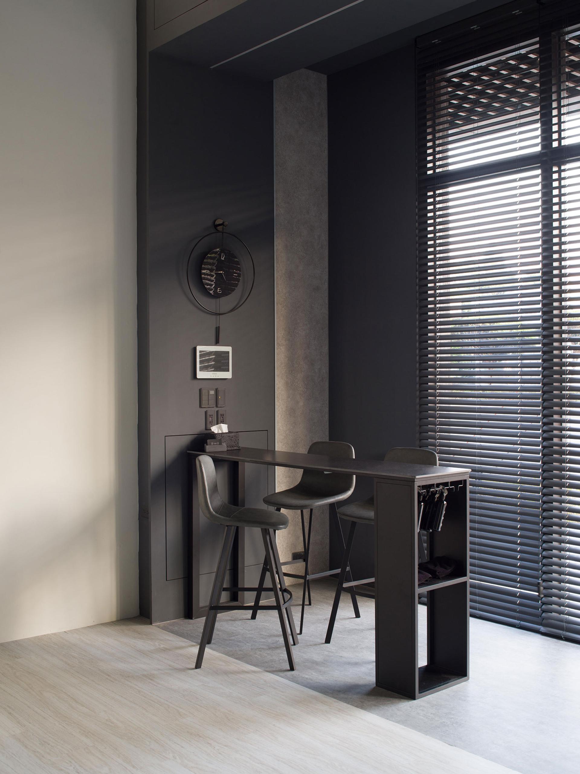 The palette of deep greys and blacks is accentuated with refined industrial elements,