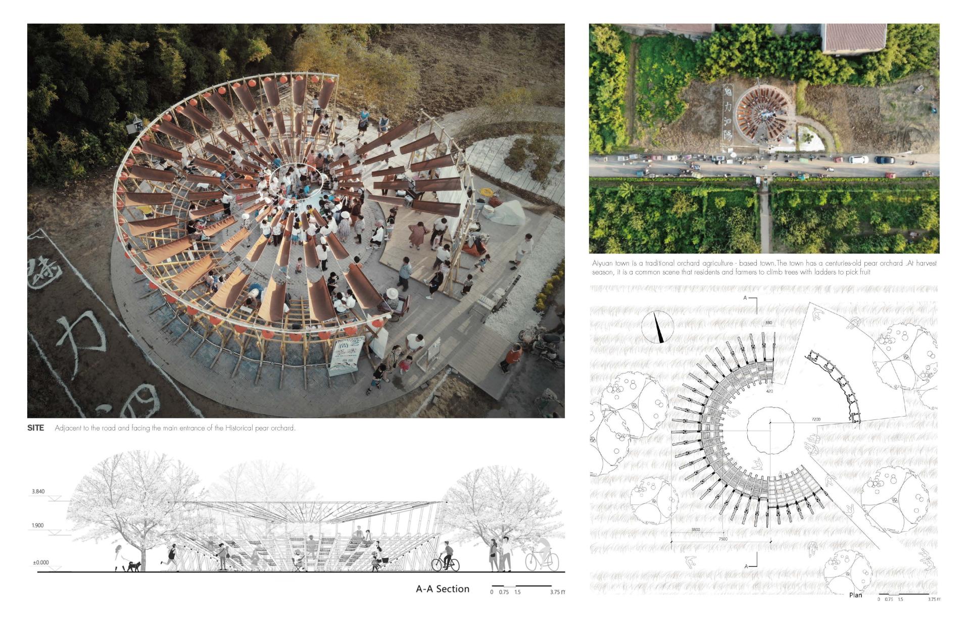 To fully integrate into the rhythms of local life, the design adopts an assembly-based approach. The main structure consists of a wooden base frame, a triangular support system, wooden ladders, steel-wood joints, and tension straps. Residents bring their own tools and materials to the pear garden, collaborating to build or disassemble the structure, forming a mobile, community-driven amphitheater.