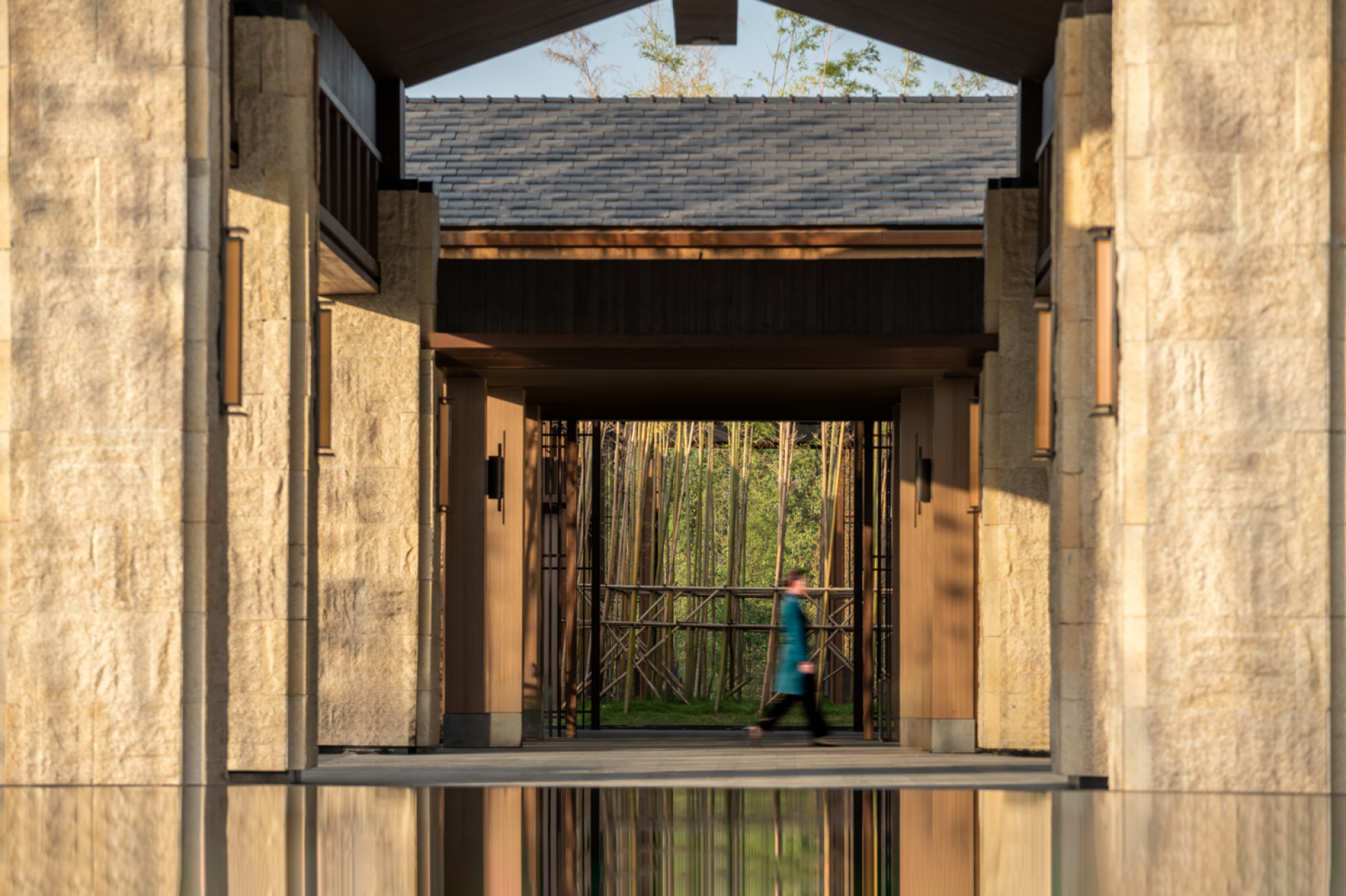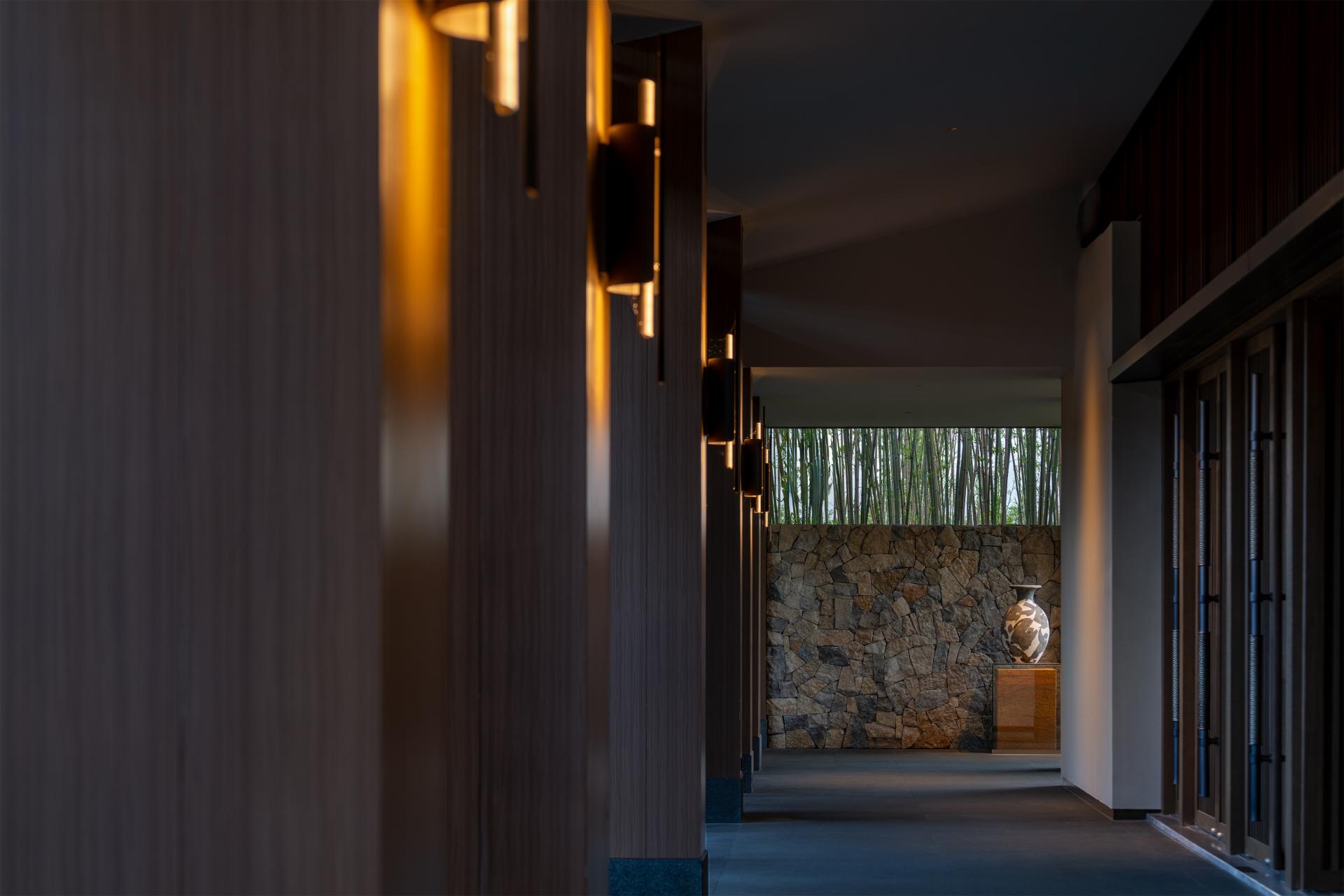 In this project, the emphasis is not placed on architecture itself. Instead, it serves as a backdrop to the serene lifestyle in Sichuan, which is the primary focus of the design. The concepts of the "Linpan" and "Courtyards" emerge as the most effective spatial elements throughout the design framework. Guests meander through the meandering tea plantations and fruit orchards, arriving at a courtyard enveloped by bamboo. They then enter an outer corridor defined by a woolen stone wall, where water acts as a reflective surface and bamboo serves as a natural screen. The lobby and lobby bar are positioned on either side of the water courtyard, collectively framing the entrance to the "bamboo forest" and "water courtyard". Accompanied by the soothing sounds of a waterfall, this setting evokes a sense of paradise.