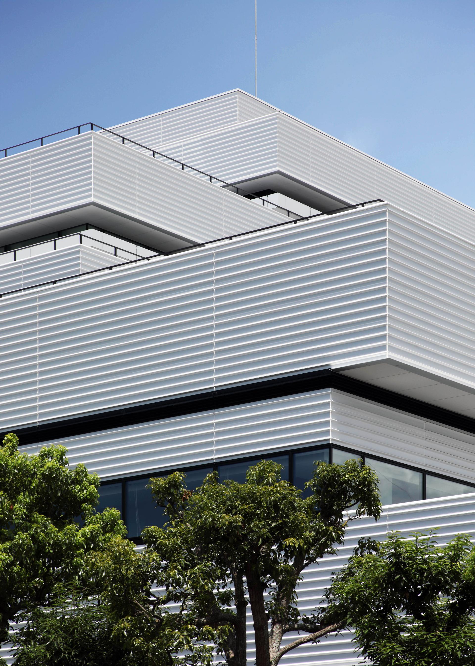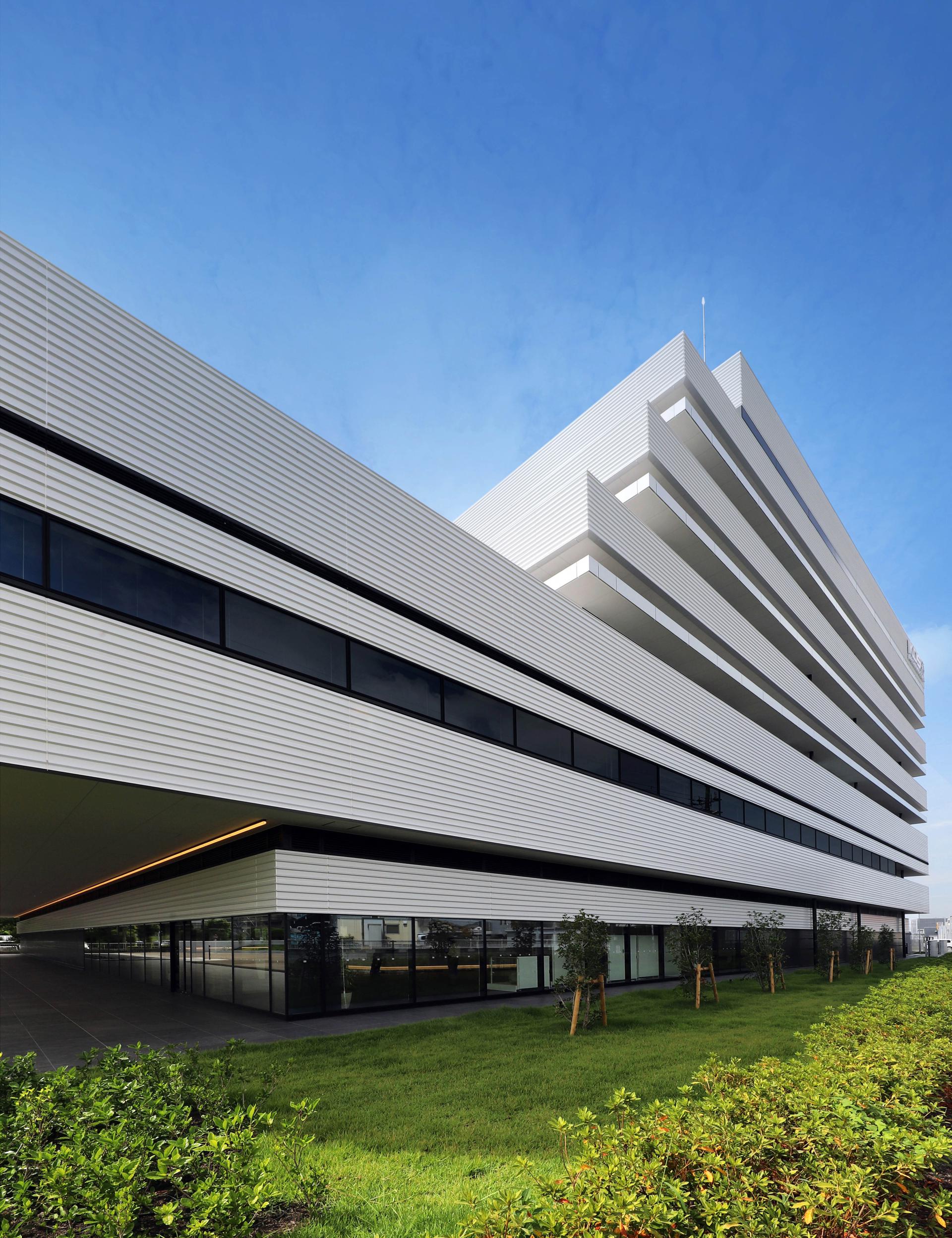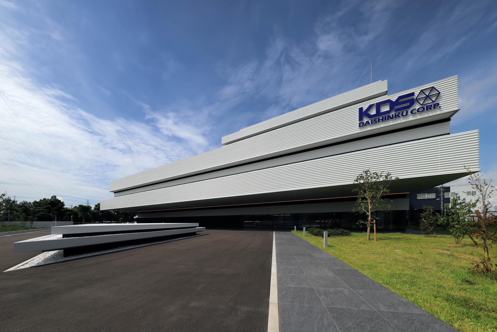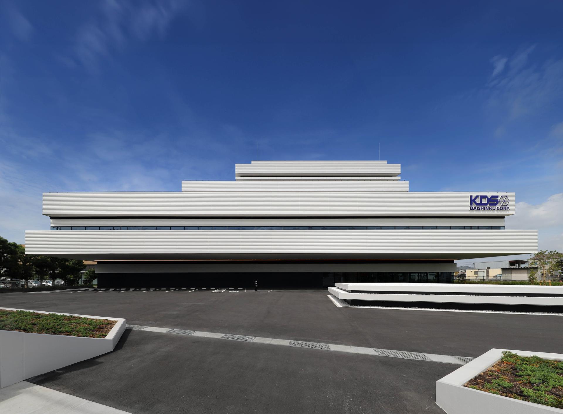 DAISHINKU CORP. is a leading Japanese company engaged in the manufacturing and sales of quartz devices. This project aims to create a smart factory that integrates headquarters and plant functions on a site adjacent to the existing Central Laboratory. The exterior design is inspired by stacked crystal chips. Five layered rectangular volumes of different sizes represent DAISHINKU's history of technological innovation and its future growth.