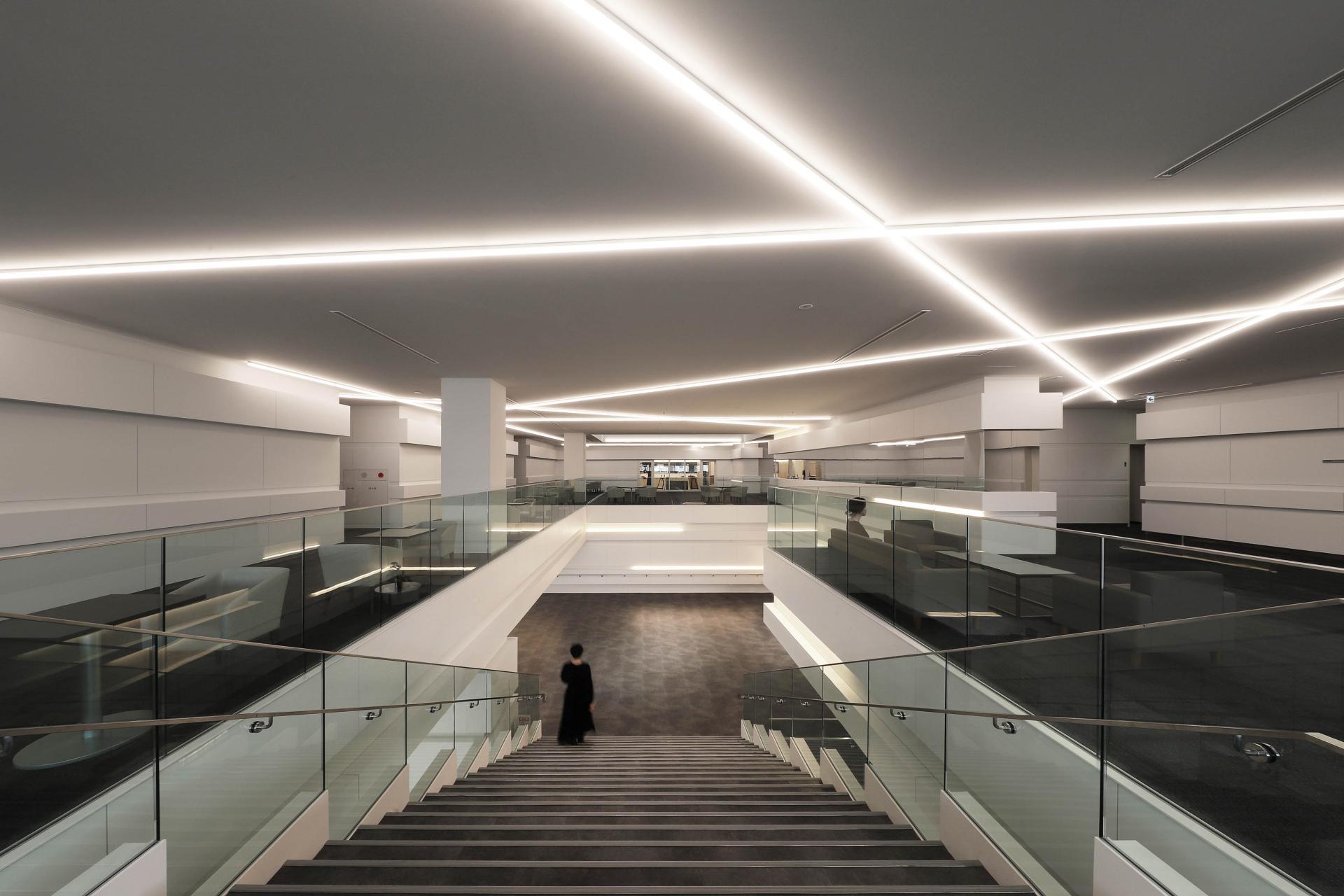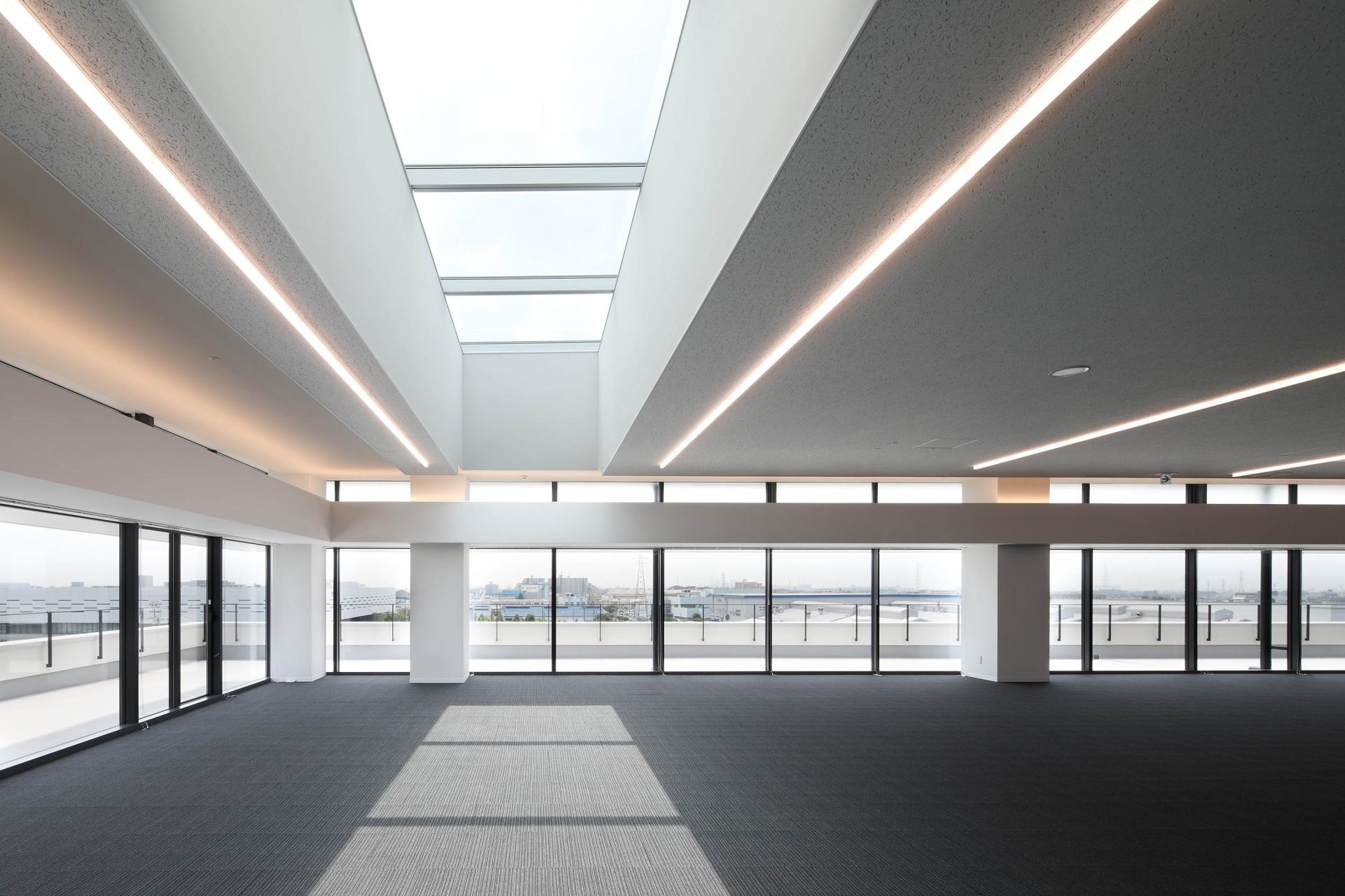 to the exterior but also permeates the interior space, thus visualizing the corporate identity. Each floor is organized around an atrium pierced through the center, with natural light from the skylight spreading across each layer. This not only enhances energy efficiency and openness but also stimulates encounters and communication among workers on different floors.