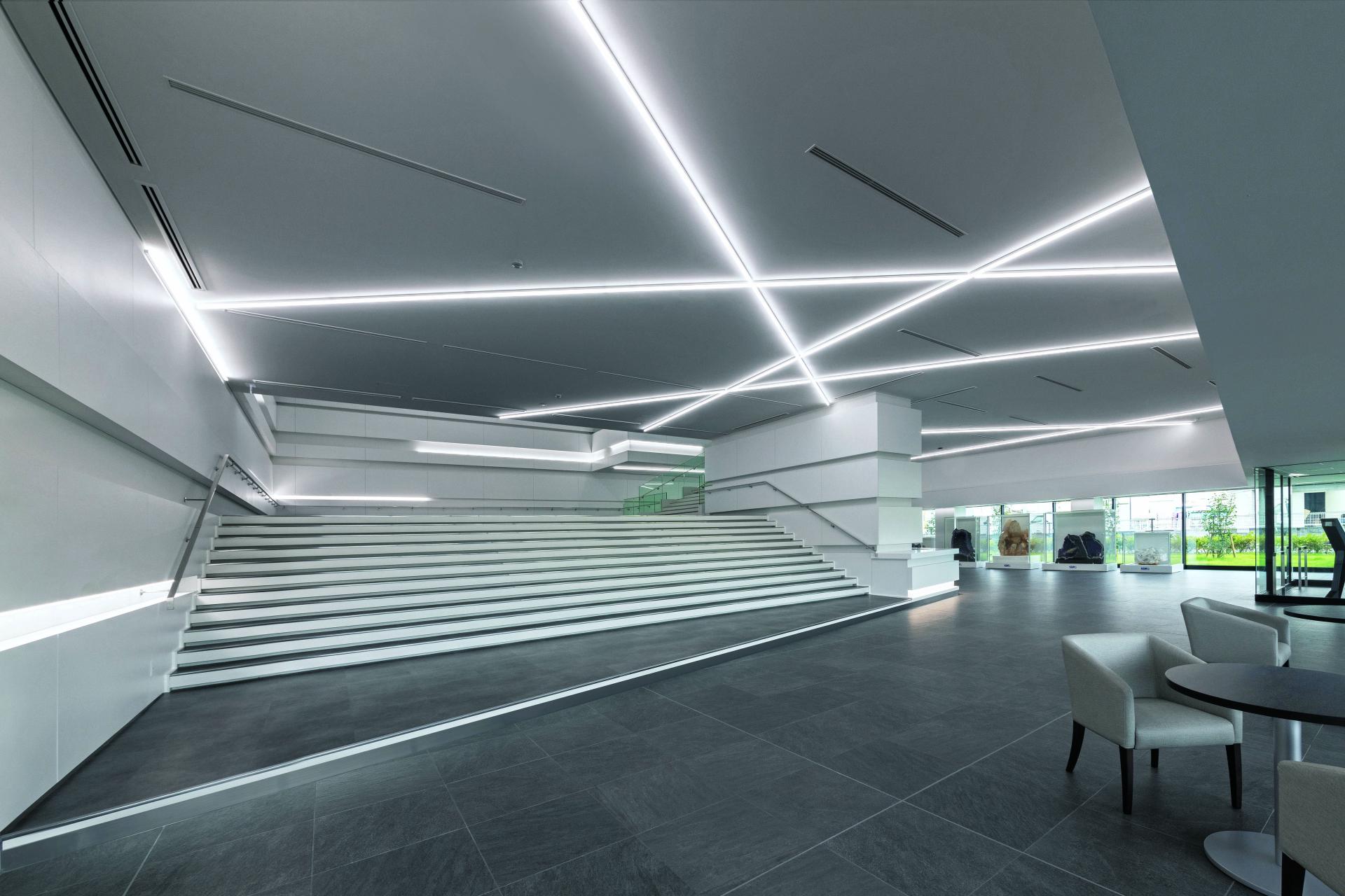 The interior lighting is designed with a focus on the angles of the chips cut from crystal. The thickness of the processed chips is a key factor in determining the device's resonance frequency, while the angle is an element that affects the stability of that frequency. The most commonly employed 35.15°AT cut, as well as the 38°CT cut and 52°DT cut, is used to design interior line lighting based on these unique angles. This line lighting creates an innovative lighting environment that embodies DAISHINKU's identity, as different angles intricately combine within the space.