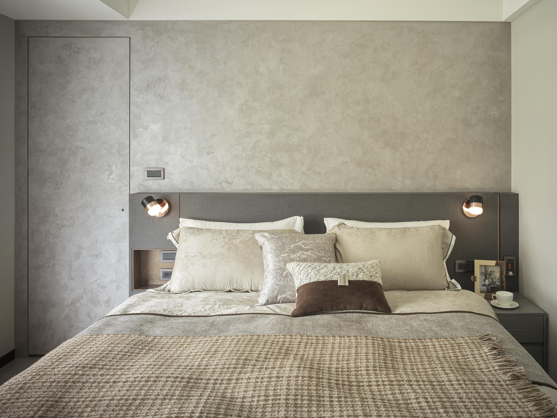 The design of the private areas extends the understated luxury theme from the public spaces, applying velvet paint elements to the master bedroom walls. The secondary bedrooms use fabric-textured wallpaper to create a comfortable and soothing ambiance. Even with their minimalist design, the bedrooms possess a distinctive warm character.