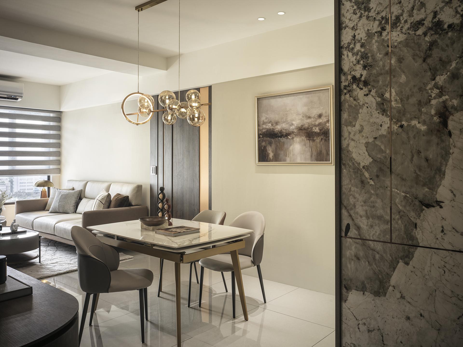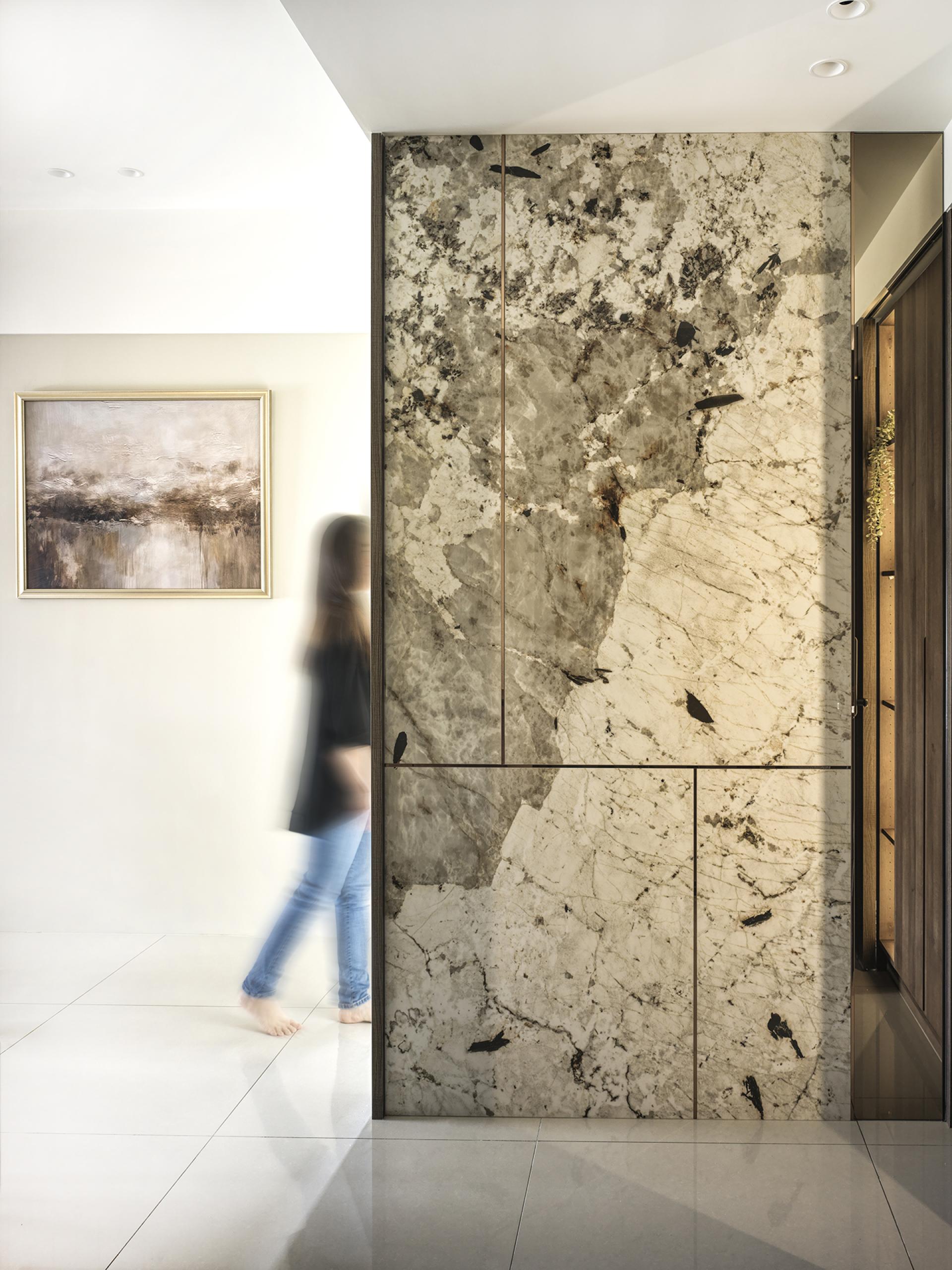 To address feng shui requirements for the entrance screen, we transformed it into a beautiful focal point using segmented aesthetic design. We combined a whole piece of marble-patterned thin panel with rose gold titanium-plated decorative strips to divide and reassemble the elements, creating a modern splash-ink beauty. The addition of tea-tinted mirrors not only amplifies the visual effect but also creates an intriguing sense of extension.