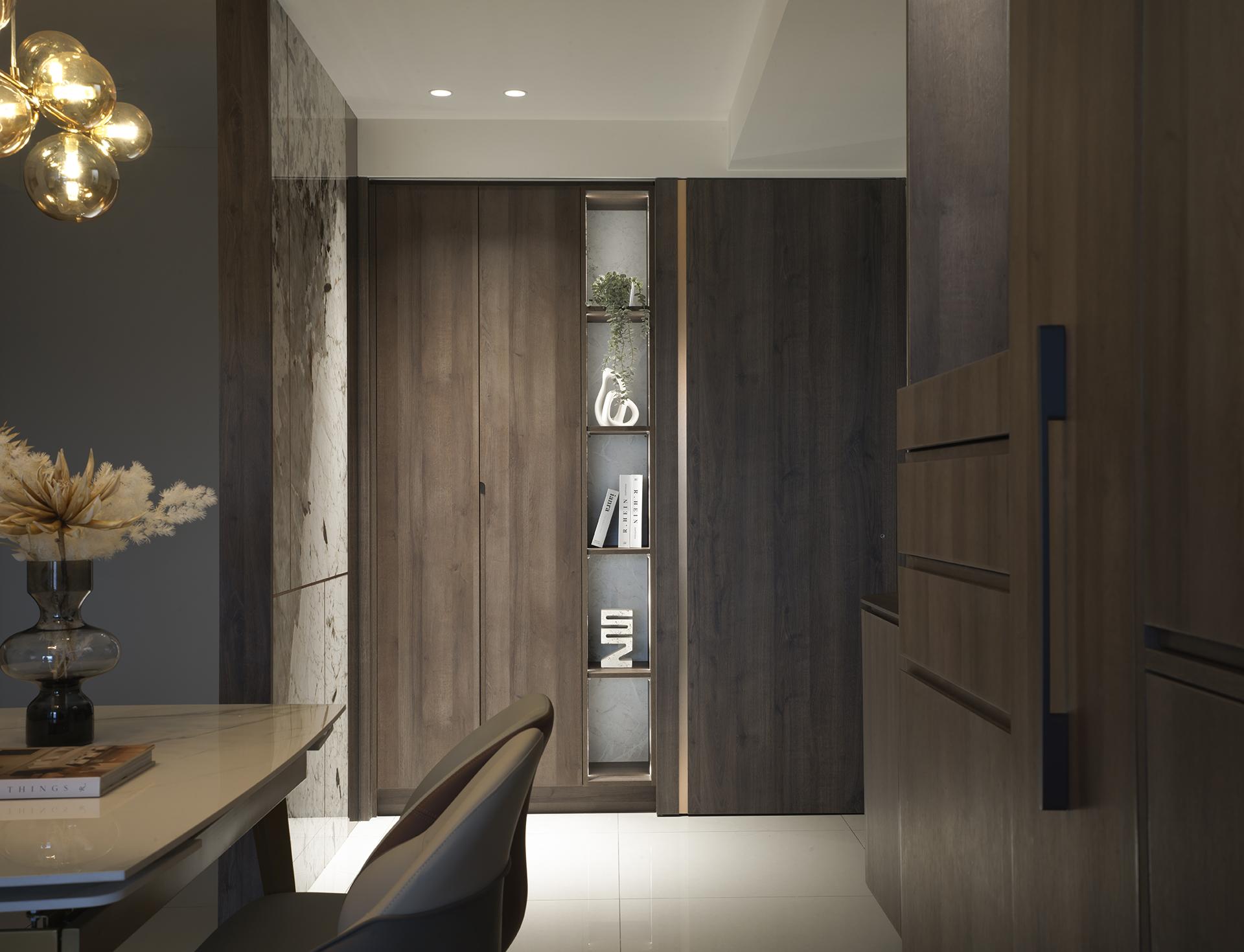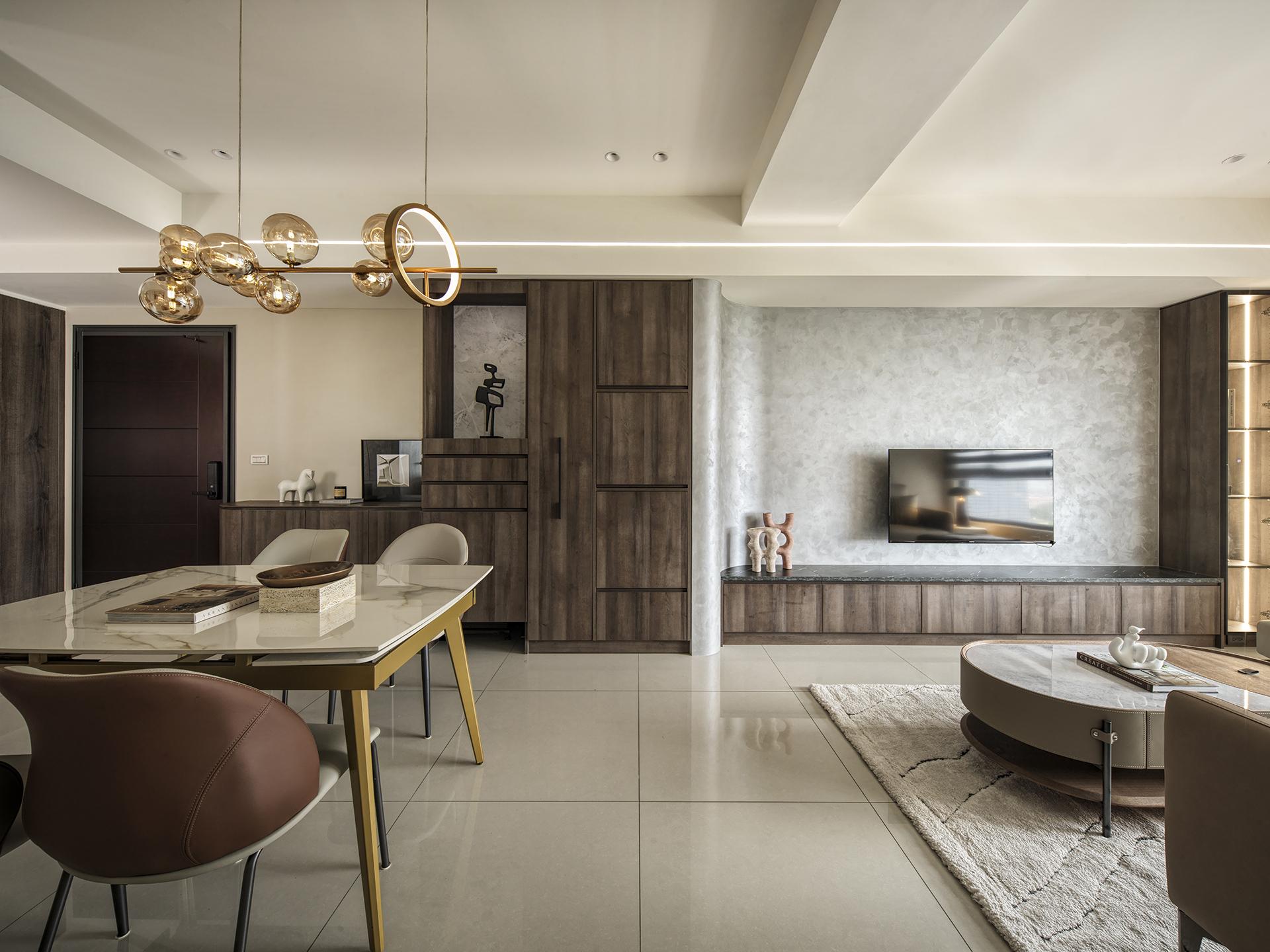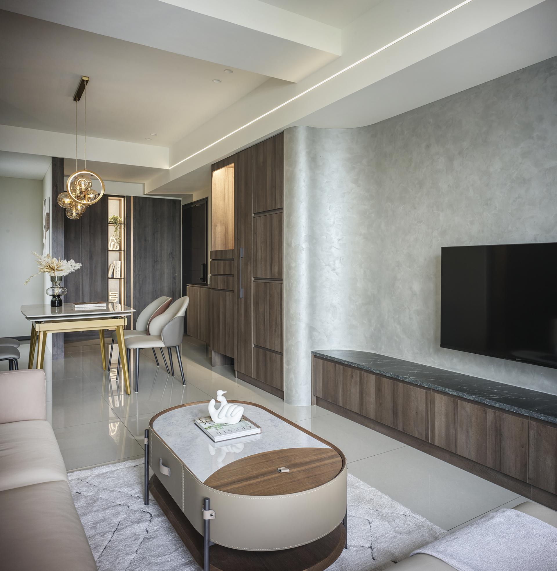 Within the 72.6 square meters public area, we integrated the cabinetry and television wall onto the same surface, including display cabinets, the TV wall, deep 60cm storage cabinets, an altar table, and entrance storage. Through visual continuity, we extended the perception of the limited space. The main television wall features a double-curved design created with understated luxurious "velvet paint," connecting the cabinetry and adding richness to the space.