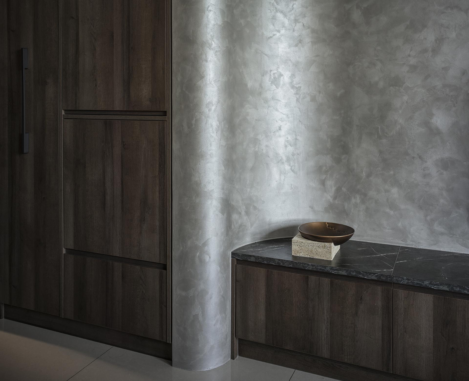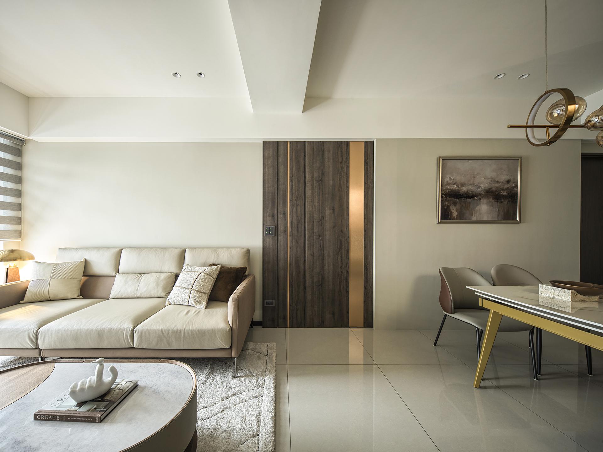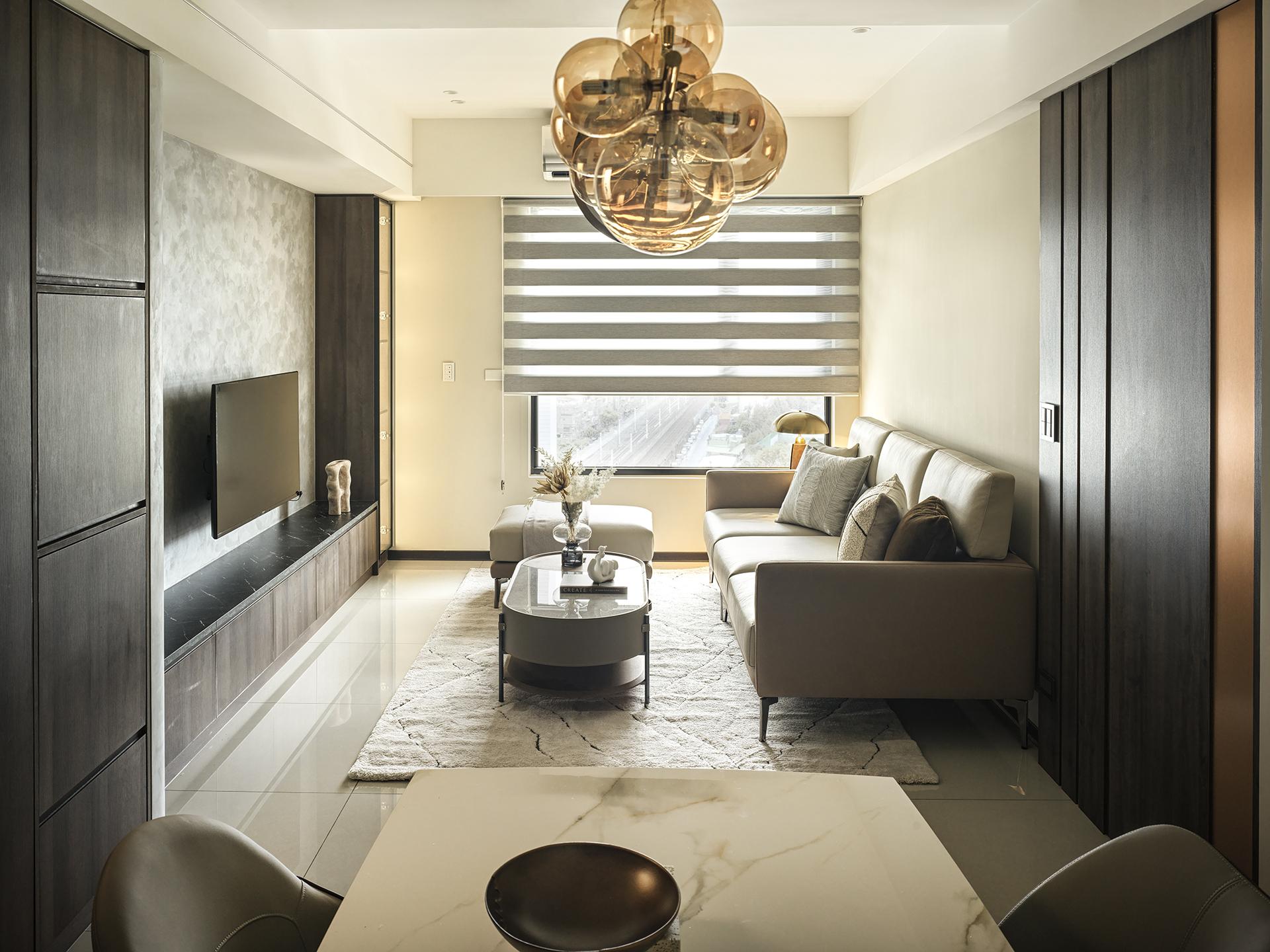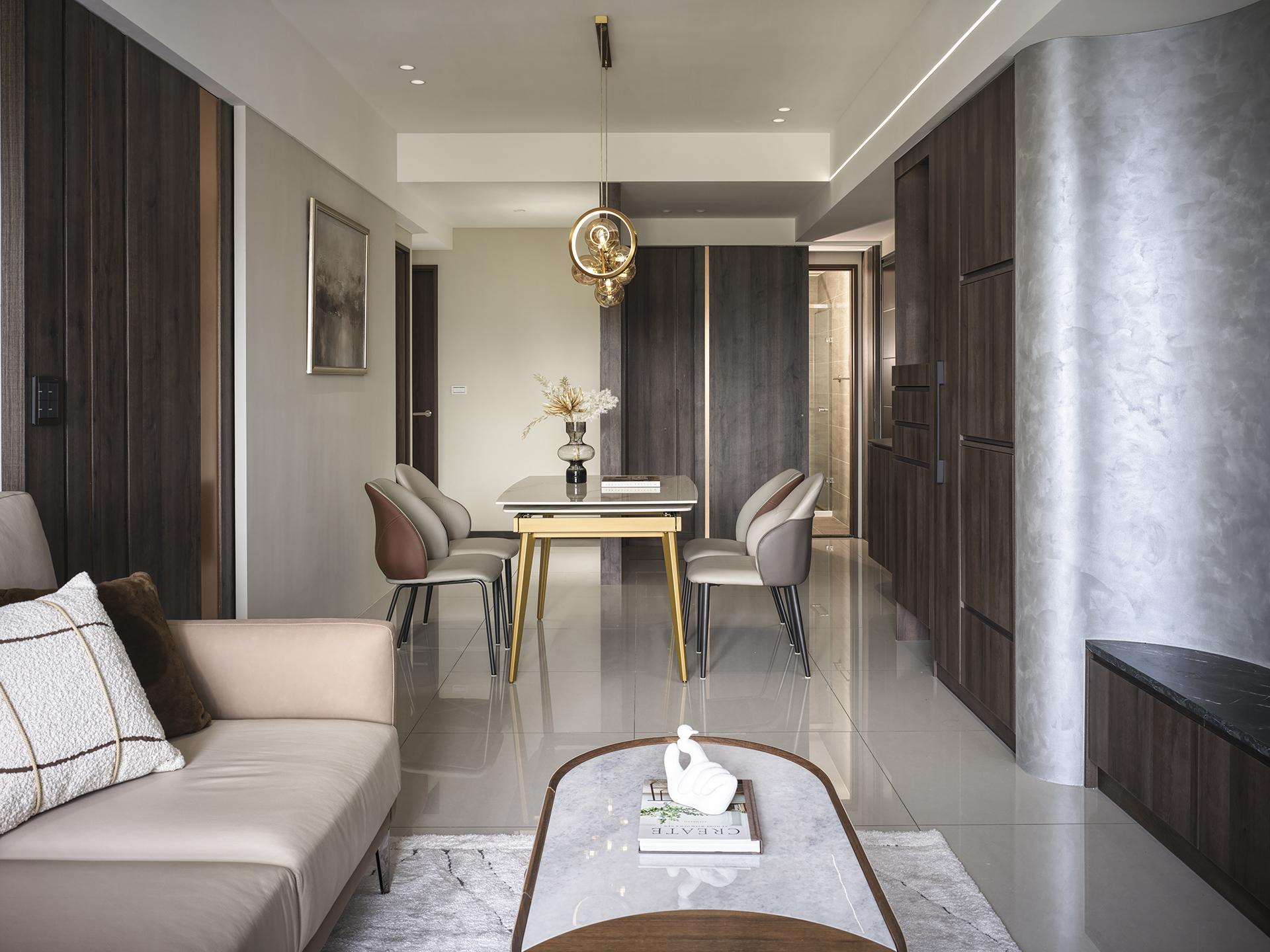 Within the 72.6 square meters public area, we integrated the cabinetry and television wall onto the same surface, including display cabinets, the TV wall, deep 60cm storage cabinets, an altar table, and entrance storage. Through visual continuity, we extended the perception of the limited space. The main television wall features a double-curved design created with understated luxurious "velvet paint," connecting the cabinetry and adding richness to the space.
