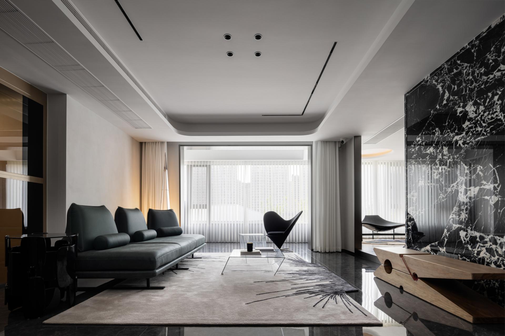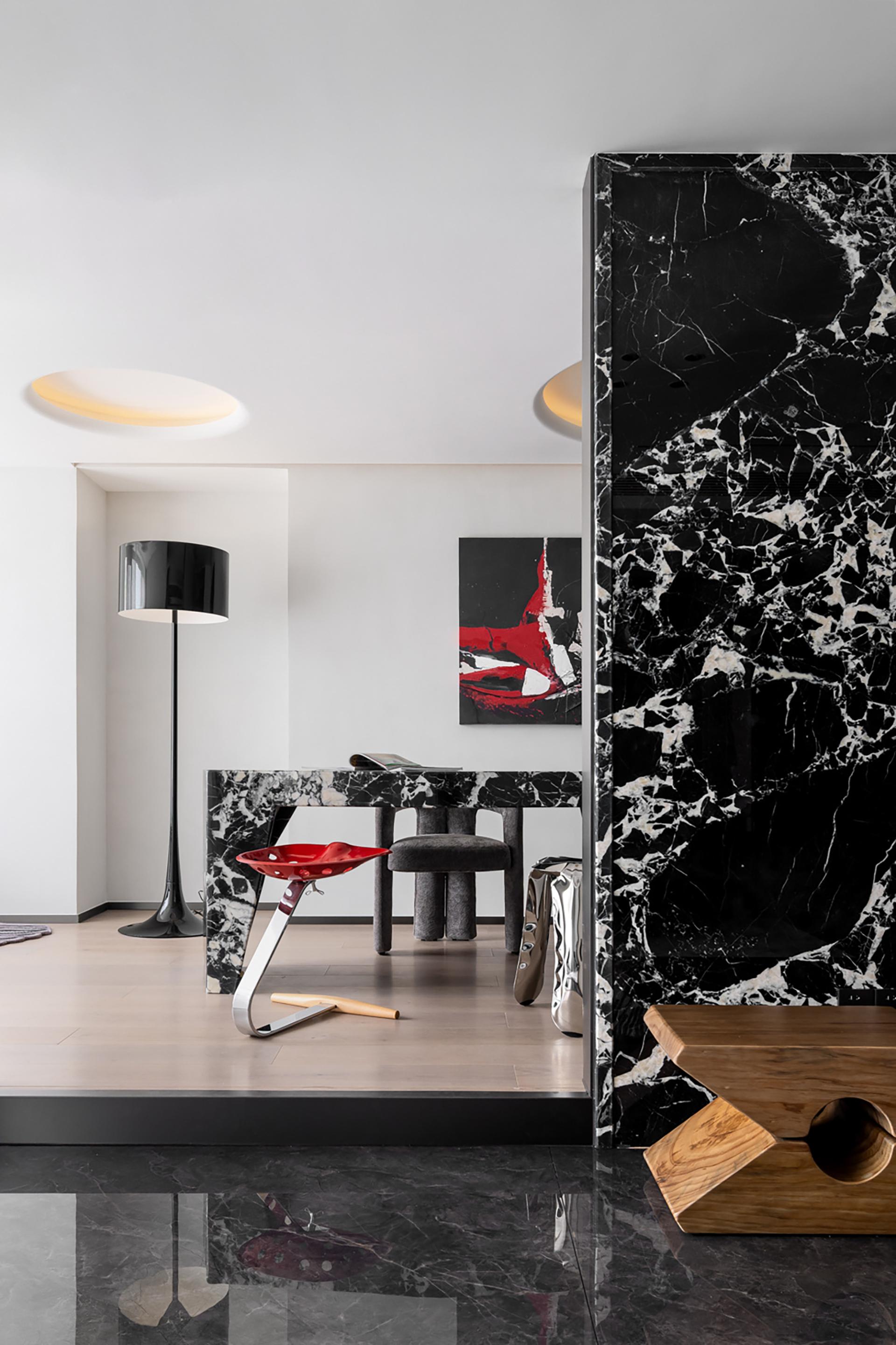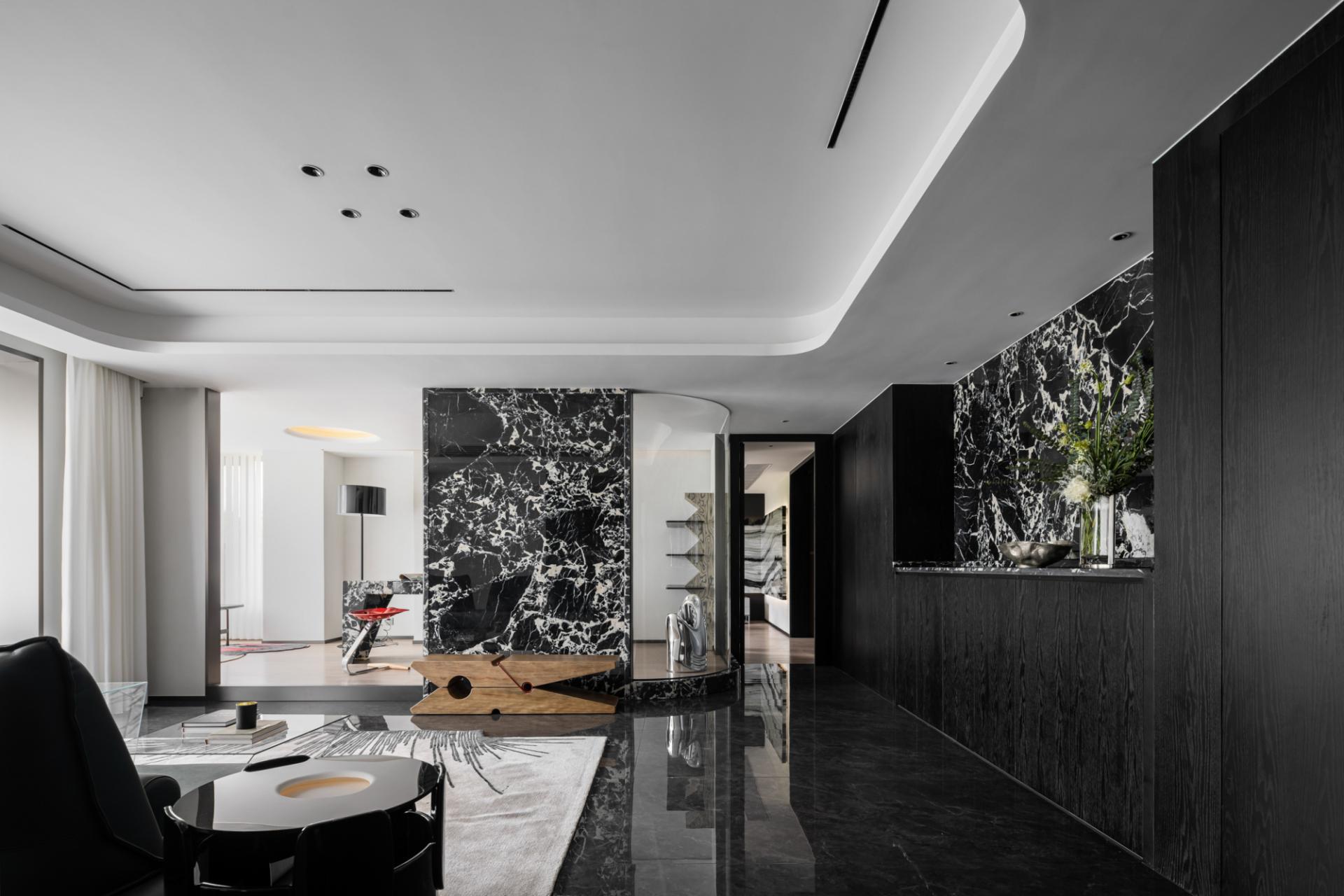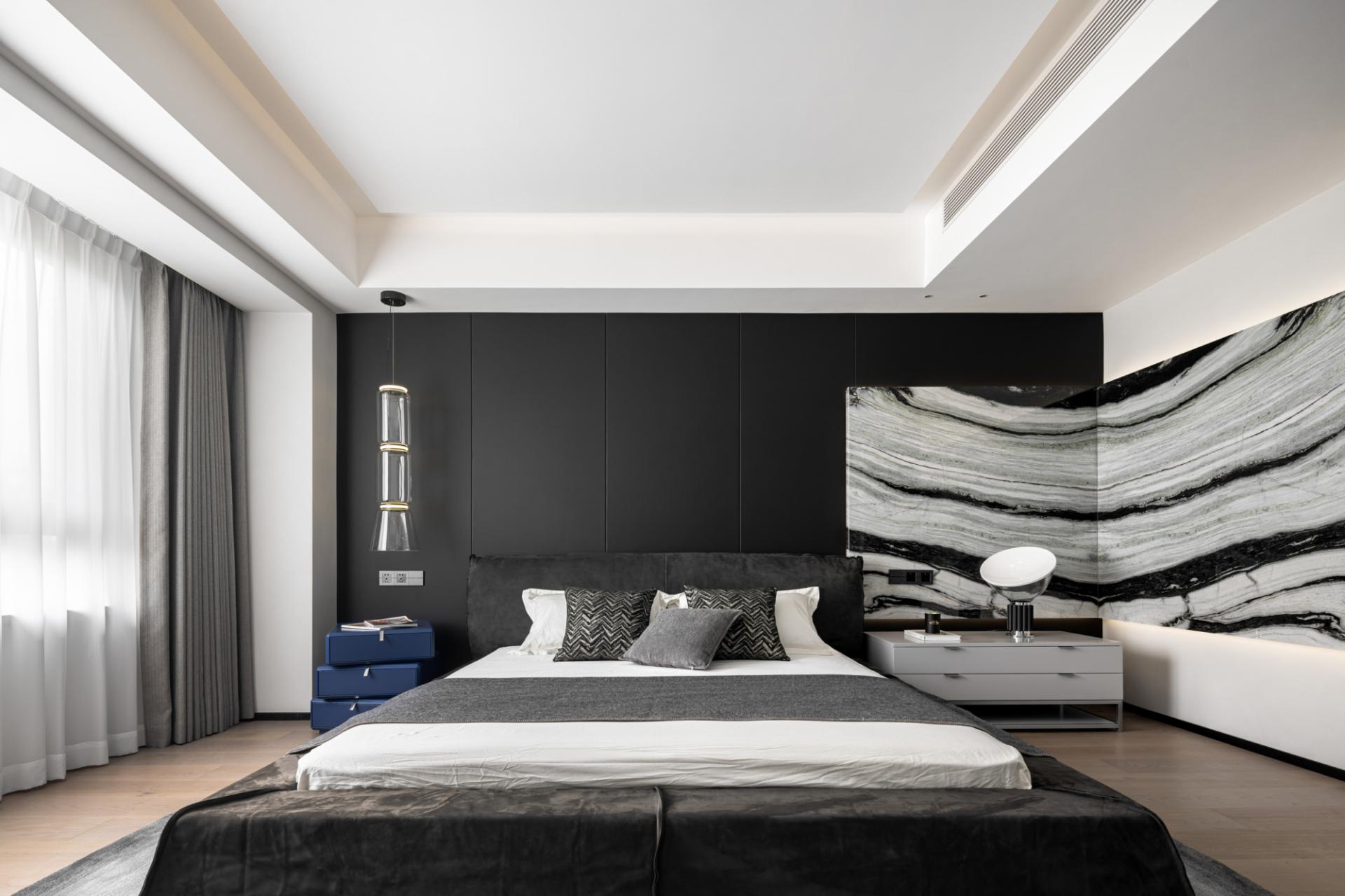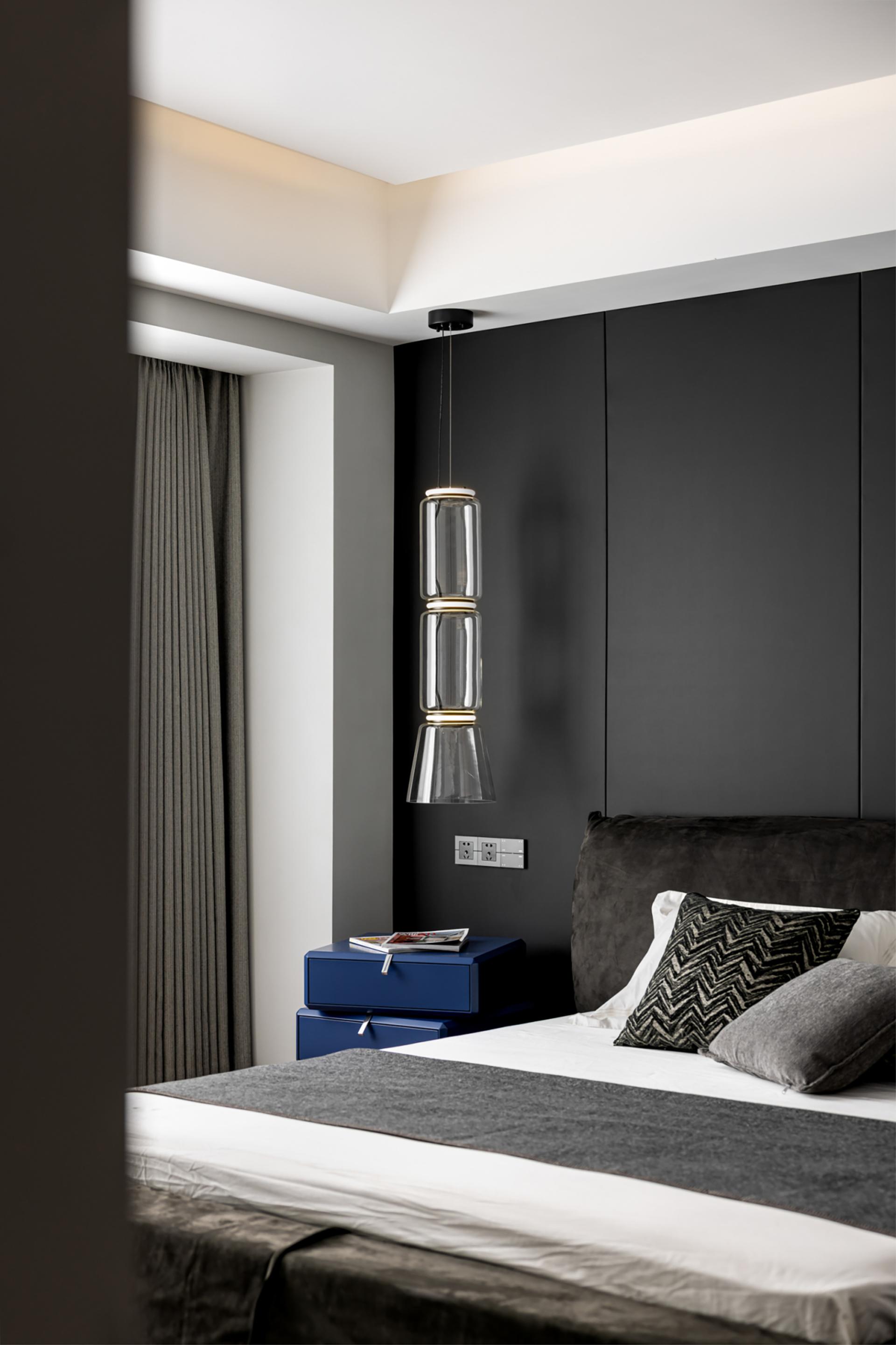 The owner likes the dark black style, but it should not be too dark. Later, considering that he will live with his family downstairs, the downstairs is the family's space and dining is downstairs, so the kitchen environment was not taken into consideration during the design. In the overall dark design, red pendants were added, and the walls were required to be white, which would make the overall look cleaner. The living room and study are in the same space, so the overall design is unified. The sofa is also dark green, without any abrupt colors in it, and the marble is more integrated as a whole. The master bedroom is also designed mainly in black, white and gray. The second bedroom needs a clean feeling, because the space is not very large and it will affect the aisle, so a hard-covered background wall is chosen as the bed backrest. The children's room is mainly neutral in color, and a regular bed is made to meet the needs of the child's birth and the unknown gender.