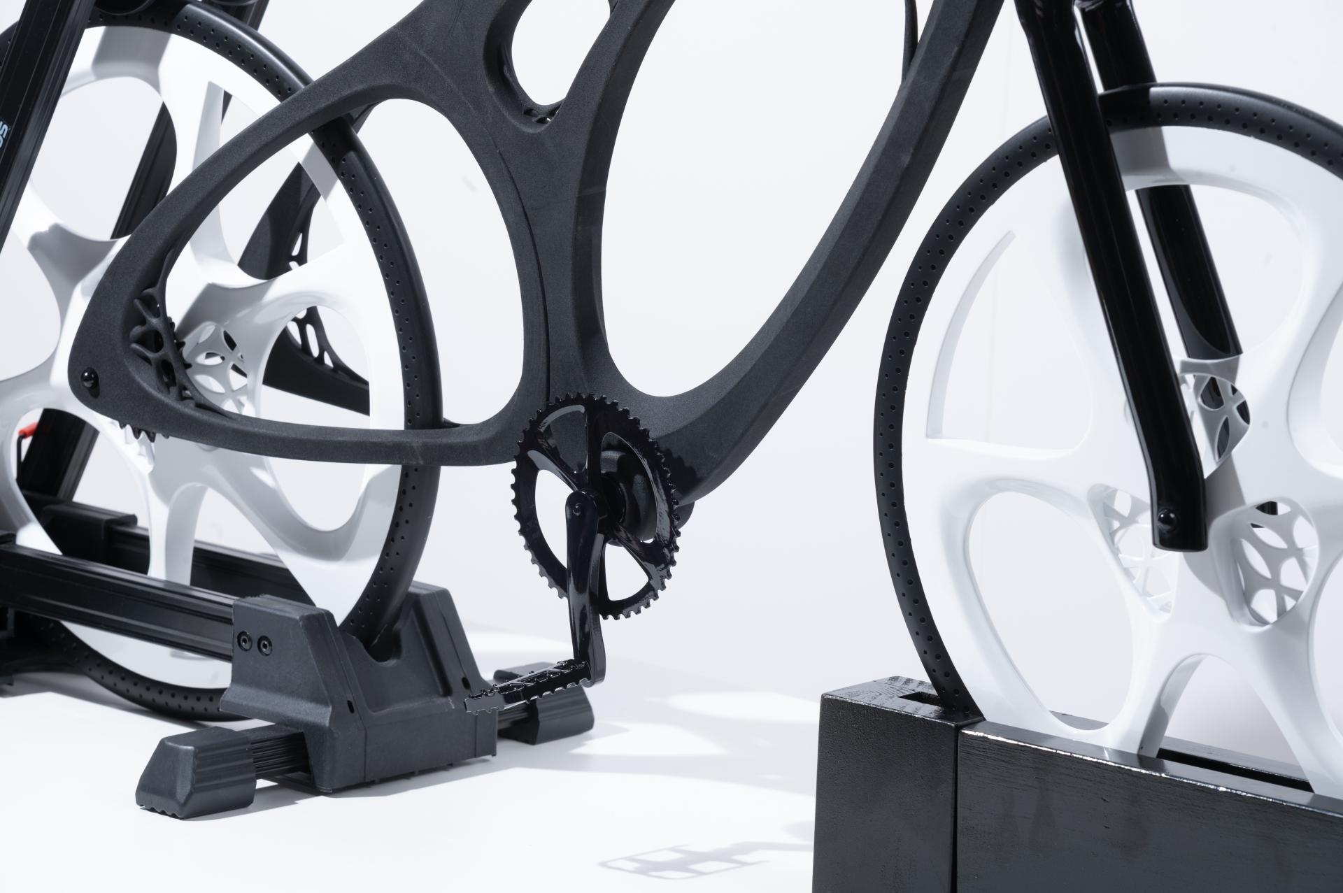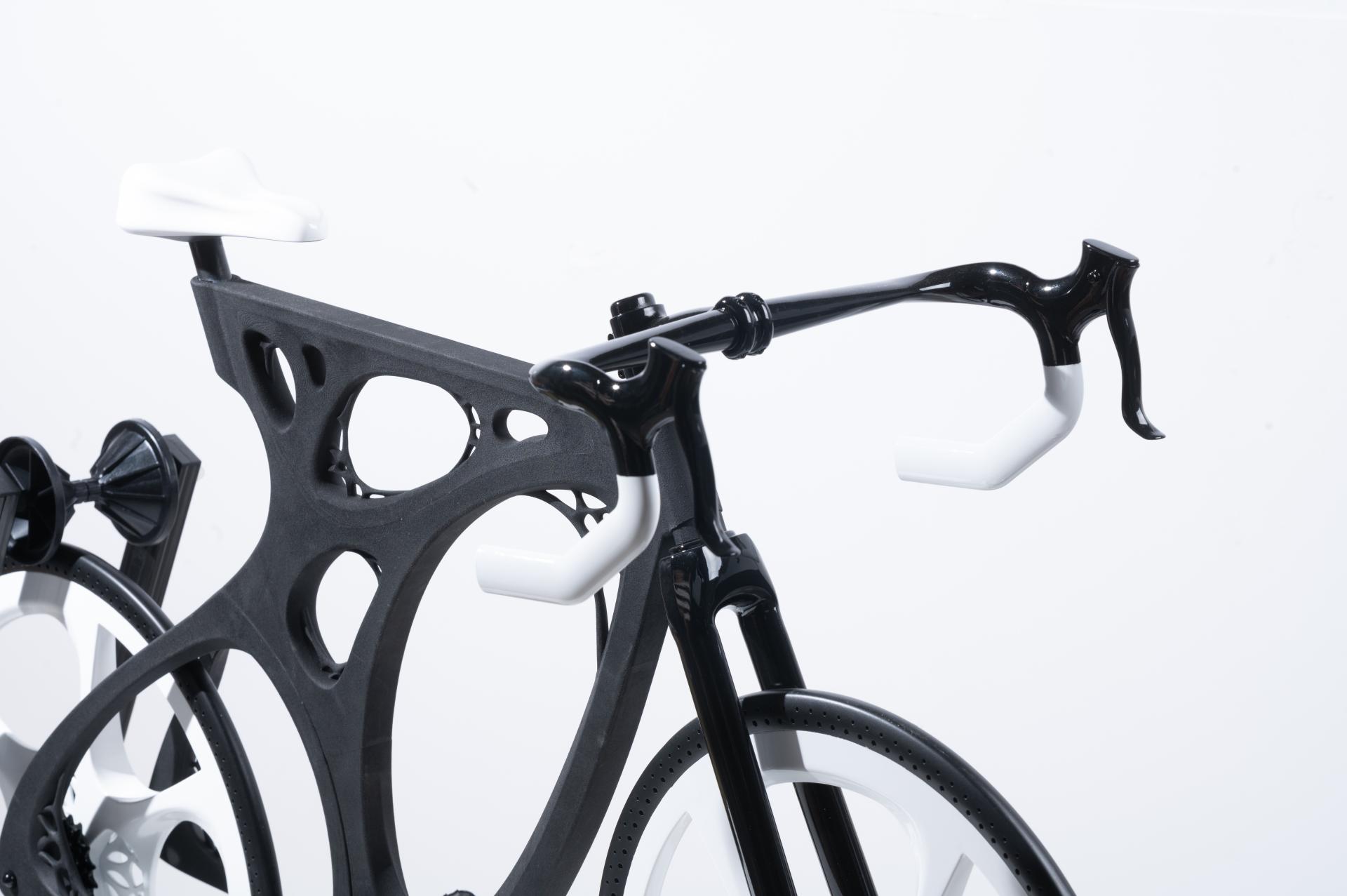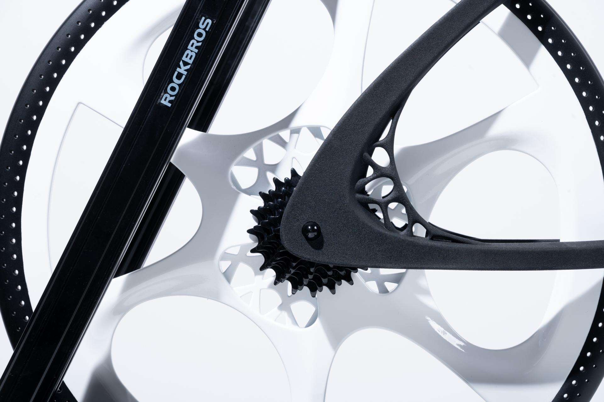 The bike frame adopts a bio-inspired mesh structure generated through algorithmic design, blending futuristic technology with natural aesthetics for a visually striking and emotionally resonant product form.