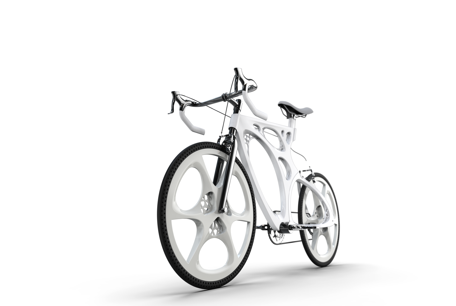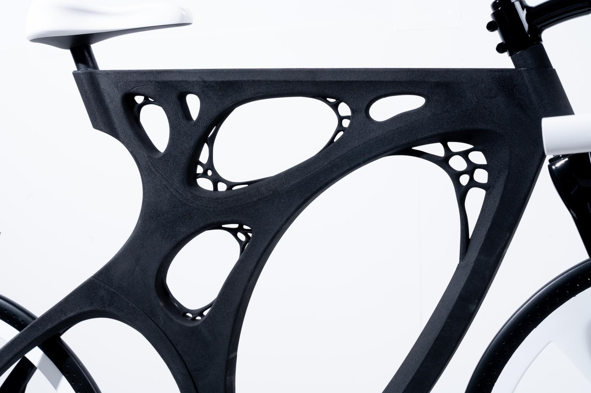The bicycle frame is redesigned using topology optimization algorithms based on mechanical stress analysis. This method retains essential structural elements while eliminating redundant material, achieving a lightweight yet robust frame with an organic aesthetic.