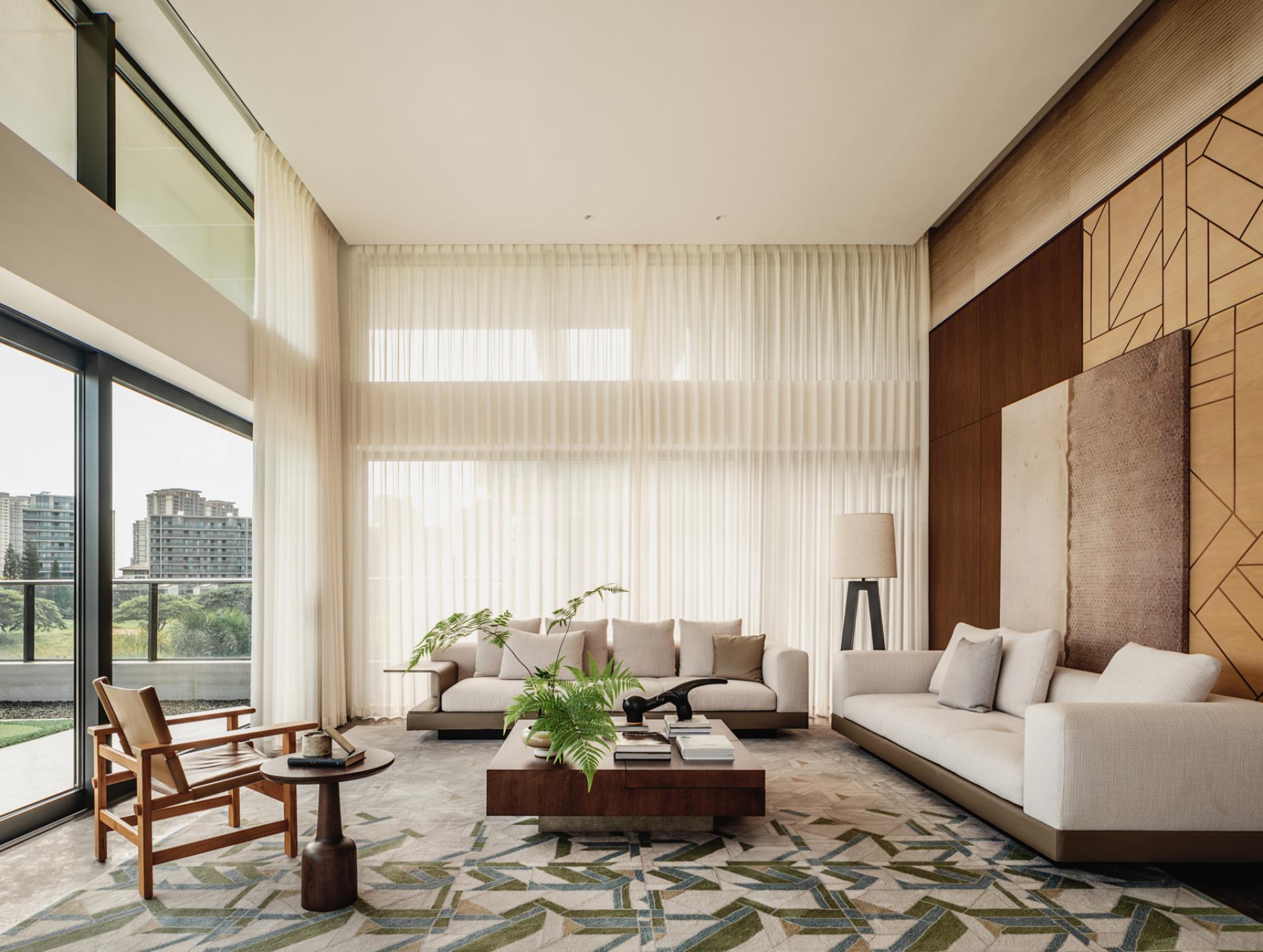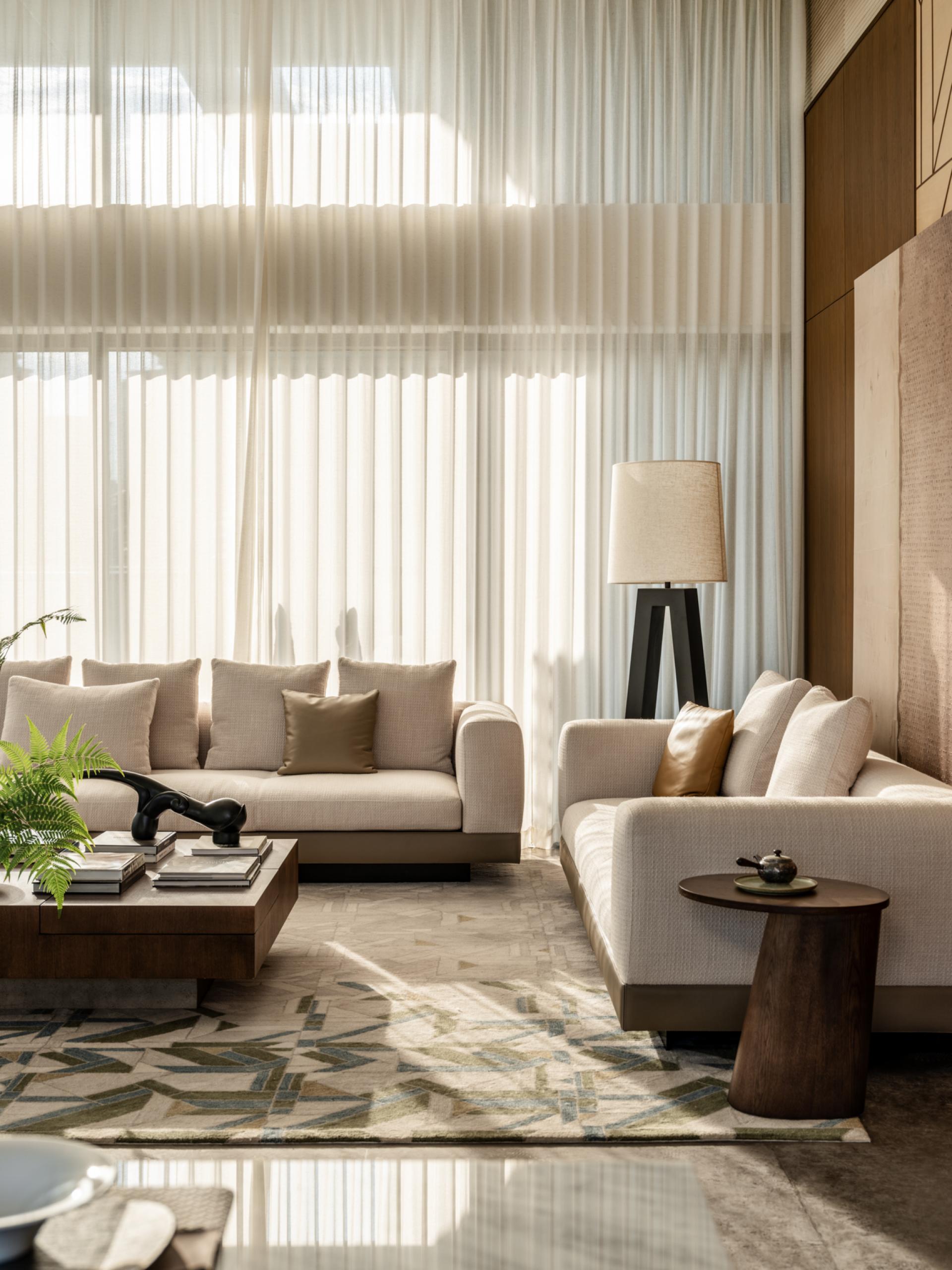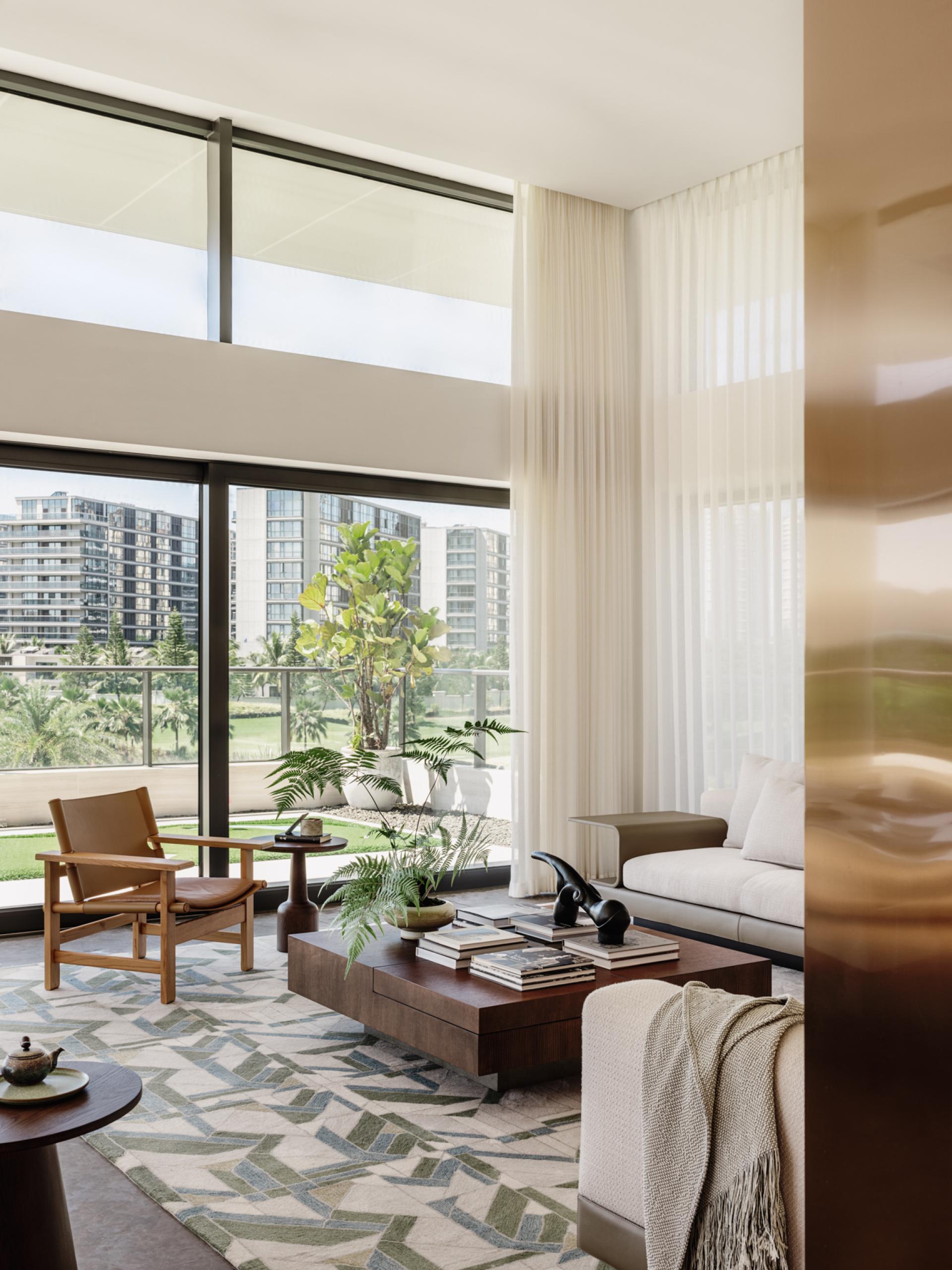 Brown cabinetry, coffee tables, and cushions resemble the soil beneath palm tree trunks, marking the space with a sense of stability. The interplay of colors and geometric patterns on the rugs and walls forms a perfect dialogue, presenting a refined and understated sense of luxury—a balance between simplicity and intricacy.