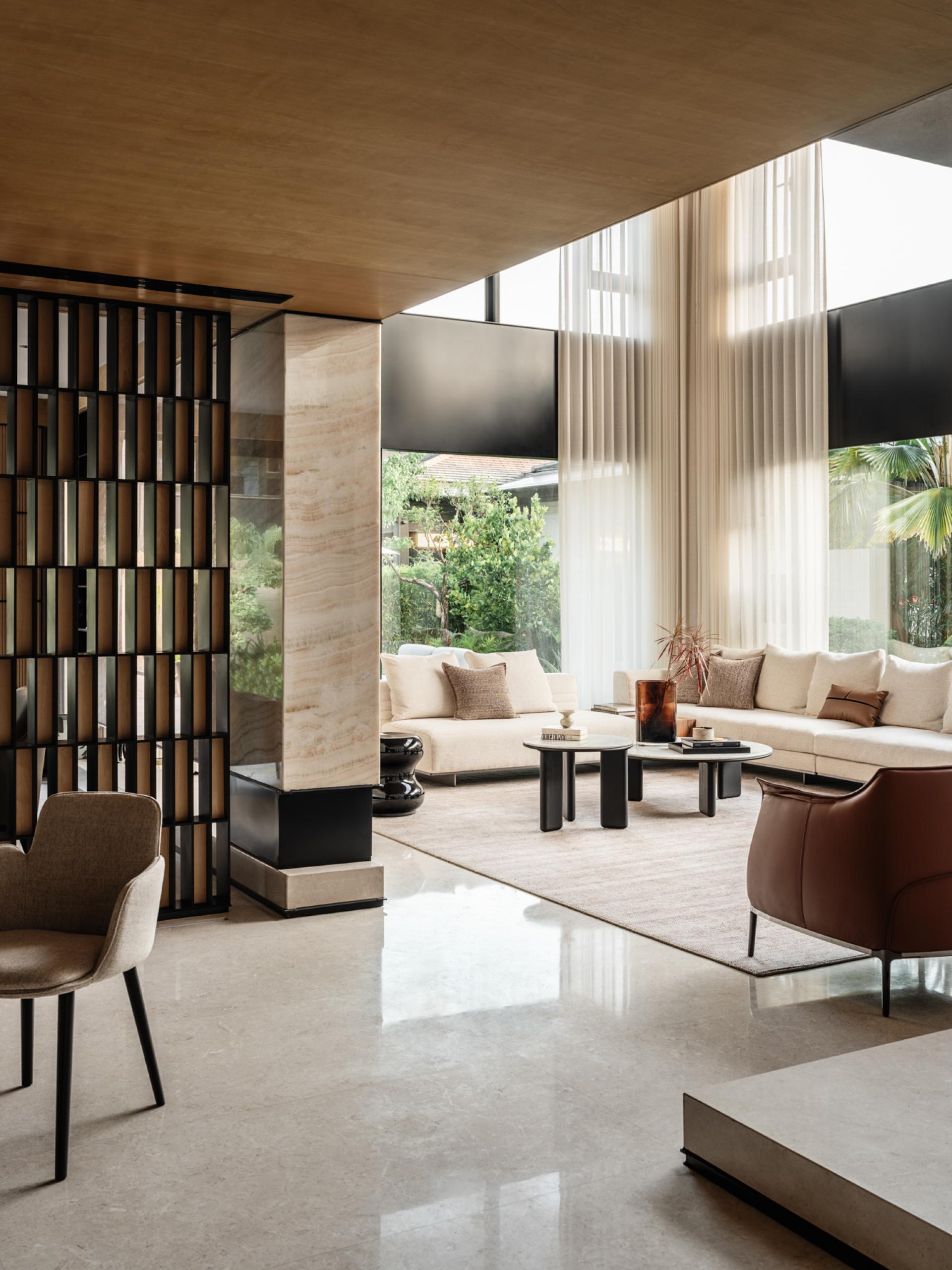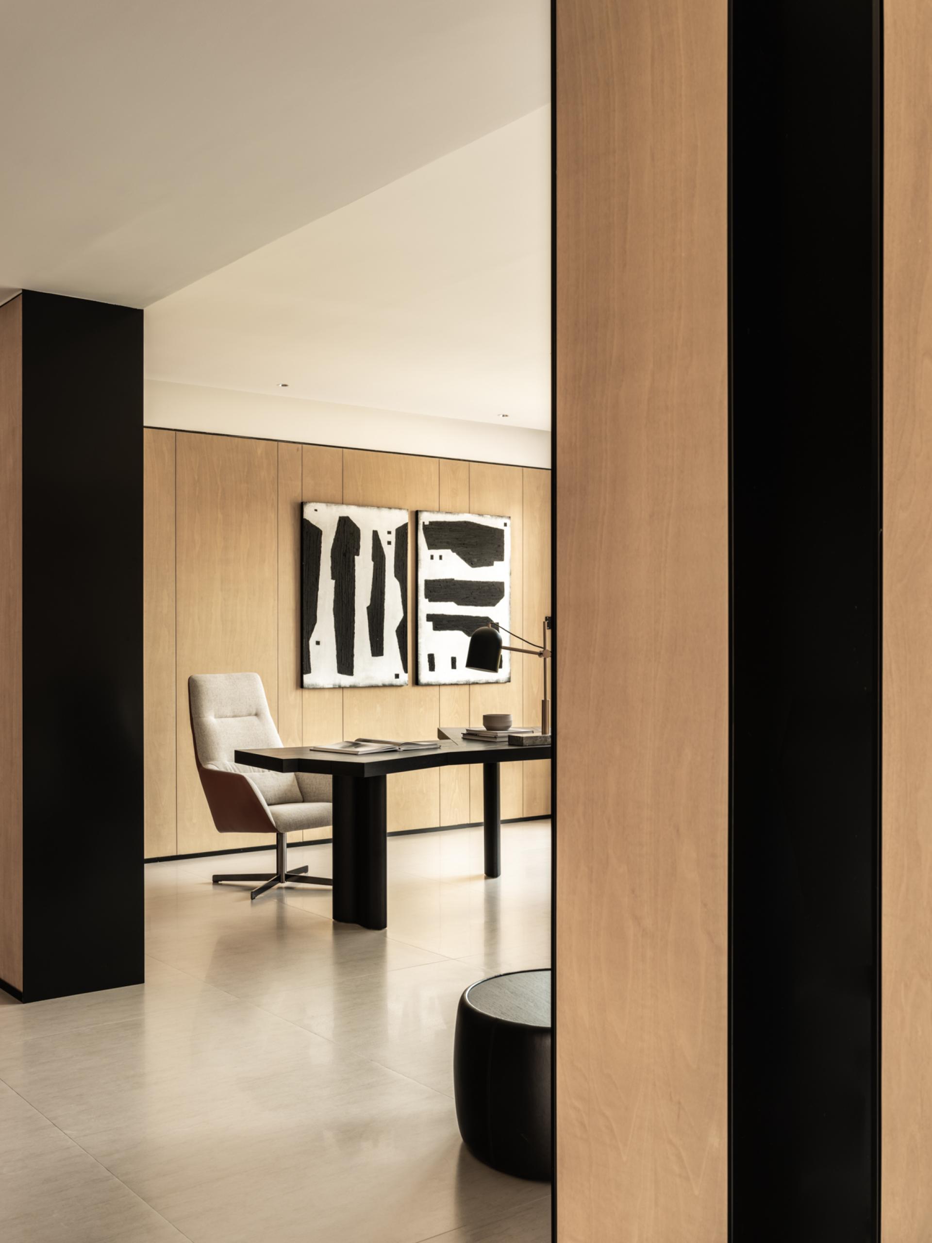 The study, paired with a conversation zone, embodies intellectual depth. Soft textiles and understated furnishings convey quiet sophistication, while bold monochromatic artworks and an organically shaped desk elevate the identity of the space, enriching its visual language and layering.