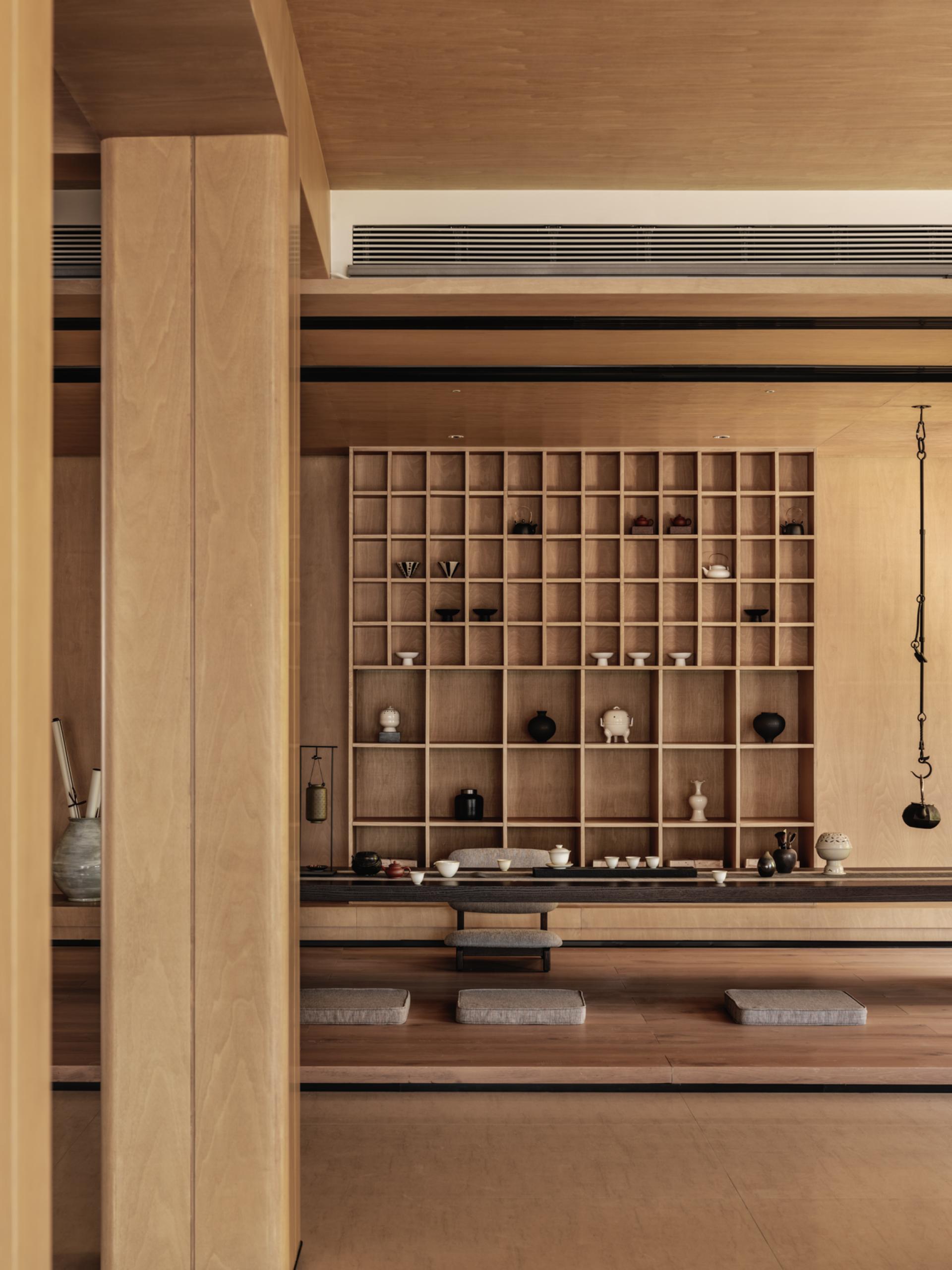 In the tea and chess area, understated natural materials establish a tone of refined simplicity. The use of negative space becomes a key design strategy, allowing every object to breathe—to be showcased independently, without visual clutter, in a rhythm of balance and calm.