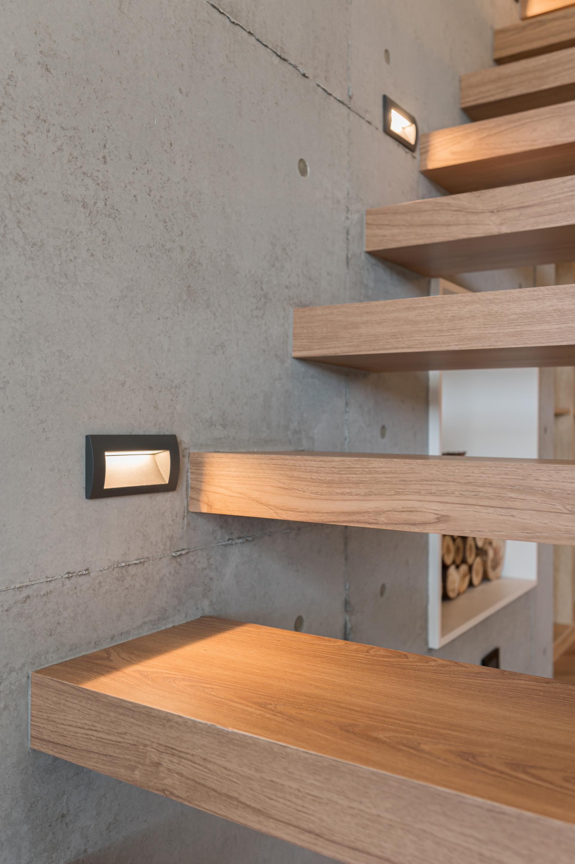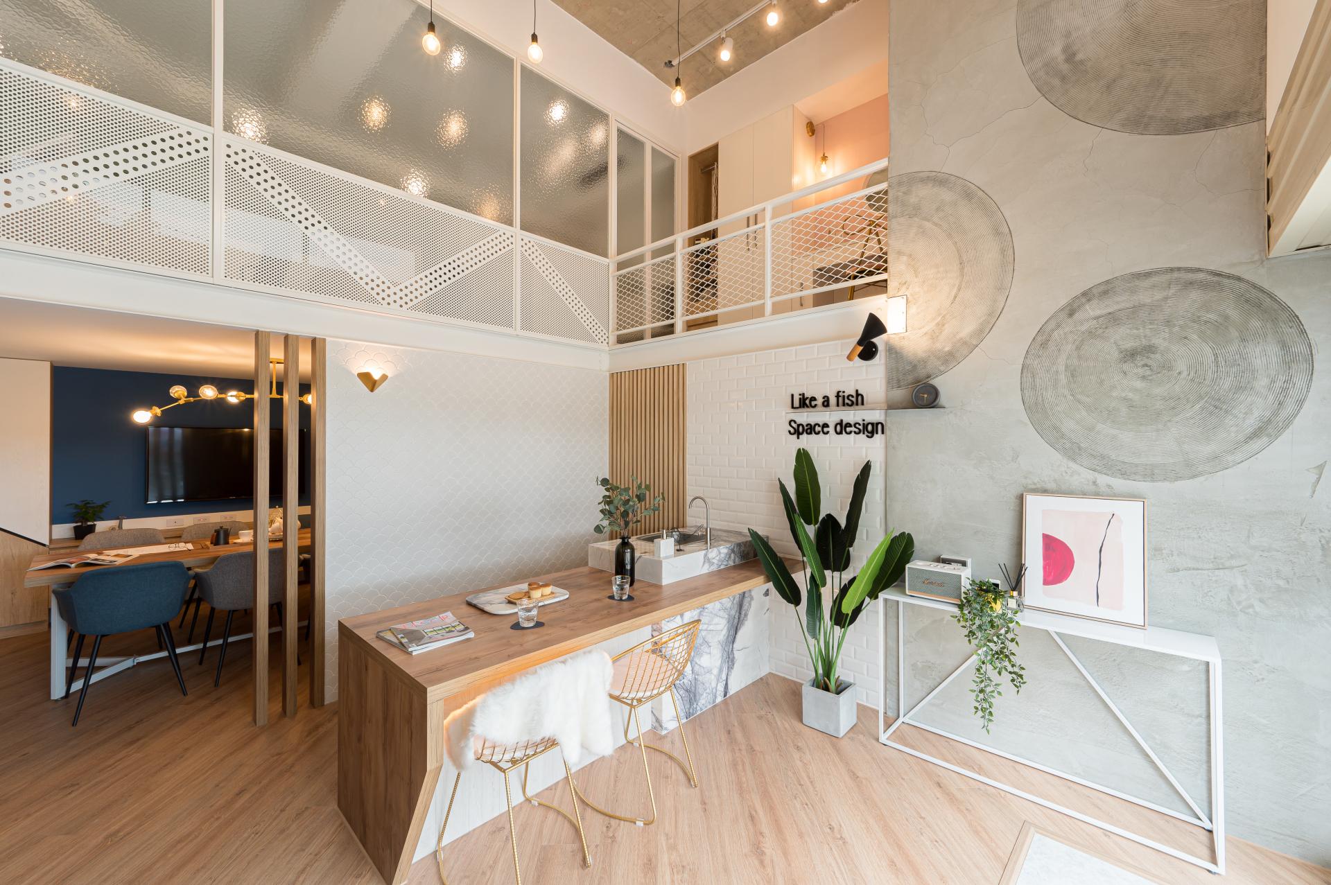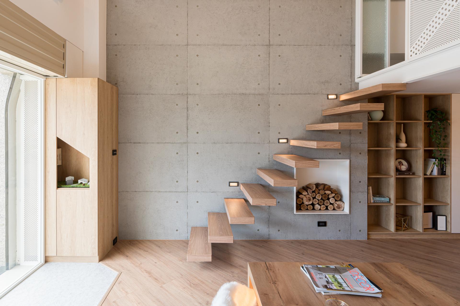 懸空樓梯是空間的視覺焦點,其設計以簡潔的線條與精準的結構支撐,體現了現代建築的工藝極限。中島的檯面選用天然石材,每一塊石材的紋理都獨一無二,彰顯了奢華的細節與自然的魅力。空間的整體色調以灰、木、白為主,營造出低調而高雅的氛圍,同時透過光線的引入,讓天然材料的質感在不同時間呈現出豐富的層次。