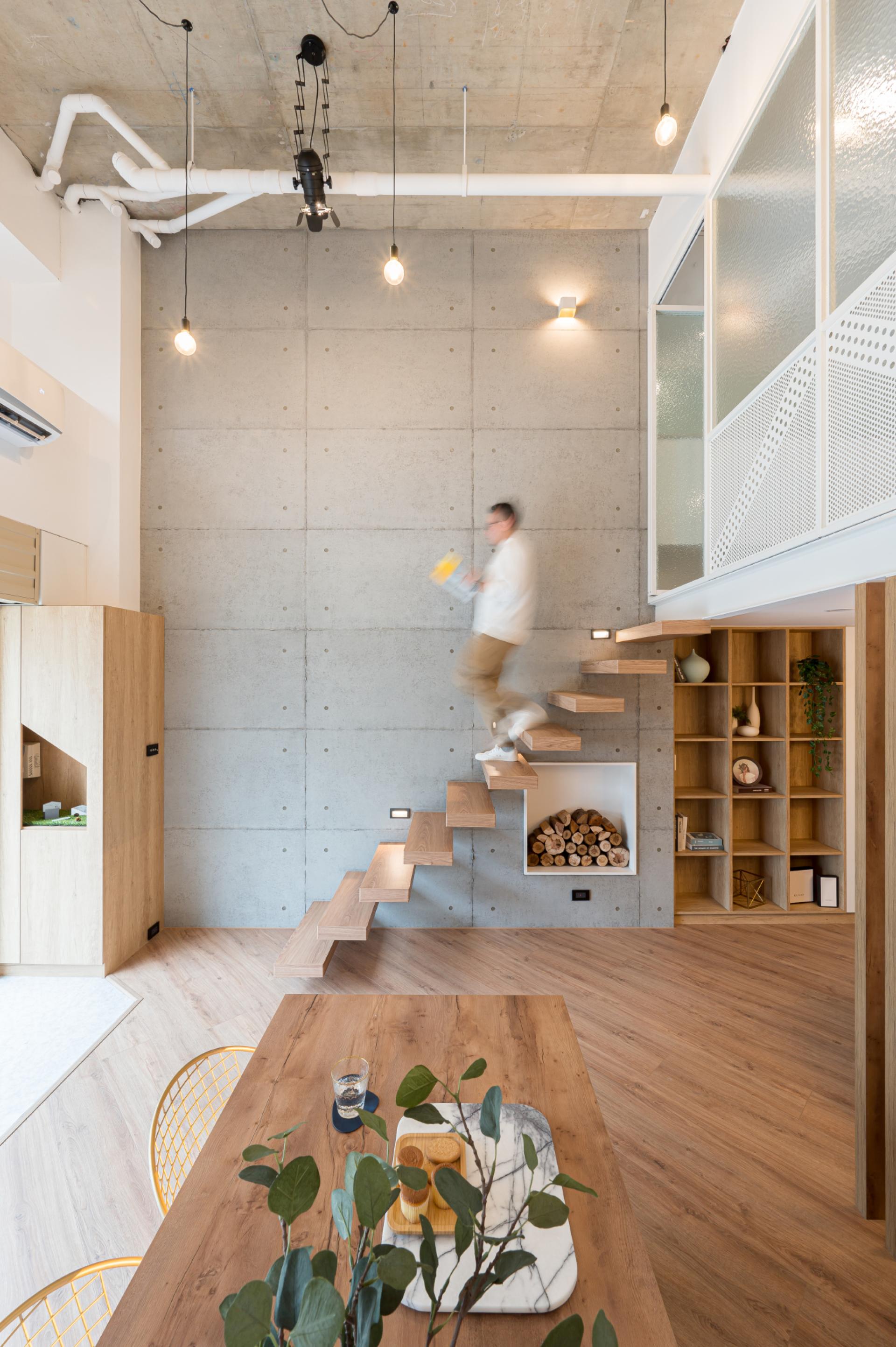在這個辦公空間的設計中,我們以天然材料作為核心元素,詮釋了簡約即奢侈的完美平衡。空間的主體結構以裸露的混凝土牆面呈現,曼刀痕的紋理賦予了空間原始的質感與力量感。搭配天然的木紋面,柔化了混凝土的冷硬,營造出溫暖而專業的氛圍。鐵件的運用則以精緻的線條點綴空間,如懸空樓梯的扶手與框架,展現了結構的美學與技術的挑戰。