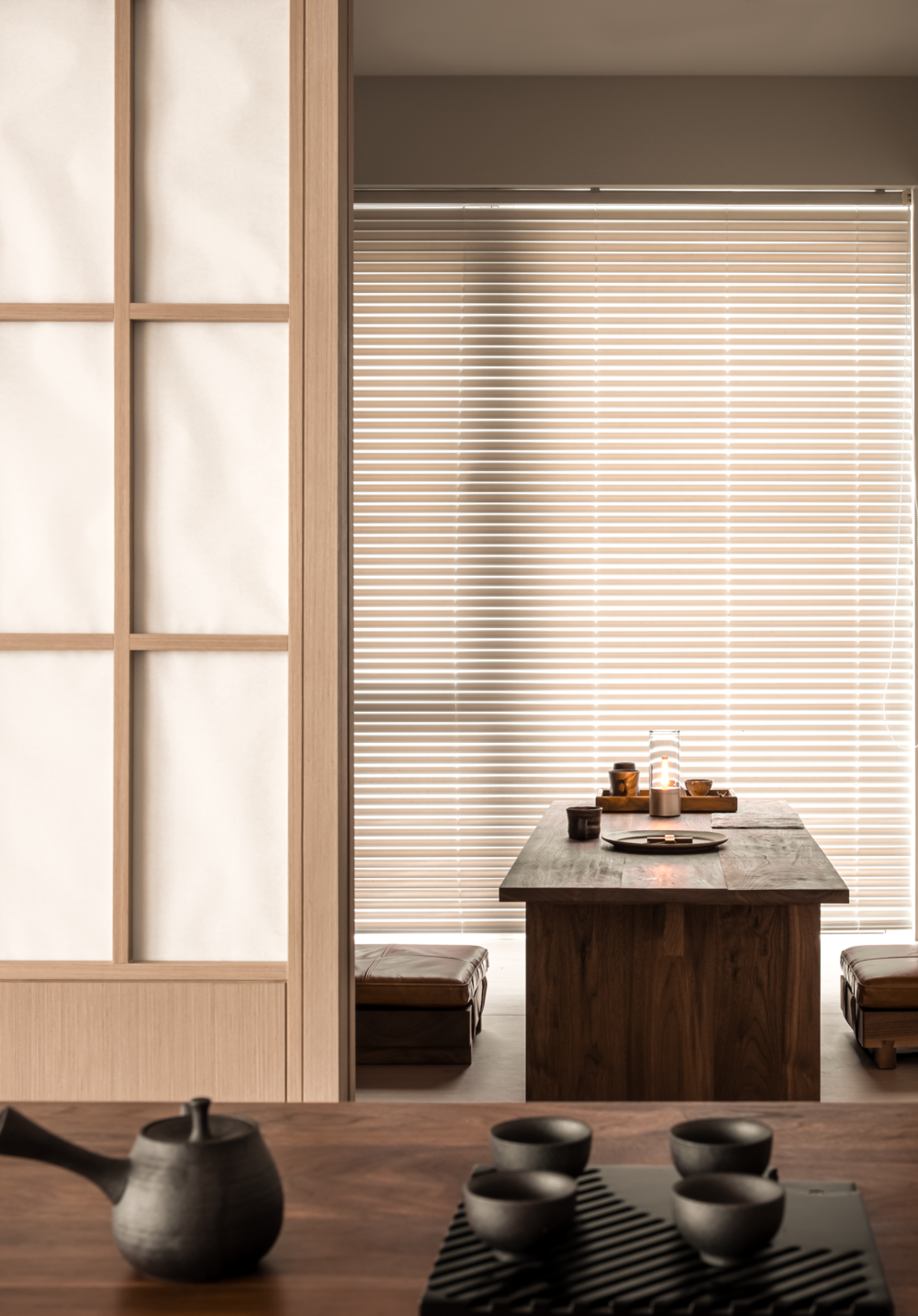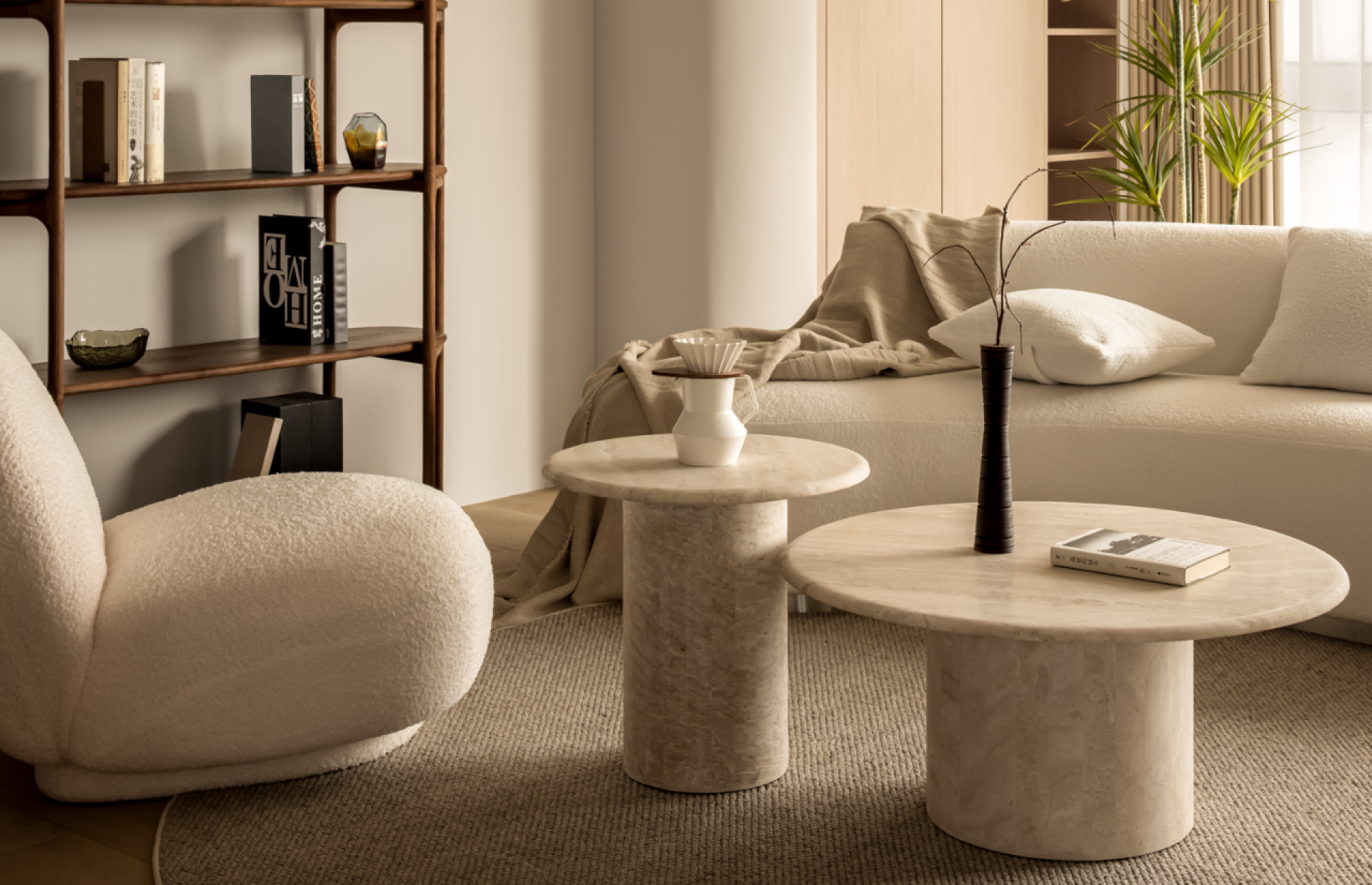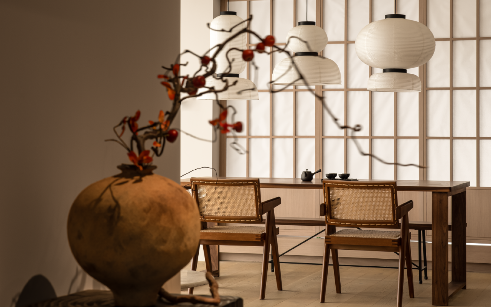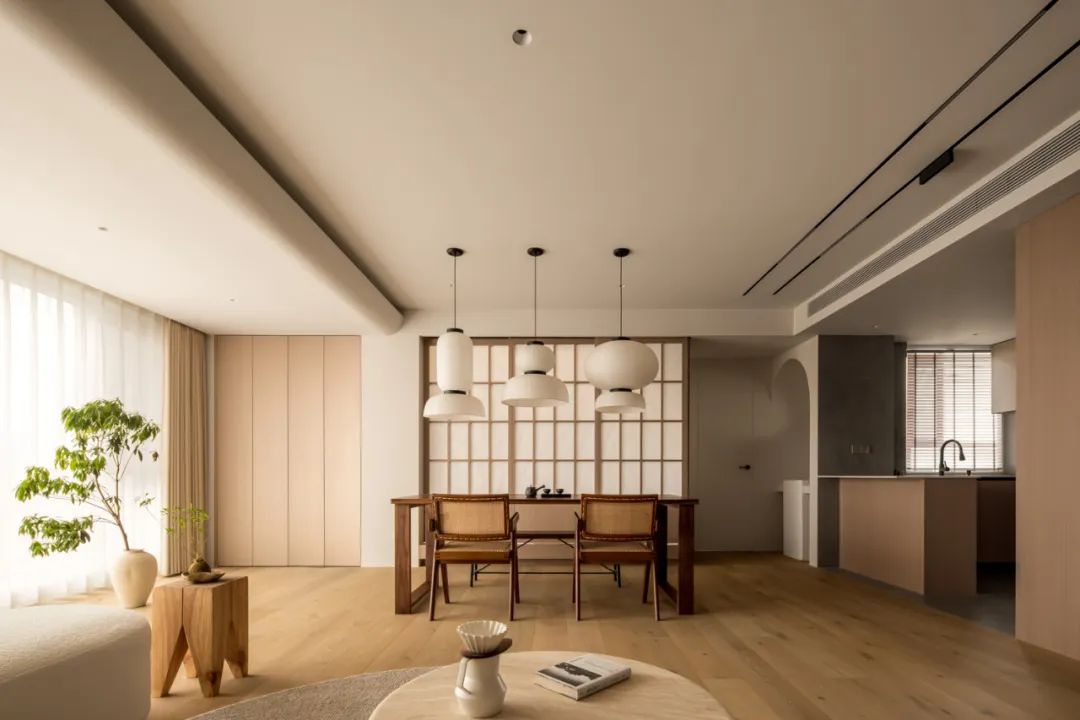 This design masterfully blends creamy tones with the Japanese wabi-sabi aesthetic, creating a living environment that is both warm and serene. The overall design features soft creamy hues as the main palette, establishing a cozy and inviting atmosphere. At the same time, clean lines and natural materials highlight the understated elegance and tranquility characteristic of Japanese wabi-sabi.