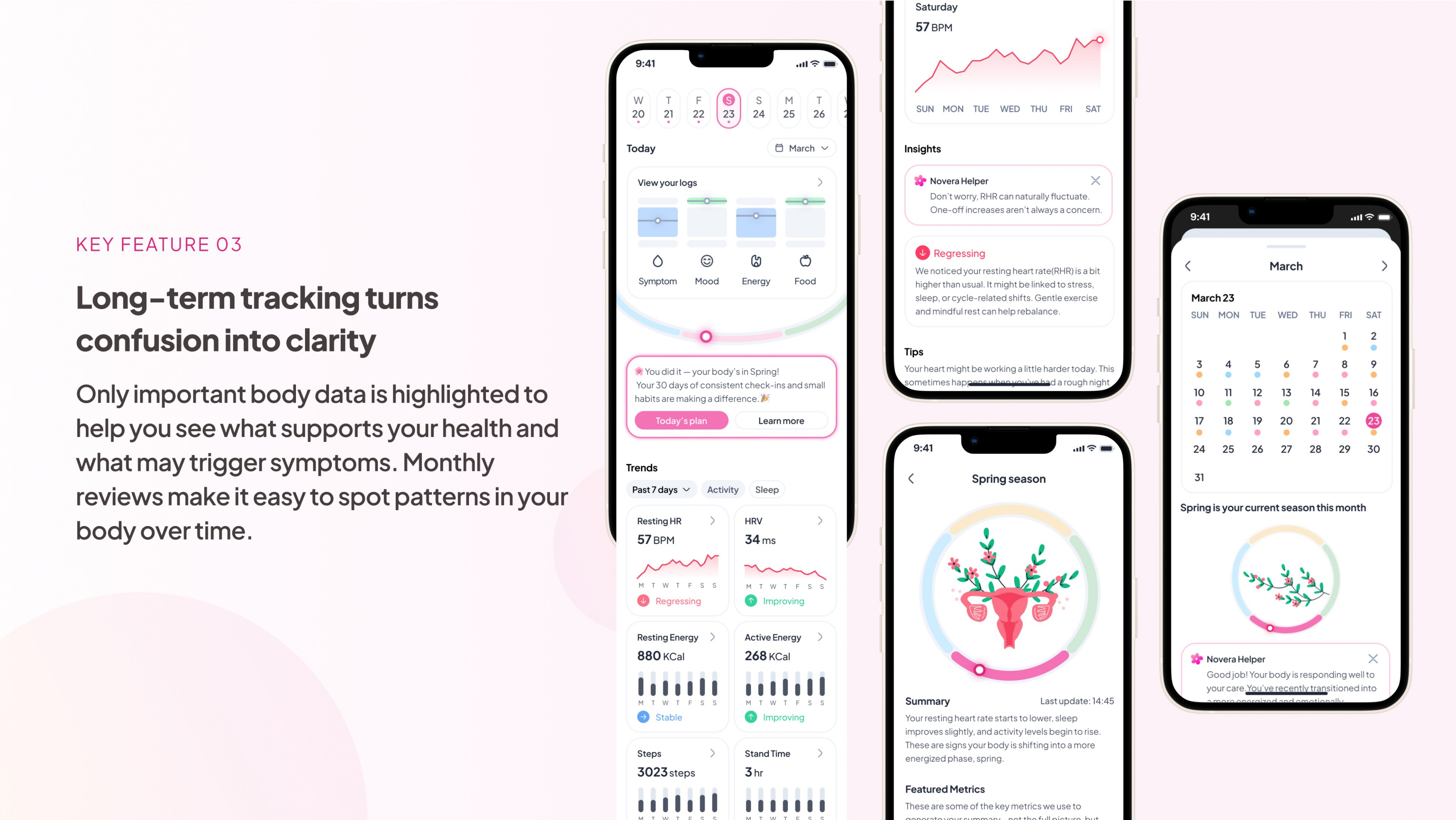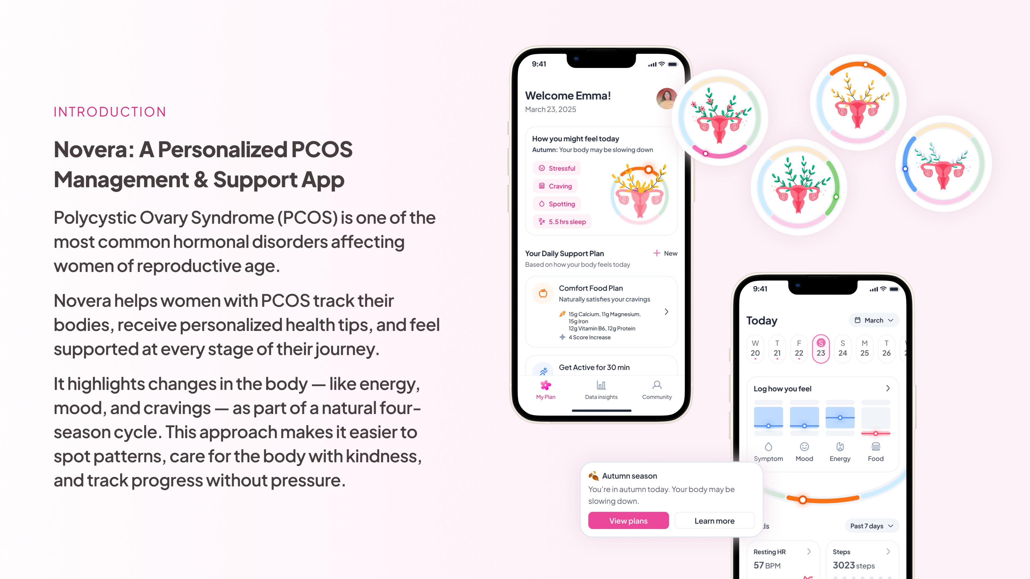Key features include AI-powered personalized plans, long-term symptom tracking, and smart insights that combine wearable data with passive and active tracking. Novera helps users spot trends, stay consistent, and celebrate progress. Instead of overwhelming users with charts and numbers, the app introduces a seasonal metaphor to visualize health rhythms. This helps transform hormonal changes into a cycle of growth and reflection, not shame or confusion.