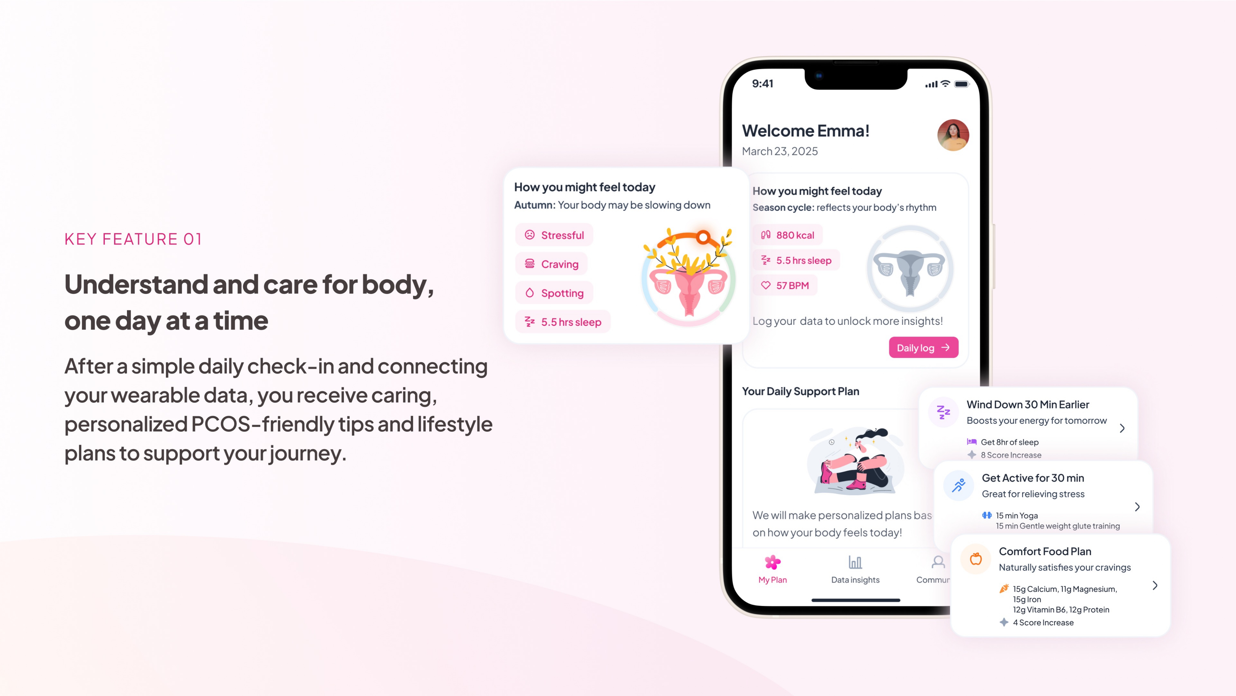 Novera’s interface is designed to feel calm and affirming, with warm visuals, narrative prompts, and soothing microinteractions that turn daily engagement into a moment of self-care. It’s not about fixing the body. It’s about honoring it.