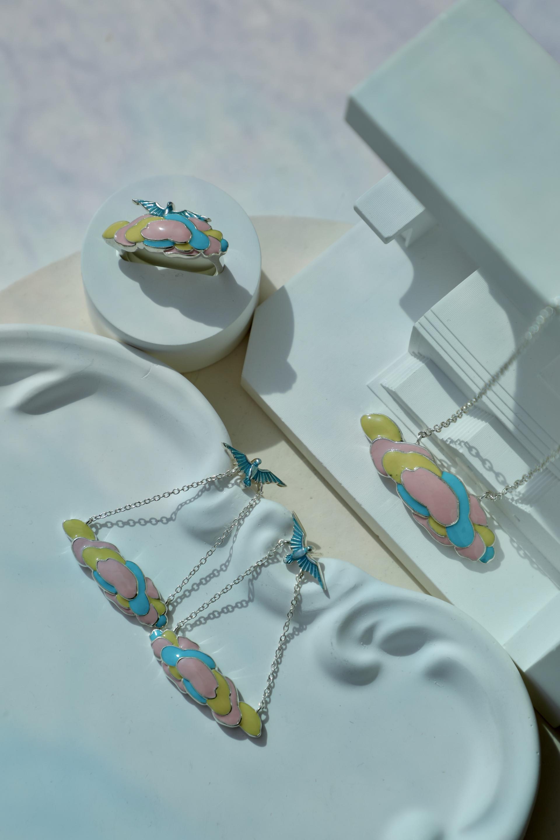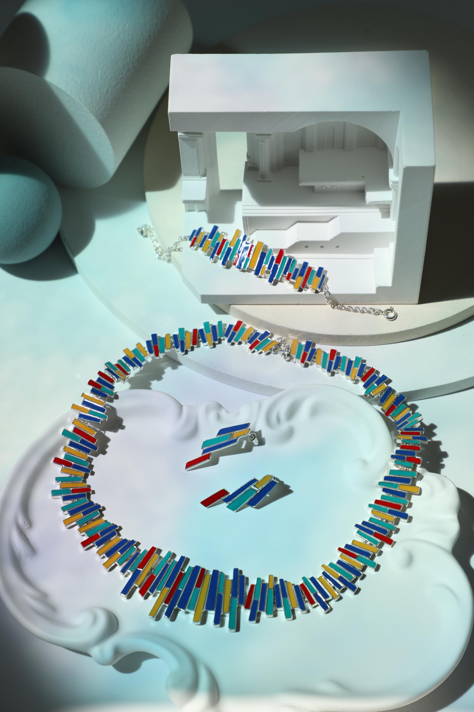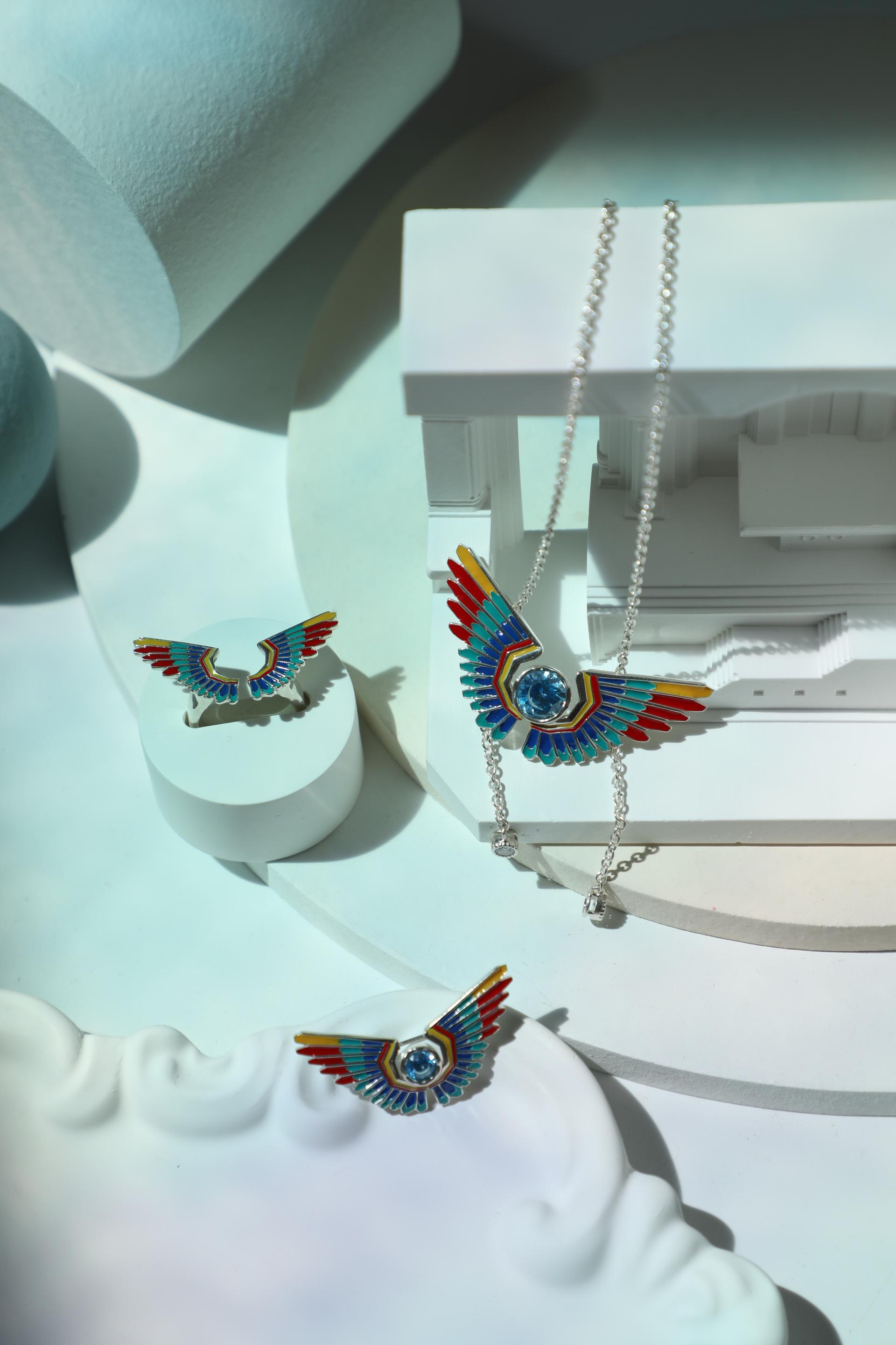 The Divine Admiration inspired by the stained glass windows of Macau’s 17 historic churches, the ' Divine Admiration ' jewelry series translates sacred artistry into wearable design. The five-piece collection reinterprets biblical scenes, geometric abstractions, and floral motifs from the windows, crafted in silver with vibrant enamel accents and colored gemstone embellishments.