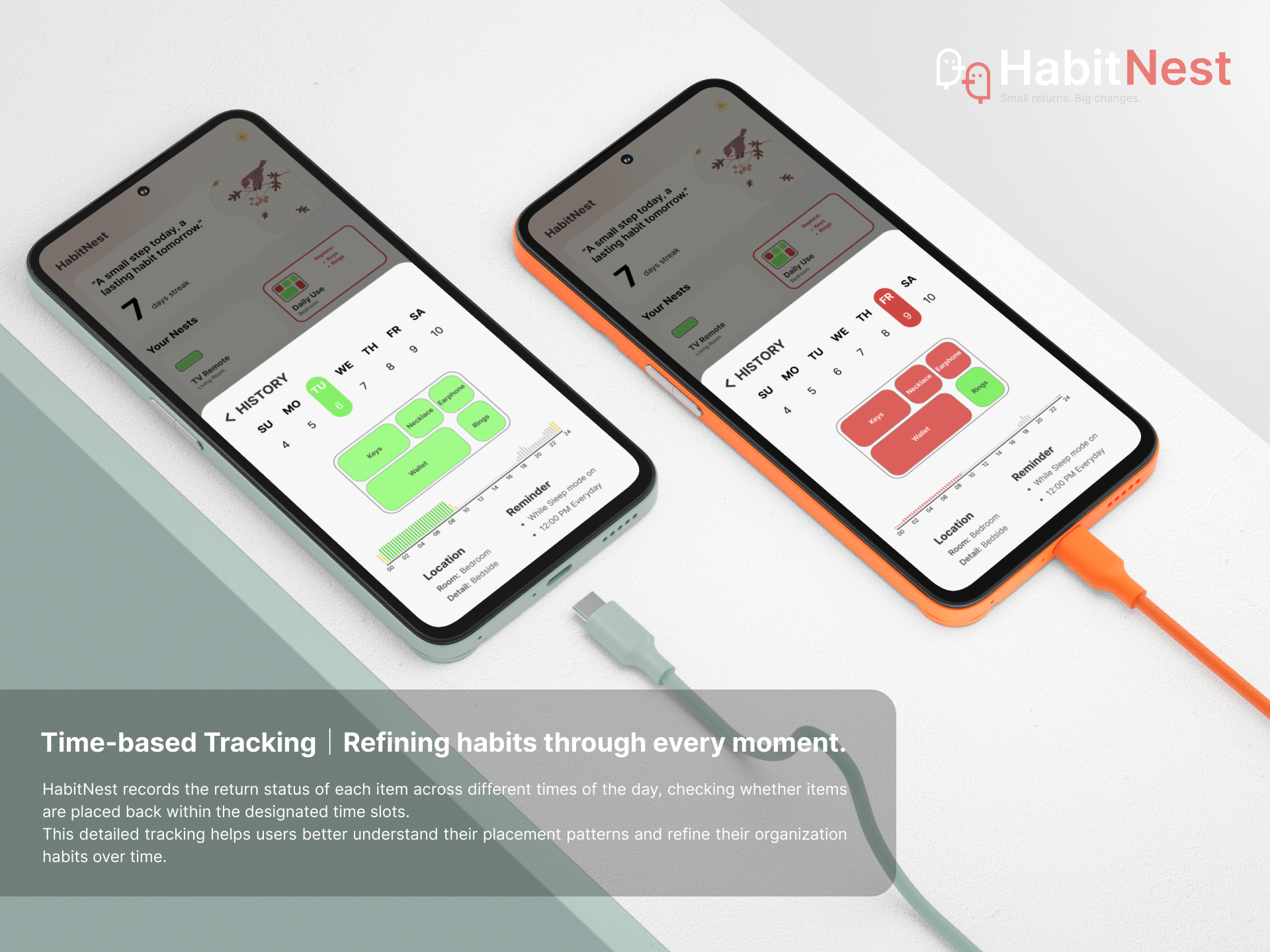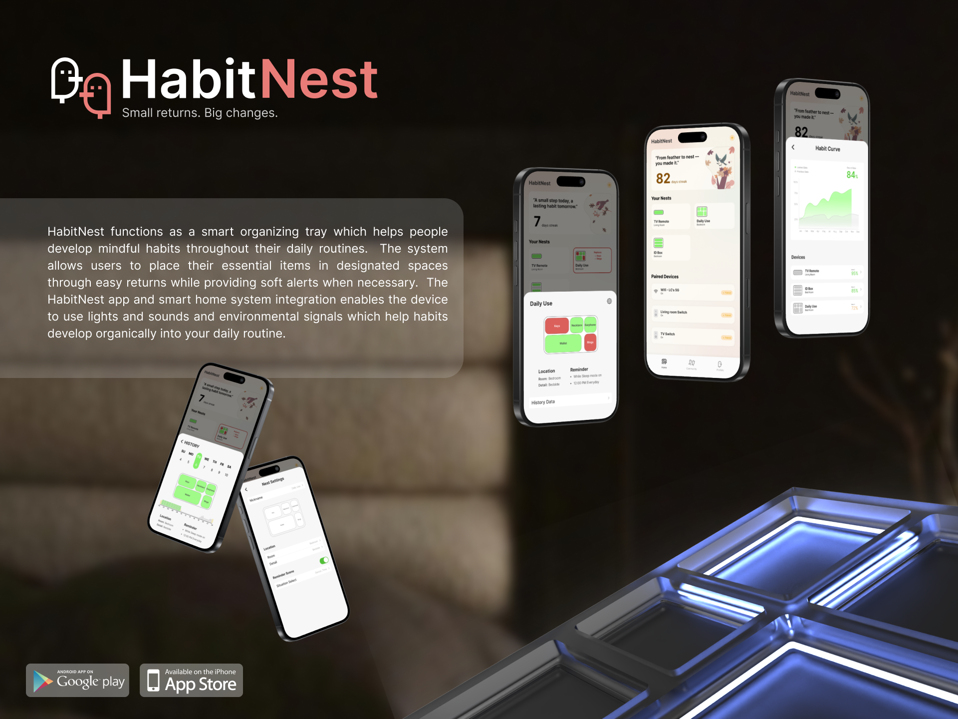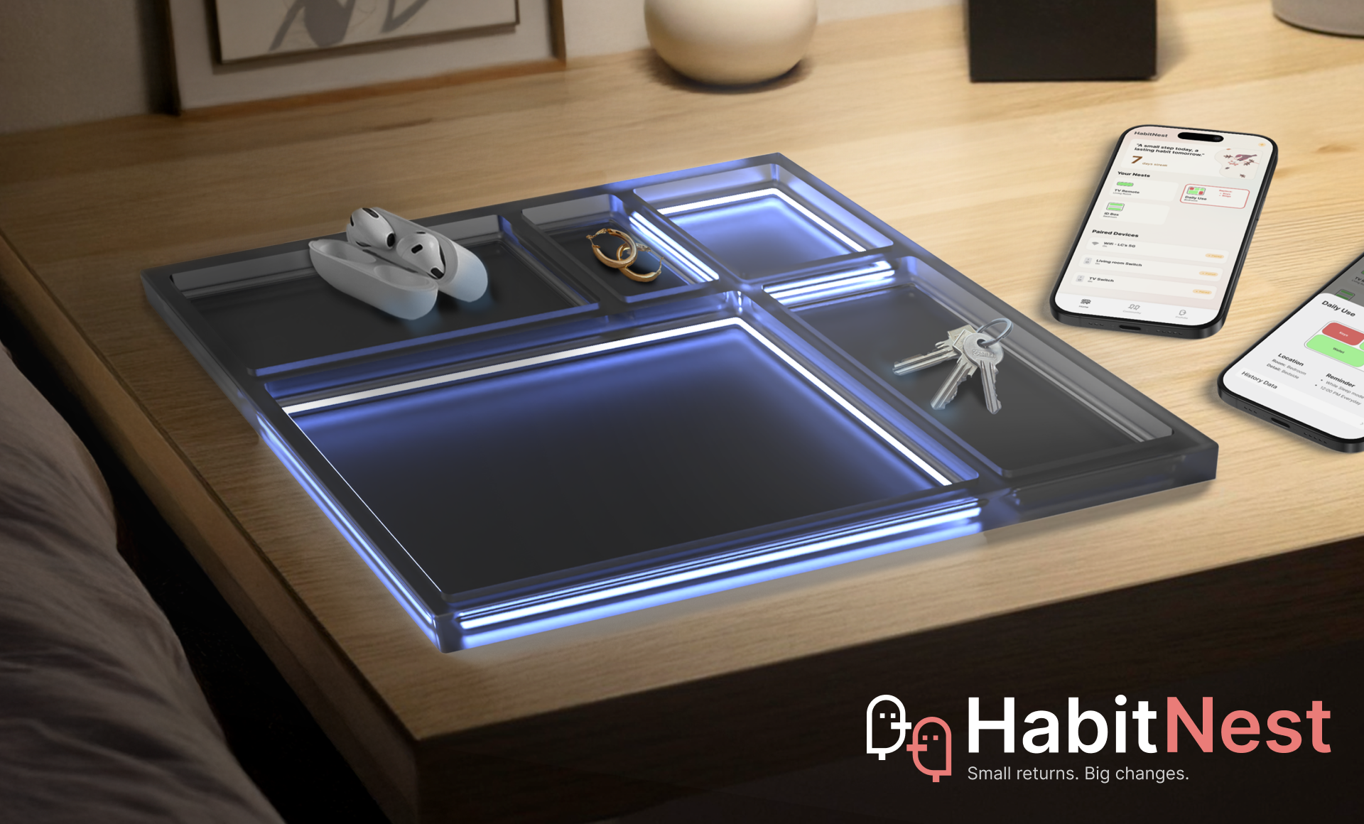 The smart organizing system HabitNest emerged from multiple research methods to solve the real root problem of daily clutter by guiding users to develop the habit of returning items instead of locating lost items. The HabitNest system unites a tray with smart lighting features, home automation capabilities, and mobile application connectivity to lead users through their daily return activities with a focus on timing and consistency and minimal effort for developing sustainable organizational habits. The system provides gentle alerts, individualized progress reports, and community support to users. HabitNest converts regular daily activities into enduring habits that users can maintain.