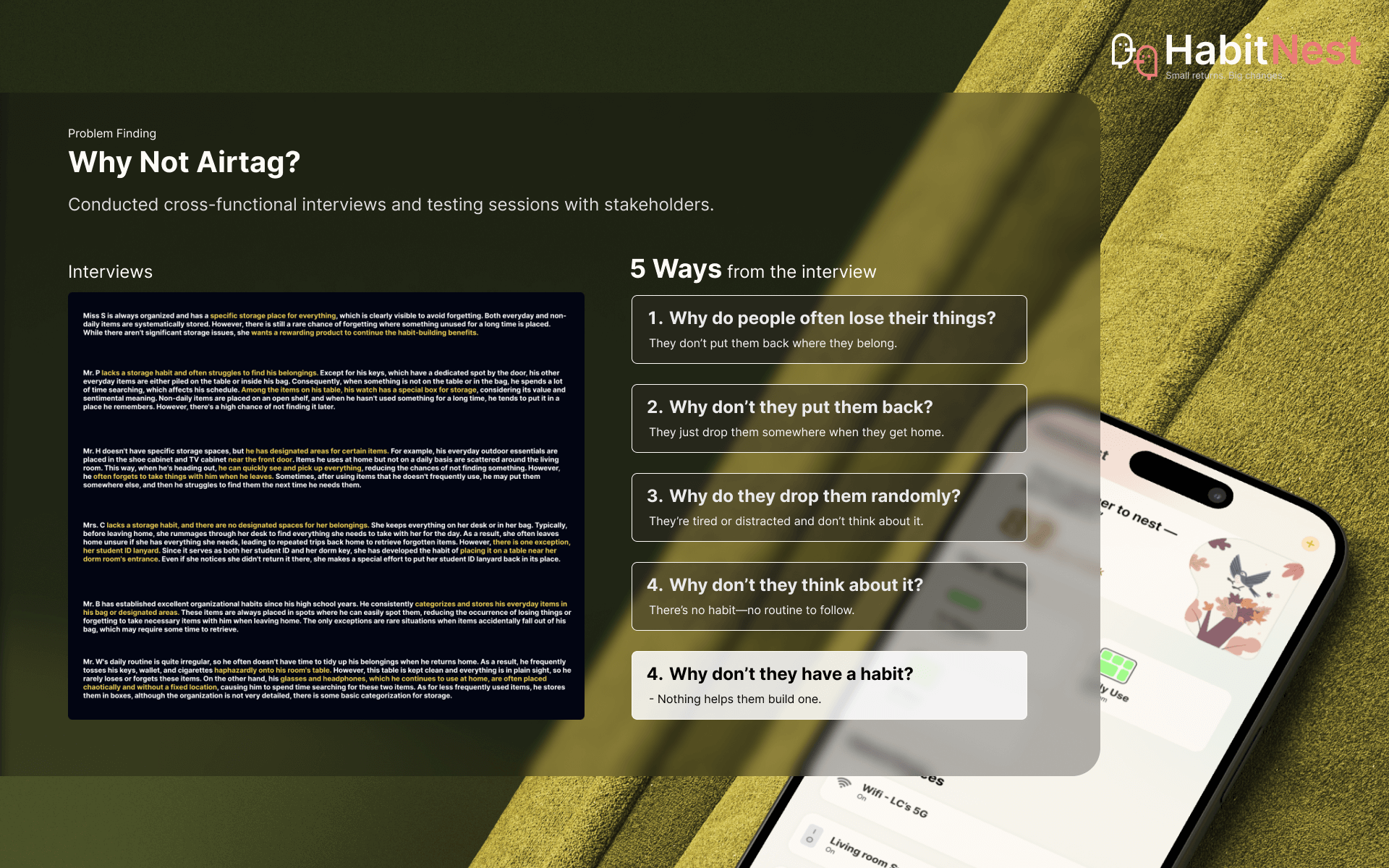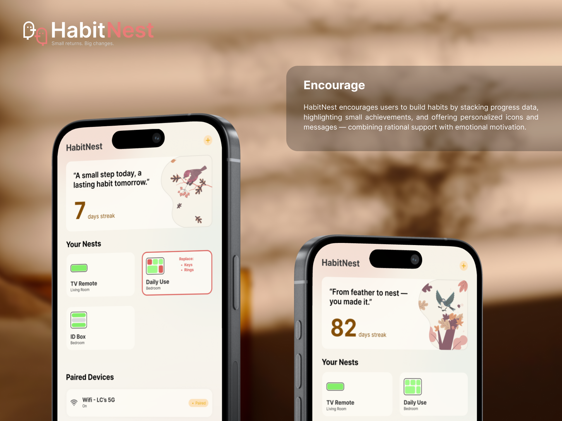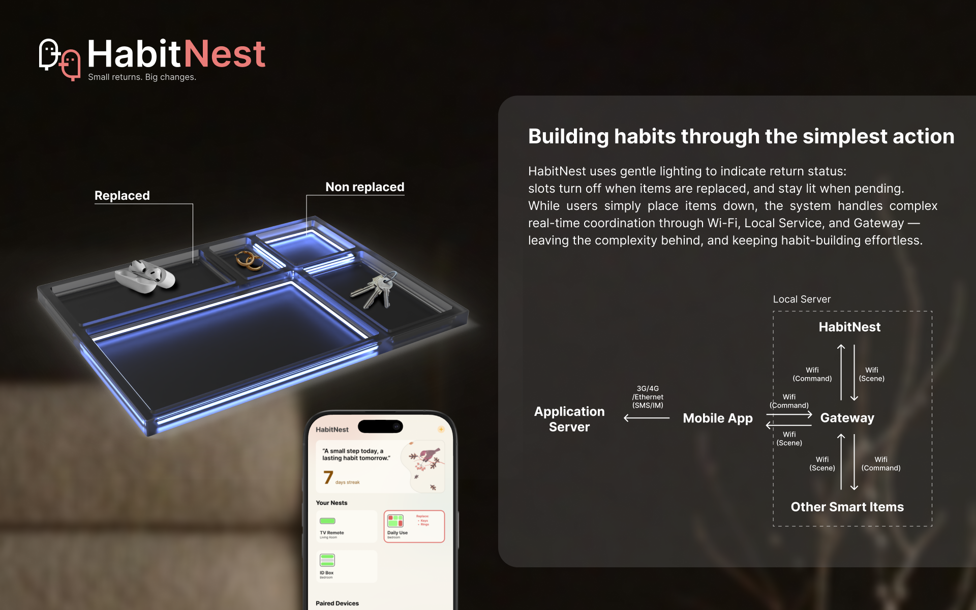 The smart organizing system HabitNest emerged from multiple research methods to solve the real root problem of daily clutter by guiding users to develop the habit of returning items instead of locating lost items. The HabitNest system unites a tray with smart lighting features, home automation capabilities, and mobile application connectivity to lead users through their daily return activities with a focus on timing and consistency and minimal effort for developing sustainable organizational habits. The system provides gentle alerts, individualized progress reports, and community support to users. HabitNest converts regular daily activities into enduring habits that users can maintain.