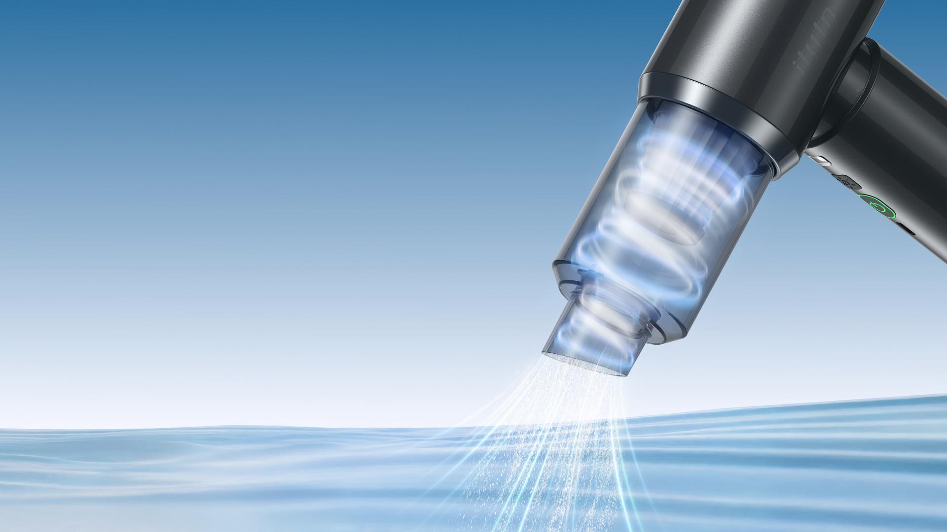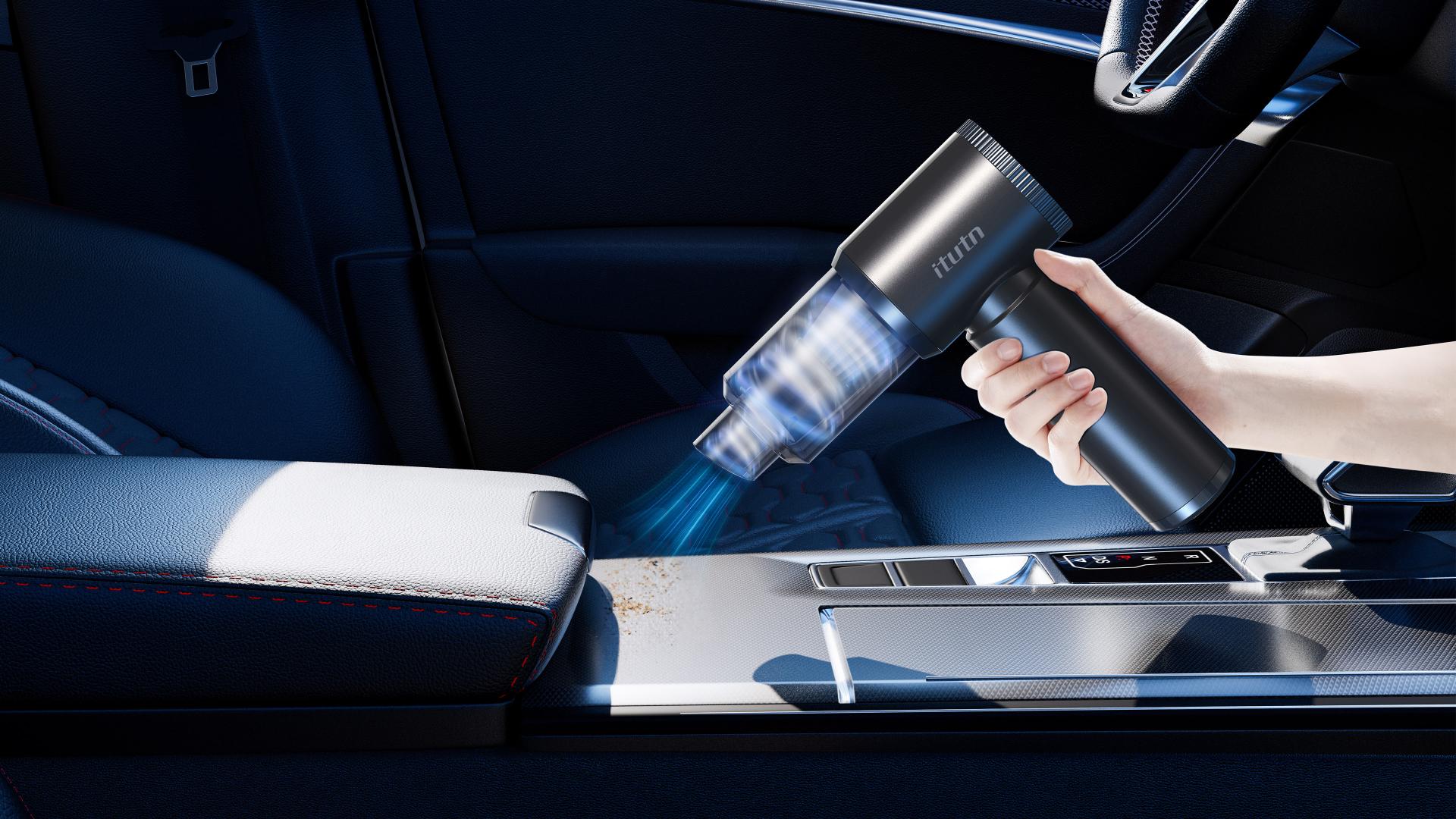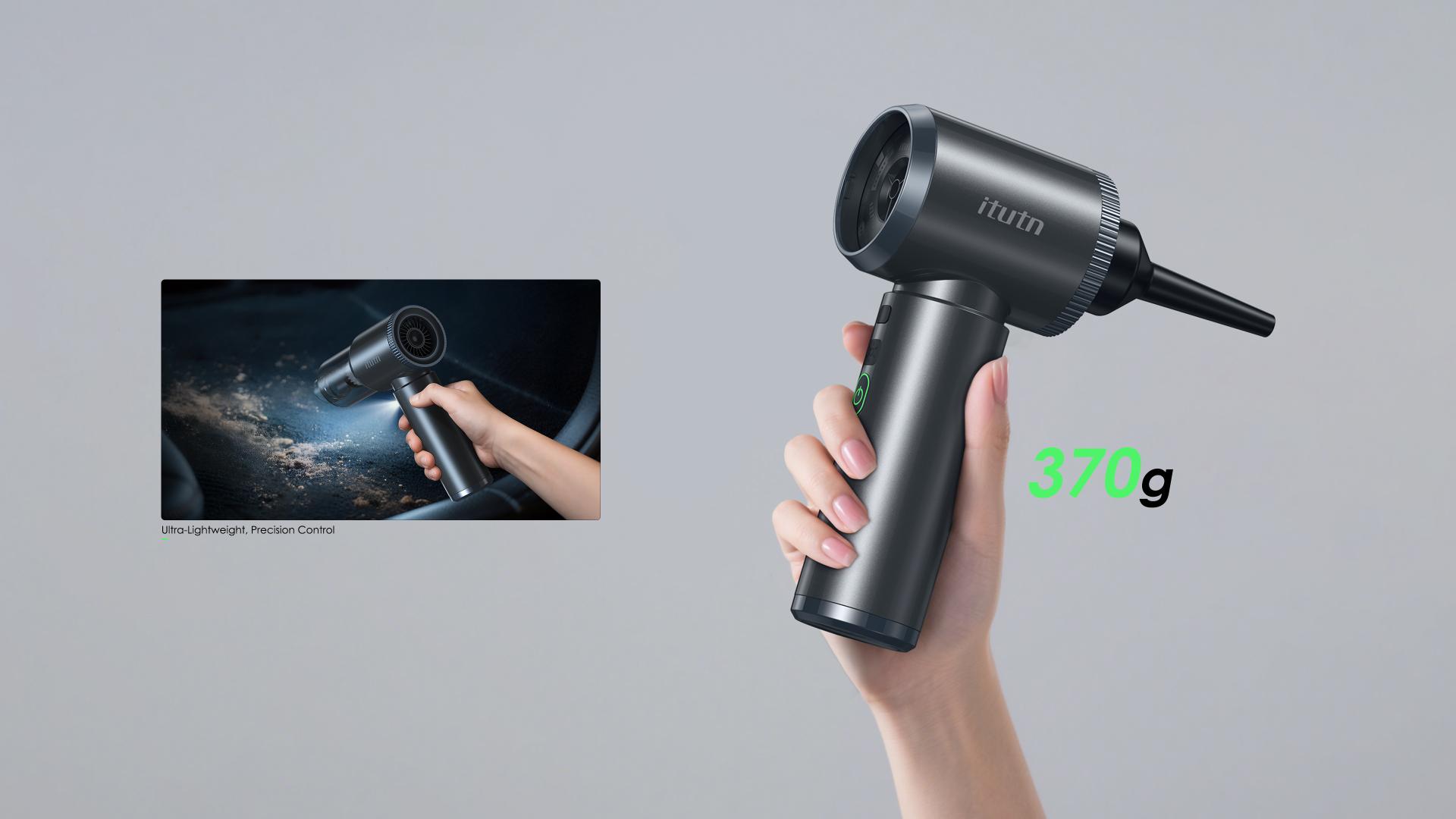 Traditional in-car vacuum cleaners are often limited by their bulky size and inconvenient operation, restricting their usage scenarios. This product draws inspiration from a T-shaped hair dryer, optimizing motor airflow to improve heat dissipation efficiency. It also repurposes exhaust airflow for a blowing function, creating an innovative cleaning mode that integrates suction and blowing. This breaks away from the single-function design of traditional vacuum cleaners, offering users a more convenient and efficient cleaning experience. From an ergonomic perspective, this product weighs only 370g, making one-handed operation effortless. The ergonomically designed grip enhances stability and prevents operational errors caused by fatigue. An independent light at the front allows for precise cleaning in low-light environments. Red and green indicator lights clearly show different power levels, making operation intuitive and straightforward, further enhancing user interaction. With a variety of nozzle attachments, this product handles multiple scenarios: the slim nozzle reaches precisely into seat crevices for efficient dust extraction; the vacuum sealing nozzle compresses down jackets for travel or home storage; the blowing function works perfectly for keyboard cleaning or helping start fires while camping outdoors; and the inflation function conveniently fills items like inflatable beds and swimming rings. For eco-compatibility, this product uses recyclable plastic and water-based eco-friendly paint to reduce environmental impact during manufacturing. The black body paired with UV-coated decorative rings presents a sleek, refined appearance while enhancing durability. The laser-textured design on the side adds visual depth and serves as an anti-counterfeiting measure, ensuring distinctive brand recognition. The design language of this product focuses on minimalist yet tech-savvy aesthetics. The T-shaped structure and gradient laser texture create a strong visual flow and distinctiveness, expressing both aesthetic appeal and unique product characteristics. By integrating five functions—vacuuming, vacuum sealing, blowing, inflating, and lighting—this product truly overcomes the functional limitations of traditional in-car vacuum cleaners, offering a comprehensive solution for various scenarios.