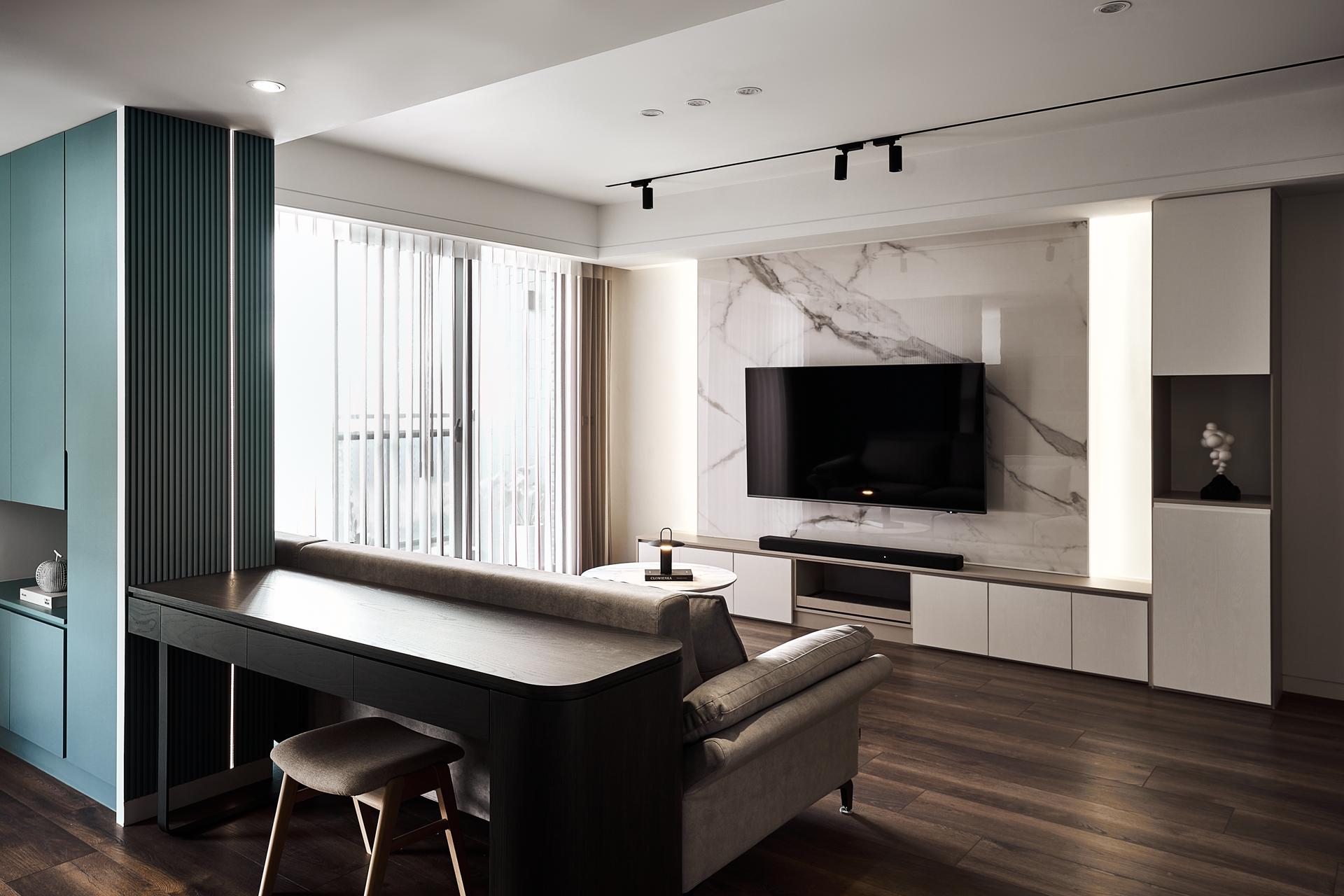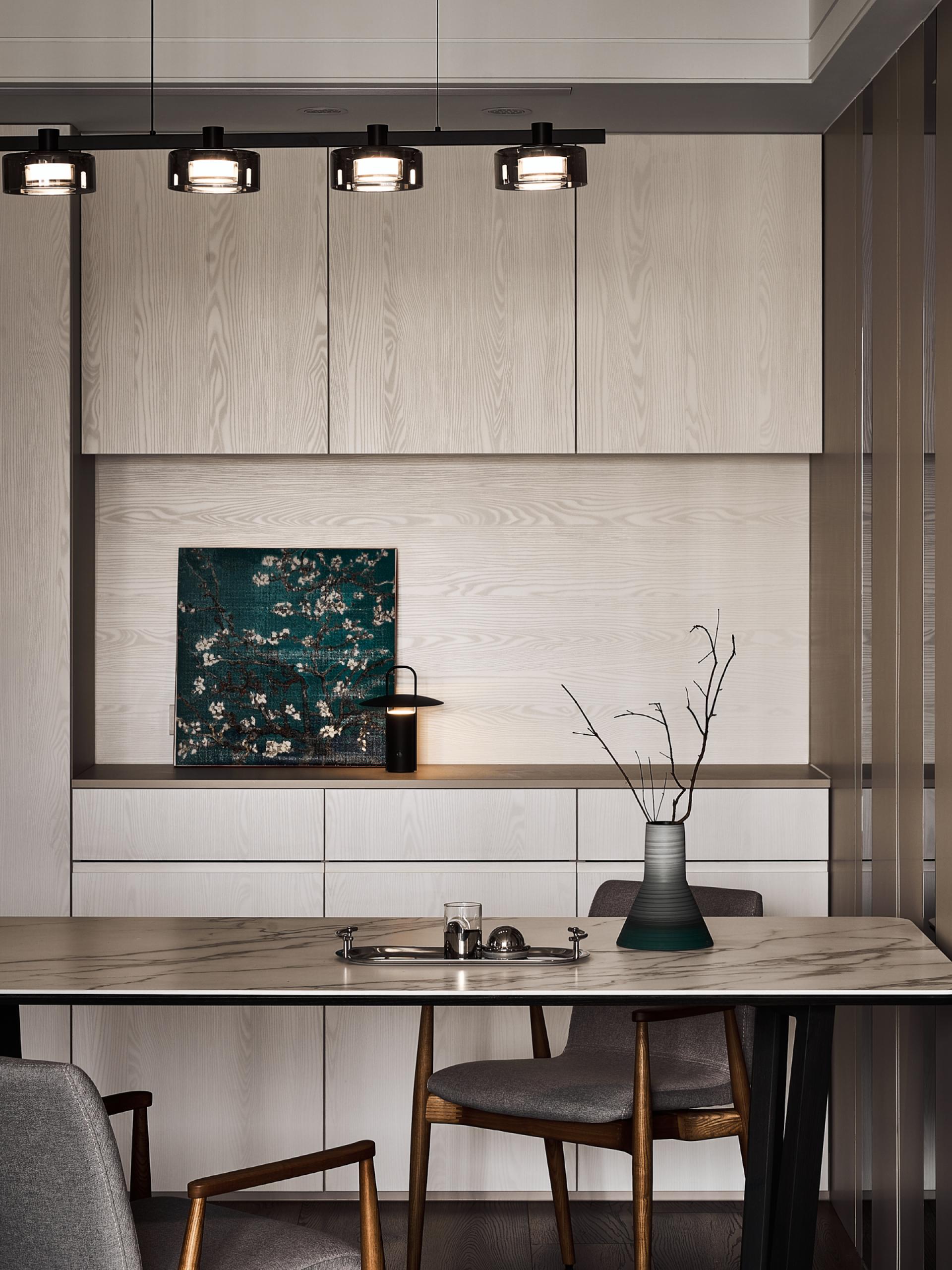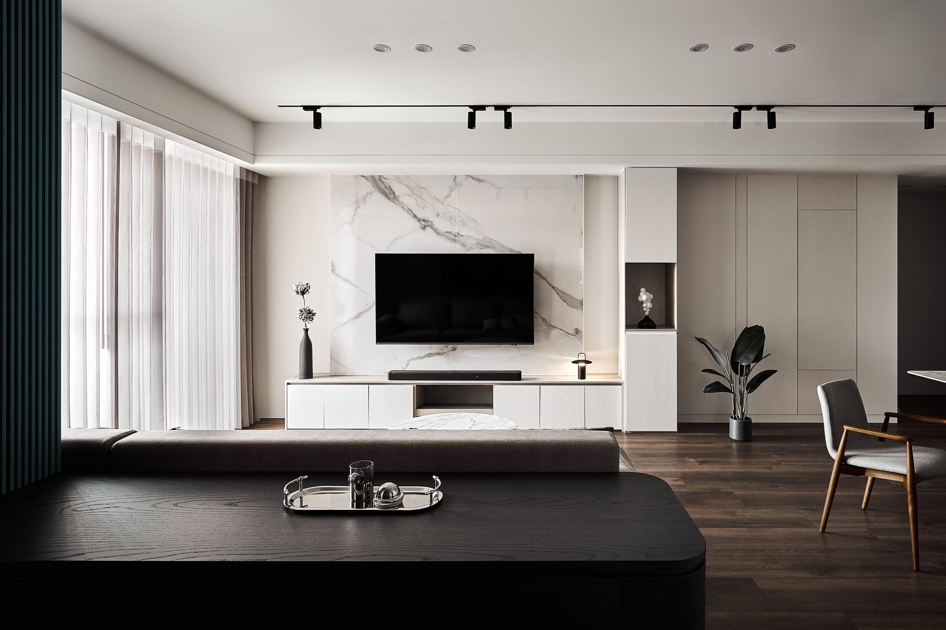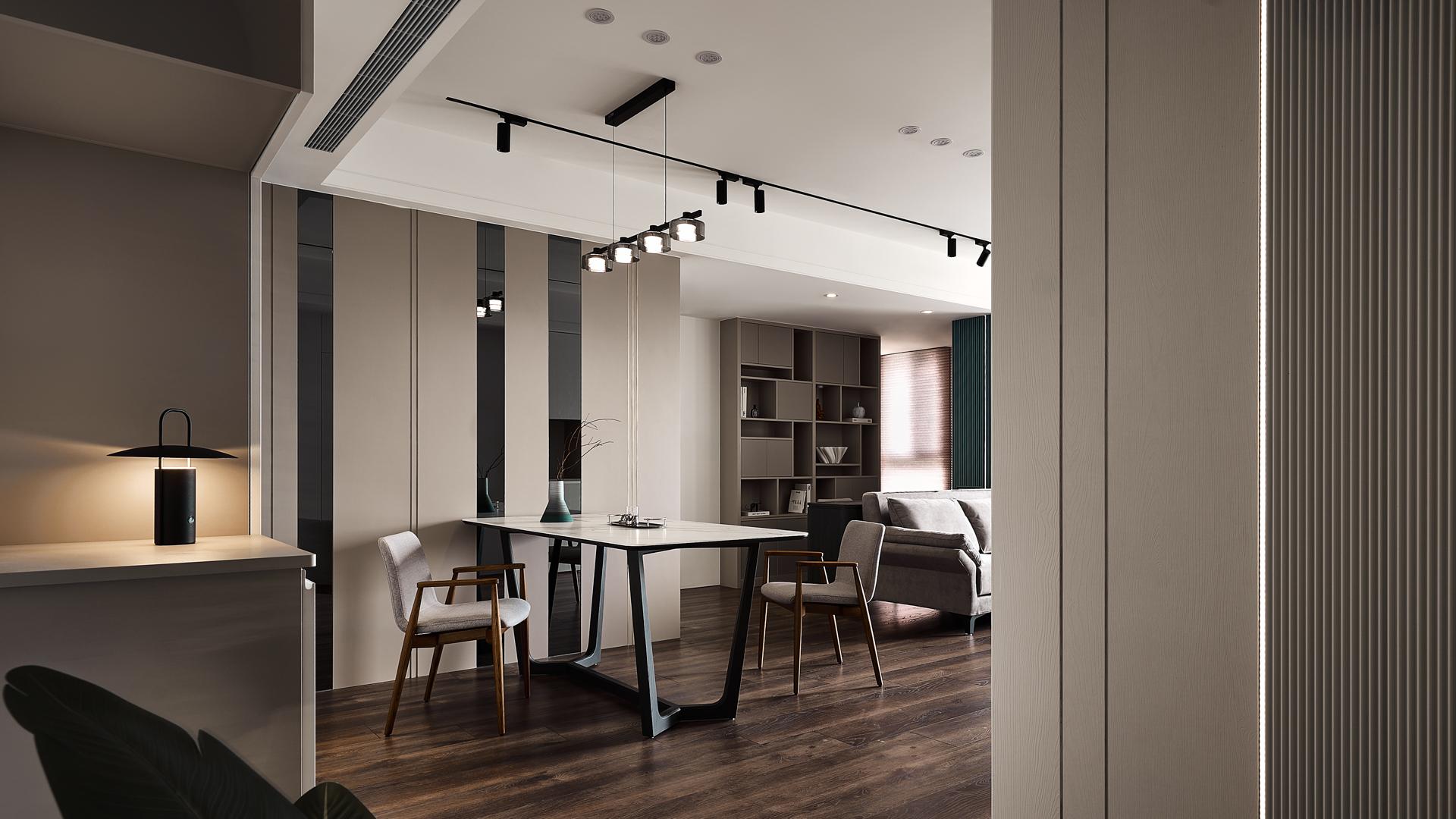 Soft furnishings are curated with a focus on layered serenity. A palette of gray, beige, black, and deep green blends with clean-lined furniture and refined wooden accents, creating a tactile, emotional resonance. Lighting is delivered via a magnetic track system, blending minimalism with flexibility for evolving living needs.