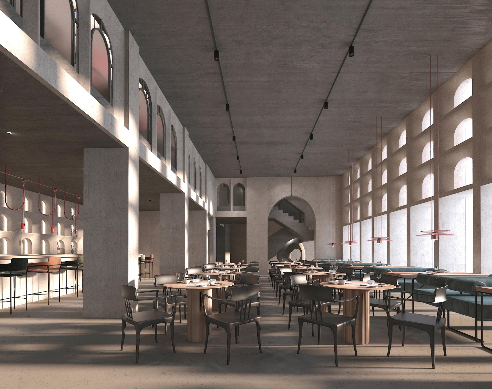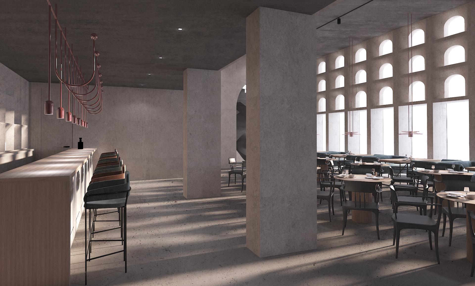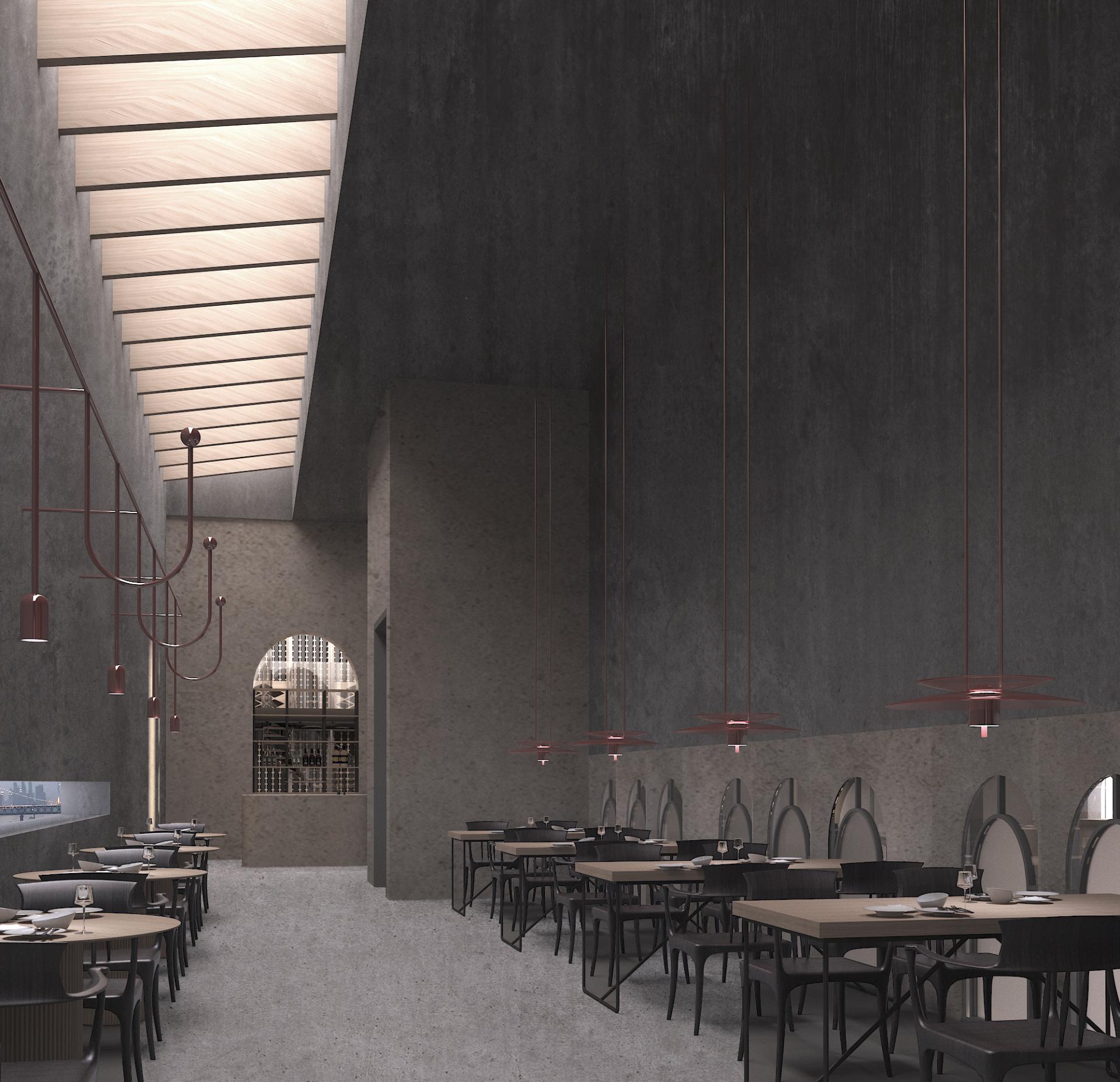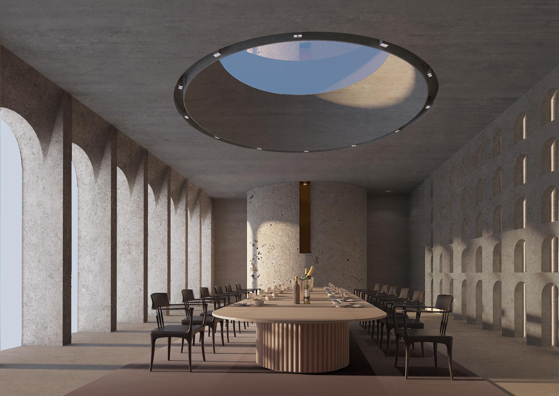 A central metaphor is the shadow of the arch. Referencing ancient Roman structures like the Colosseum, the space captures the movement of natural light, casting dynamic arch-shaped shadows that shift throughout the day. These fleeting forms quietly narrate the passage of time, connecting diners to history through a choreography of light and shadow. It is through this ephemeral performance that the past and present softly merge.