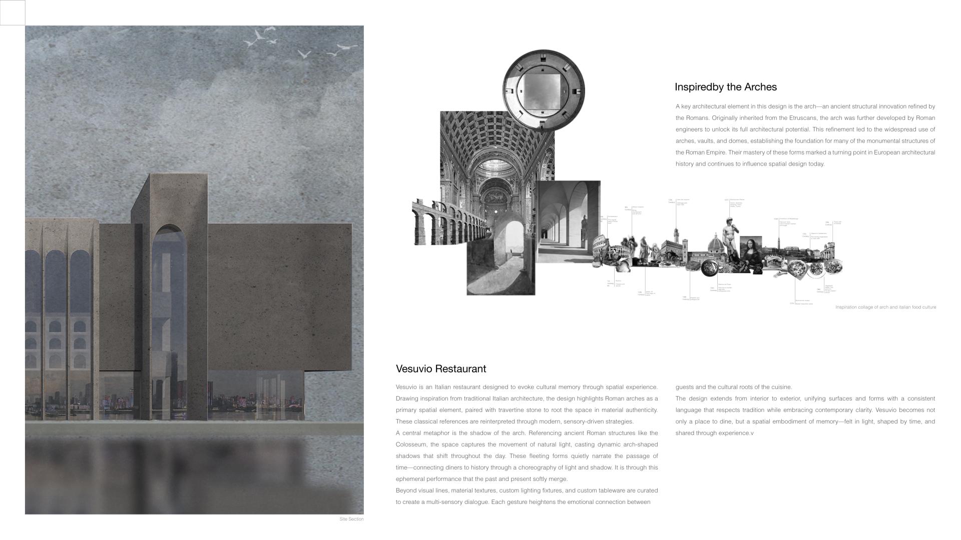 Vesuvio is an Italian restaurant designed to evoke cultural memory through spatial experience. Drawing inspiration from traditional Italian architecture, the design highlights Roman arches as a primary spatial element, paired with travertine stone to root the space in material authenticity. These classical references are reinterpreted through modern, sensory-driven strategies.