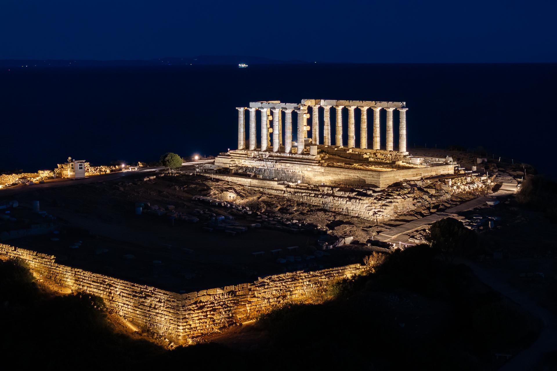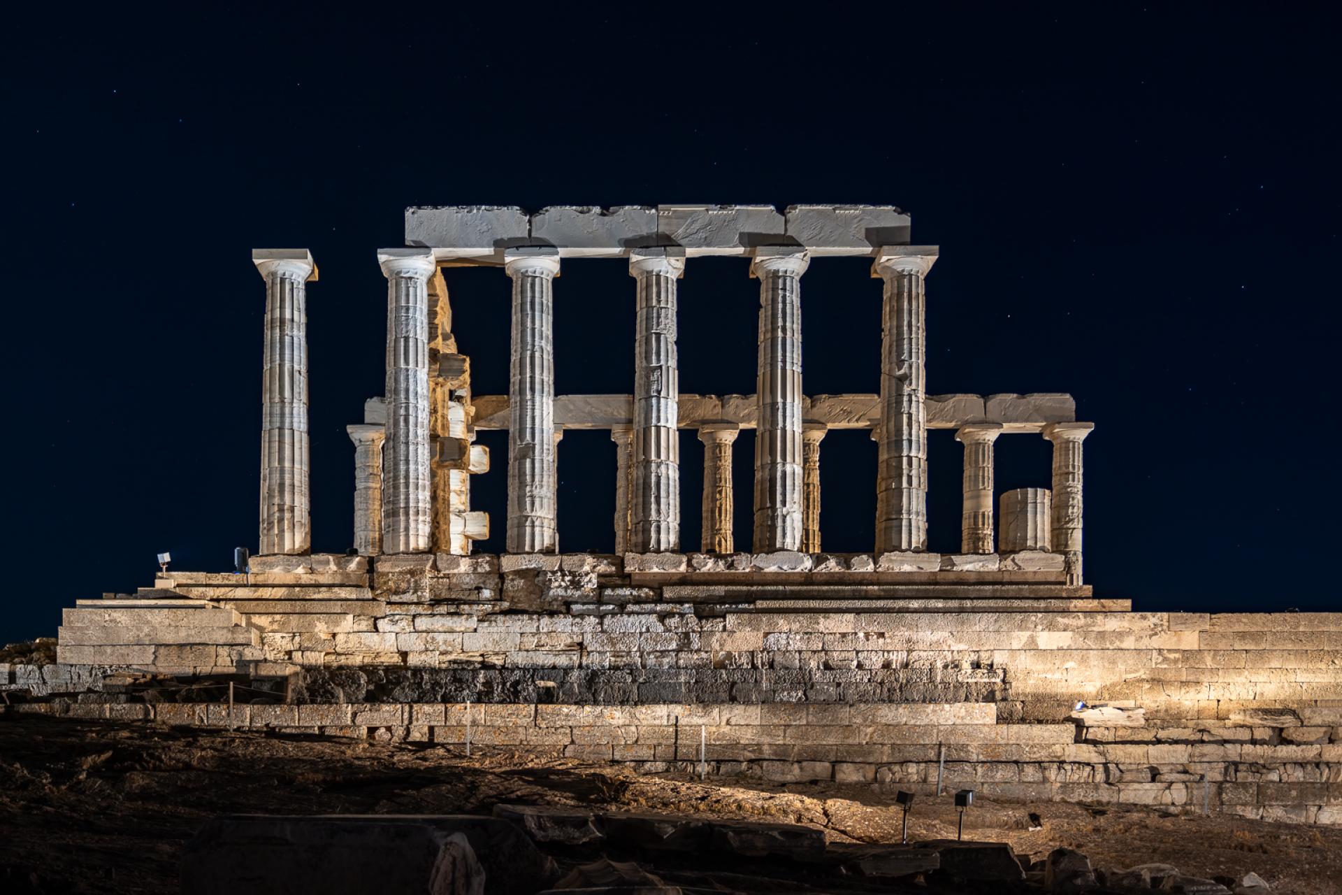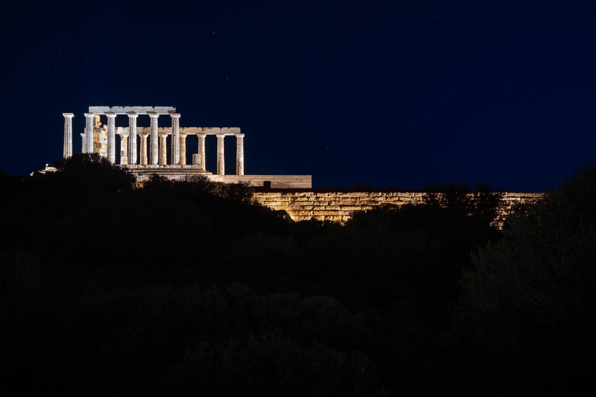 The new lighting of the Temple of Poseidon at Sounion breathes life into the monument, honoring its timeless presence and respecting its historical significance. The Temple of Poseidon is located on the cliffs of Cape Sounion and it is mainly visible from the northwest direction as one approaches from the coastal road and from the surrounding sea. This characteristic determined our lighting design as it was crucial the light intensity to be at a relatively “higher” level in order to be seen from such a distance. Warmer tones of white light (2700K) are chosen to embrace the fortification wall, while cooler white light (3600K) illuminates the columns of the temple from the outside and warmer in the inside. The base of the temple is lit by neutral temperature (3000K). In this way, the Fortification Wall, the sanctuary and the base are distinguished even from a distance. An astronomical clock is used for the illumination and light goes on as the sun sets, while at sunrise it turns off. The lighting fixtures were chosen for their characteristics as well as their size and shape in order to be well integrated into the landscape so that day visitors are not distracted. Compared to the preexisting electrical system which lit only few columns, not the walls or the base, our lighting gave a more complete night view of the monument . The lighting system is energy-efficient aligning with contemporary sustainability practices. Specifically, it includes 38 lights, totaling 1740W. Our approach prioritizes minimal environmental impact and is in accordance with the archaeological rules and restrictions for such monuments. Moreover the luminaires are placed with care so as not to touch the monument while cabling is hidden as much as possible so not to disturb the daytime view of the archaeological site.