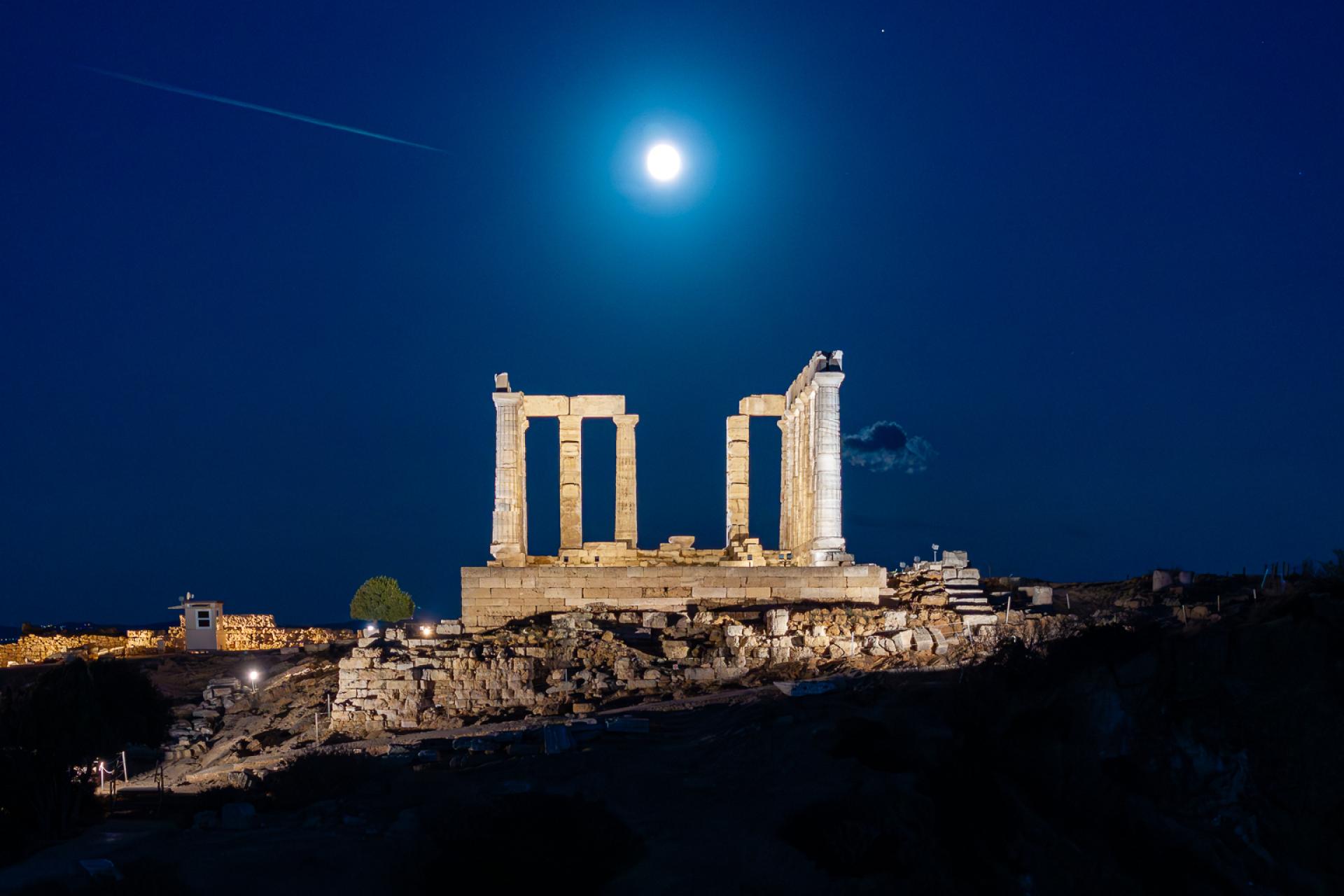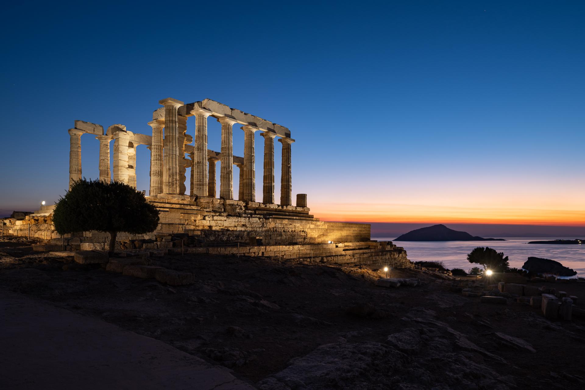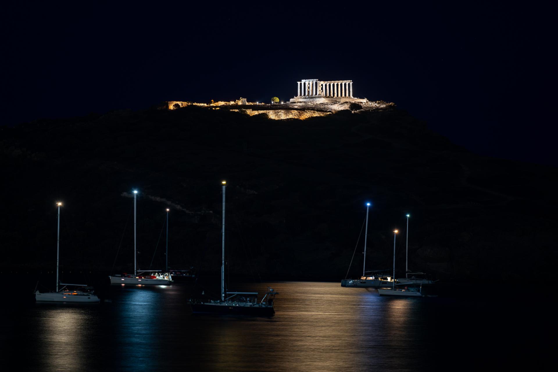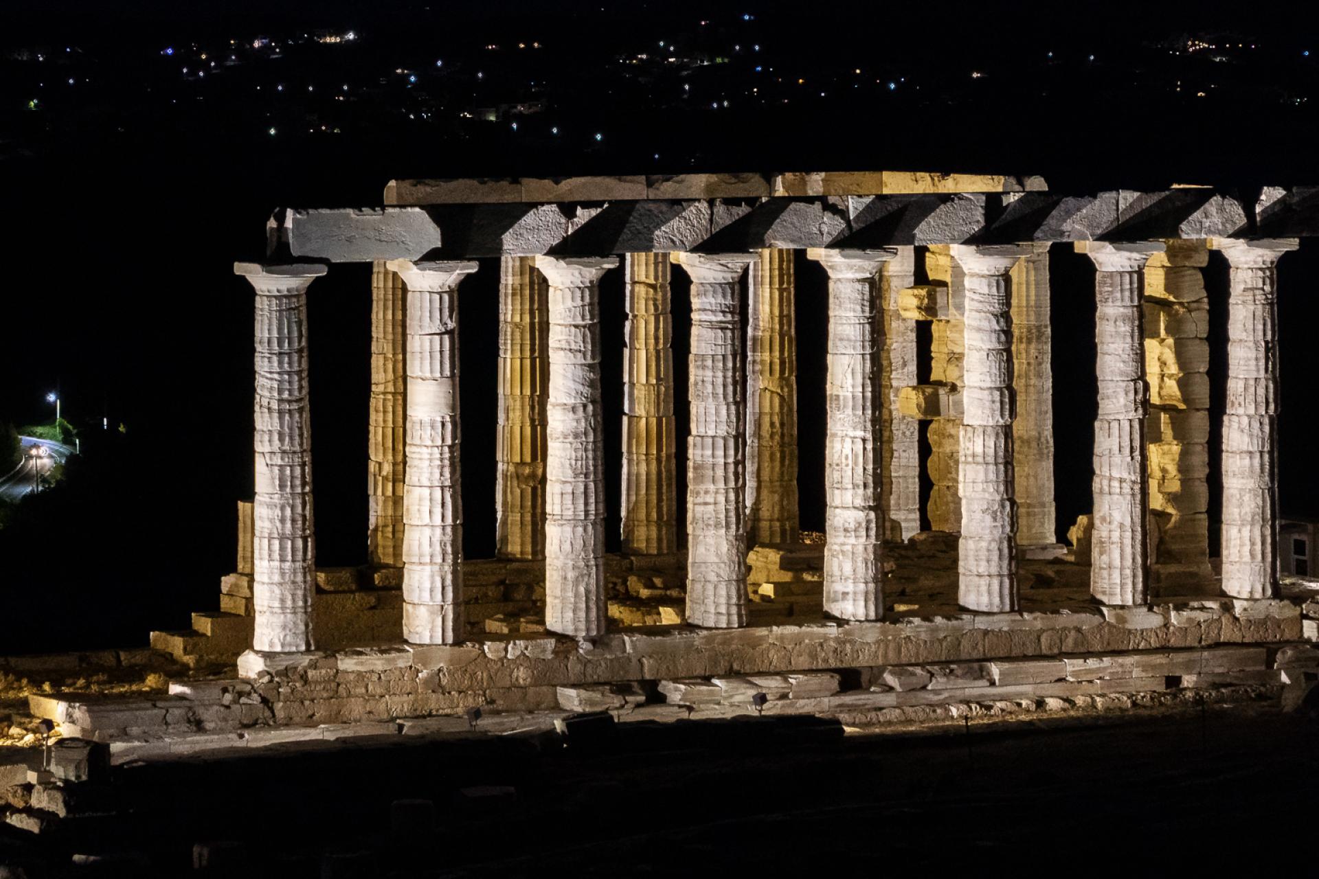 The new lighting of the Temple of Poseidon at Sounion breathes life into the monument, honoring its timeless presence and respecting its historical significance. The Temple of Poseidon is located on the cliffs of Cape Sounion and it is mainly visible from the northwest direction as one approaches from the coastal road and from the surrounding sea. This characteristic determined our lighting design as it was crucial the light intensity to be at a relatively “higher” level in order to be seen from such a distance. Warmer tones of white light (2700K) are chosen to embrace the fortification wall, while cooler white light (3600K) illuminates the columns of the temple from the outside and warmer in the inside. The base of the temple is lit by neutral temperature (3000K). In this way, the Fortification Wall, the sanctuary and the base are distinguished even from a distance. An astronomical clock is used for the illumination and light goes on as the sun sets, while at sunrise it turns off. The lighting fixtures were chosen for their characteristics as well as their size and shape in order to be well integrated into the landscape so that day visitors are not distracted. Compared to the preexisting electrical system which lit only few columns, not the walls or the base, our lighting gave a more complete night view of the monument . The lighting system is energy-efficient aligning with contemporary sustainability practices. Specifically, it includes 38 lights, totaling 1740W. Our approach prioritizes minimal environmental impact and is in accordance with the archaeological rules and restrictions for such monuments. Moreover the luminaires are placed with care so as not to touch the monument while cabling is hidden as much as possible so not to disturb the daytime view of the archaeological site.