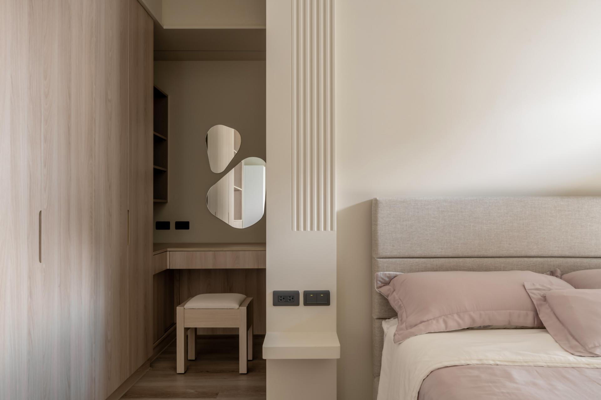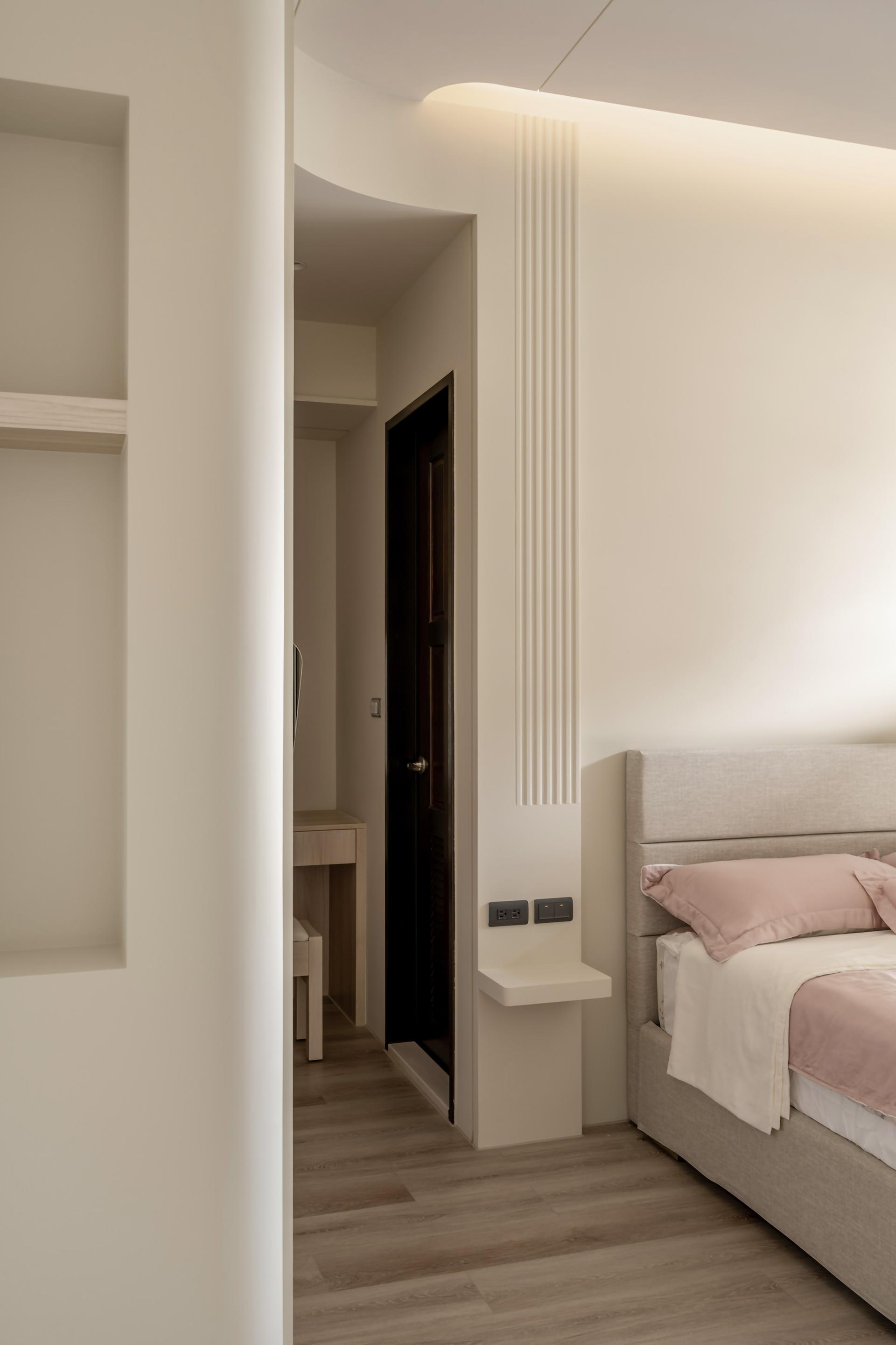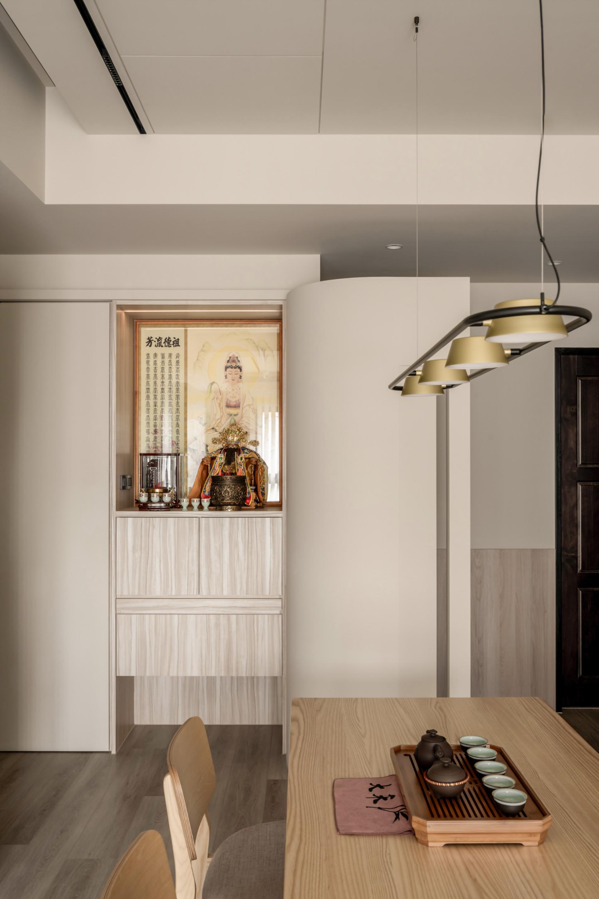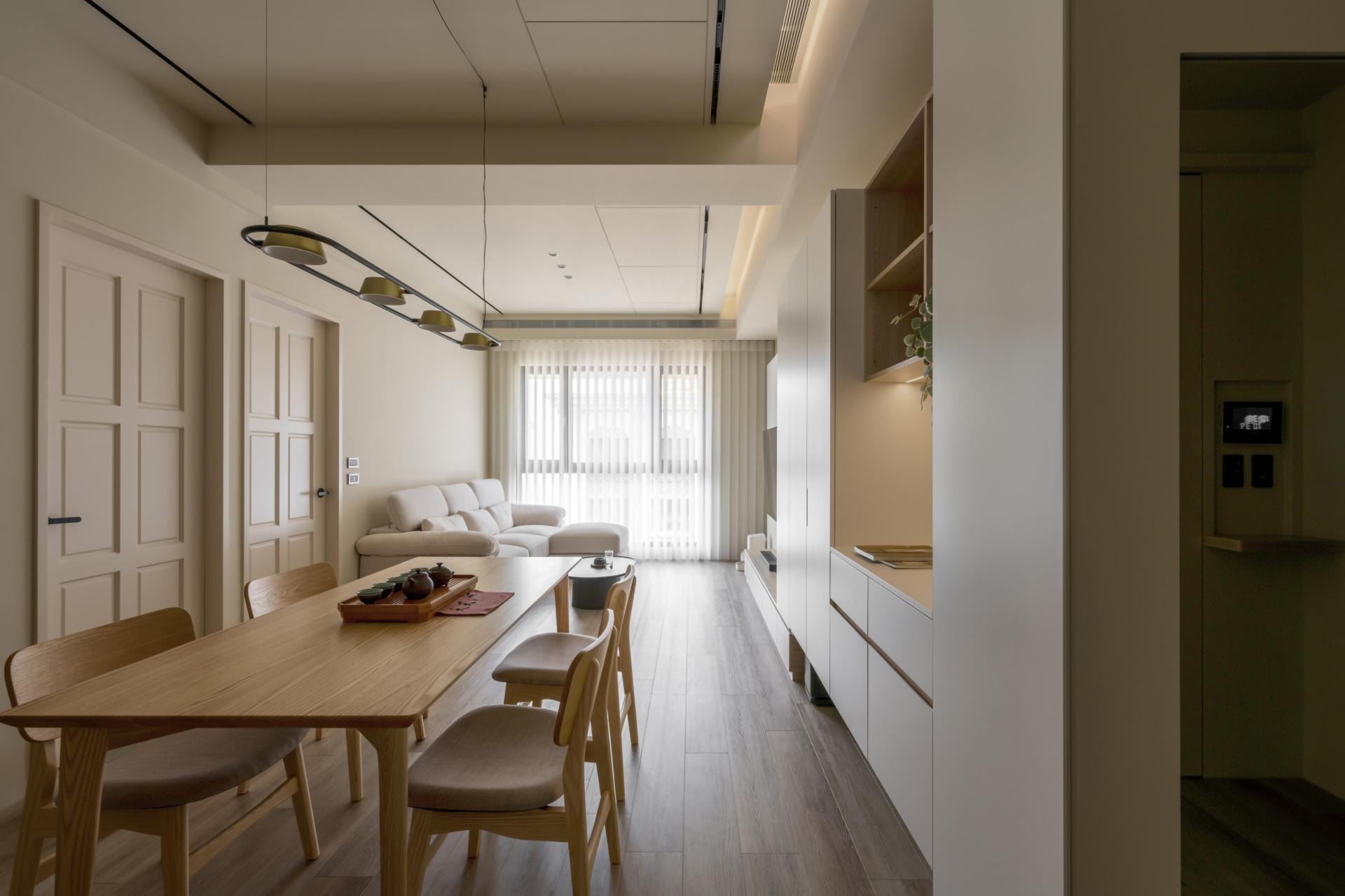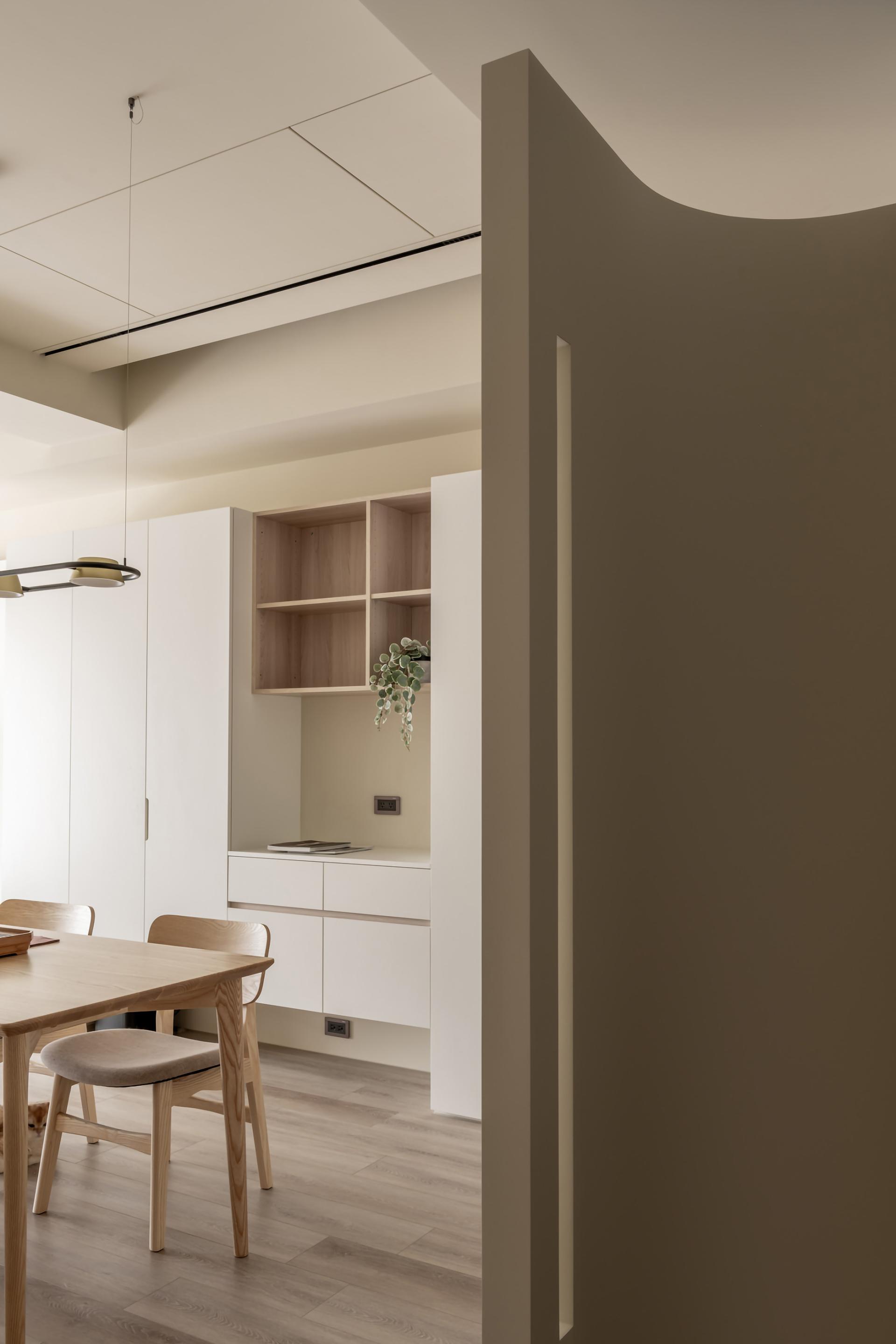 The design of this case is inspired by the owner's love for tea culture, as well as the life needs of friends and relatives gathering. The design team uses soft tea color as the main tone, through the curved design core, with feng shui layout considerations, and ragged ceiling placement techniques, to abandon redundant decoration, and return to the basic construction method, presenting a quiet Japanese aesthetic.